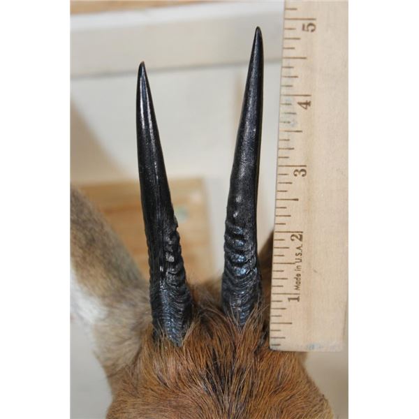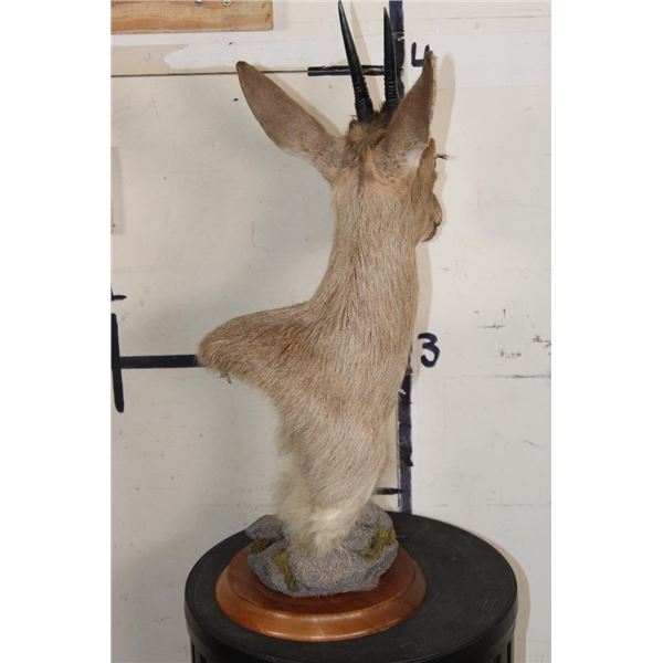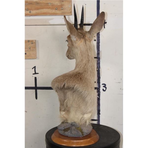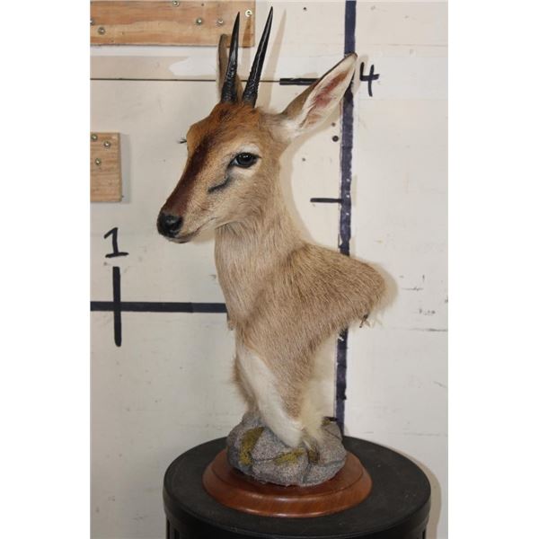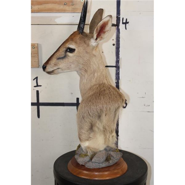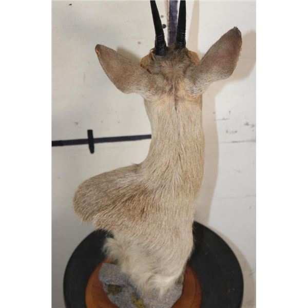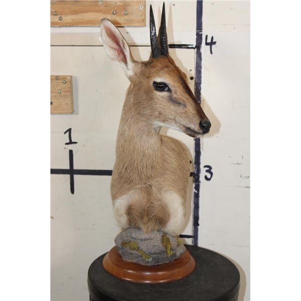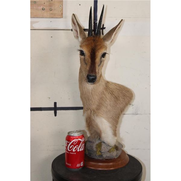 Very Nice COMMON DUIKER Pedestal Mount on a Round Wooden Base. The Total Mount measures 22" Tall x 8" Wide. It is in Very Good Condition. The Next Lot is the matching Steenbok. TAXIDERMY