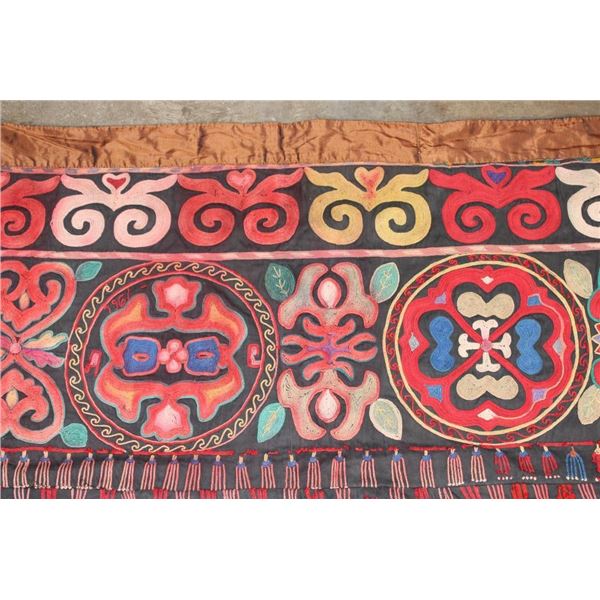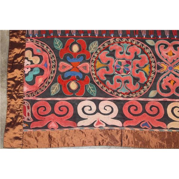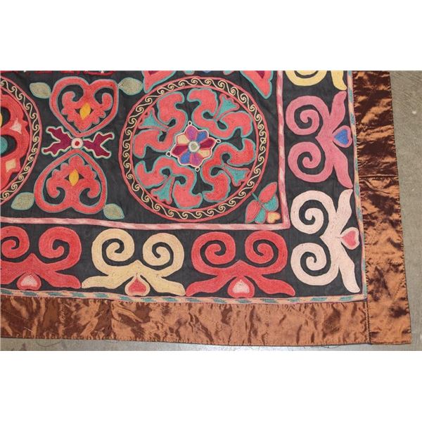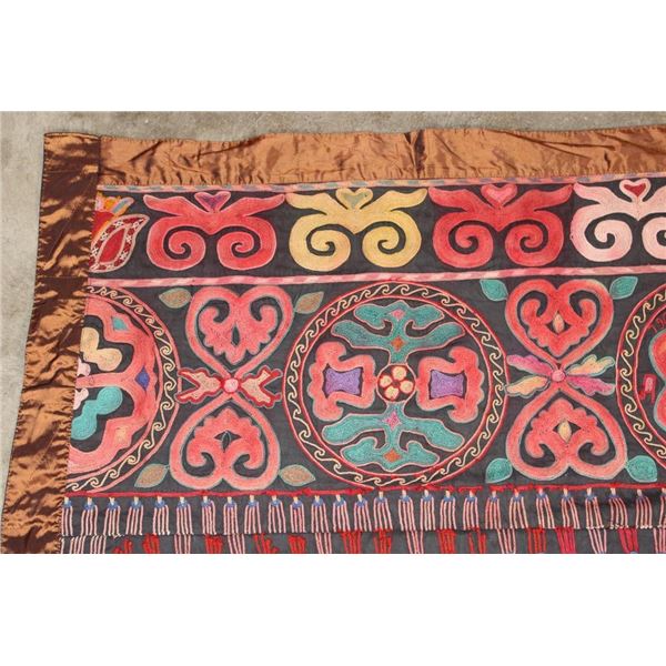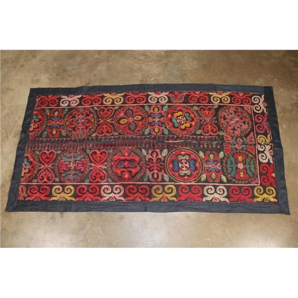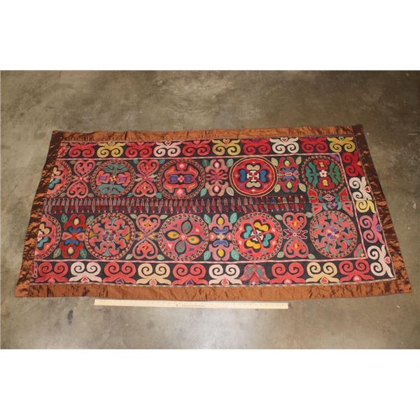 Beautiful embroidered Suzani Tapestry. It measures 75" Long x 35.5" Wide. Suzanis are a decorative tribal textile made in Tajikistan, Uzbekistan, Afghanistan and other Central Asian countries. Suzanis were traditionally made by Central Asian brides as part of their dowry, and were presented to the groom on the wedding day. COLLECTIBLE ASIAN TEXTILES