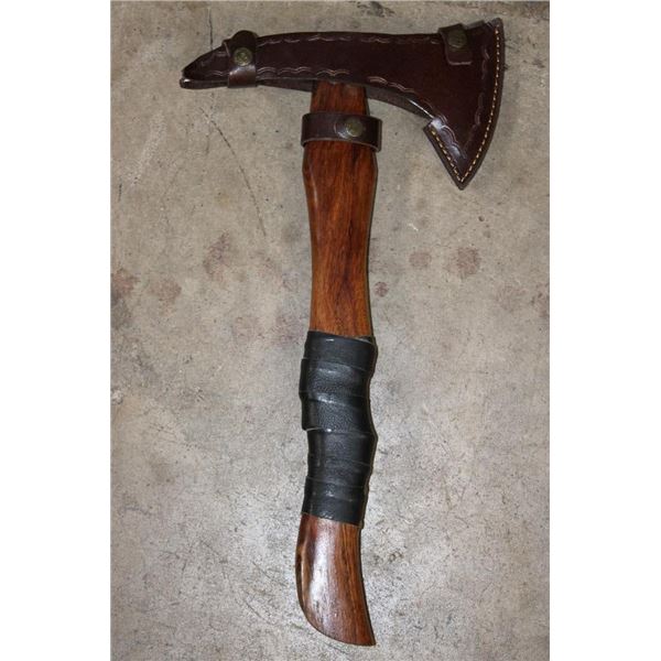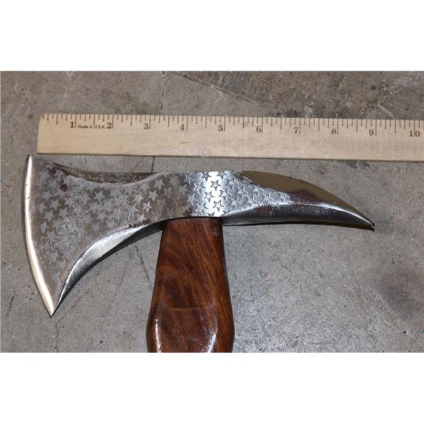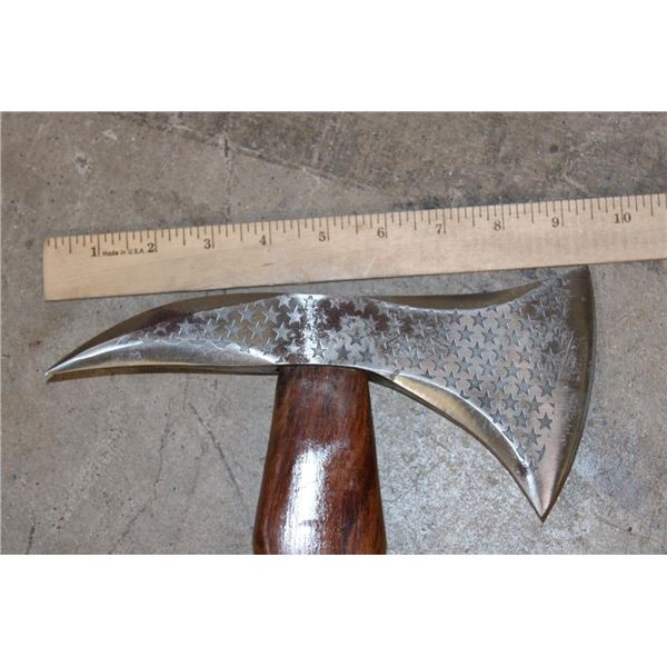 Contemporary Viking Battle AXE or Hatchet. It has a Steel Blade with a decorative Star pattern on the Blade and a Leather Sheath. The wooden handle measure 16" Long and the Total Length is 18" Long. The Blade measures 9.5" Wide x 5" Long. The Total Weight is 3 lbs. This is an excellent Axe for practical use. AXES AND MACHETES