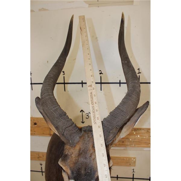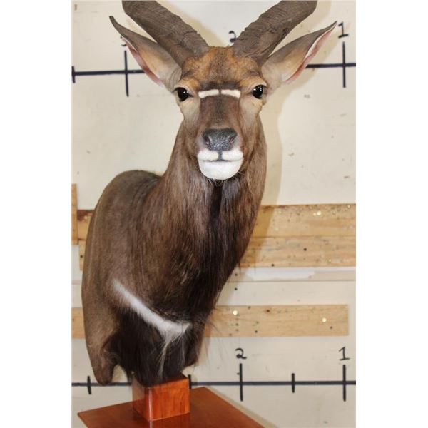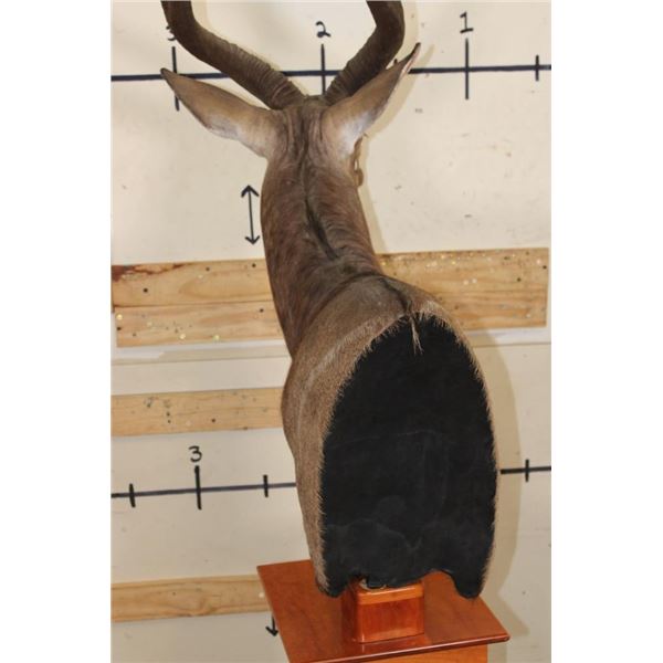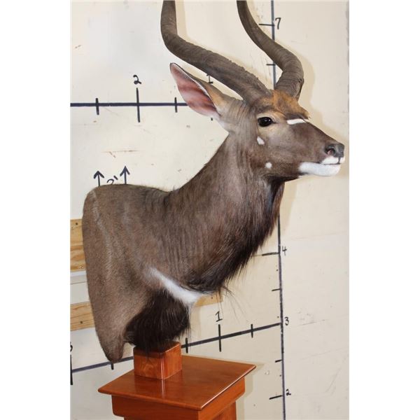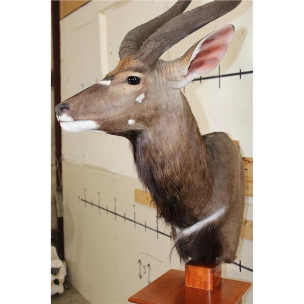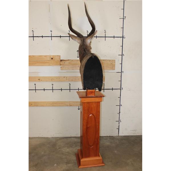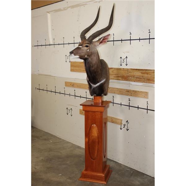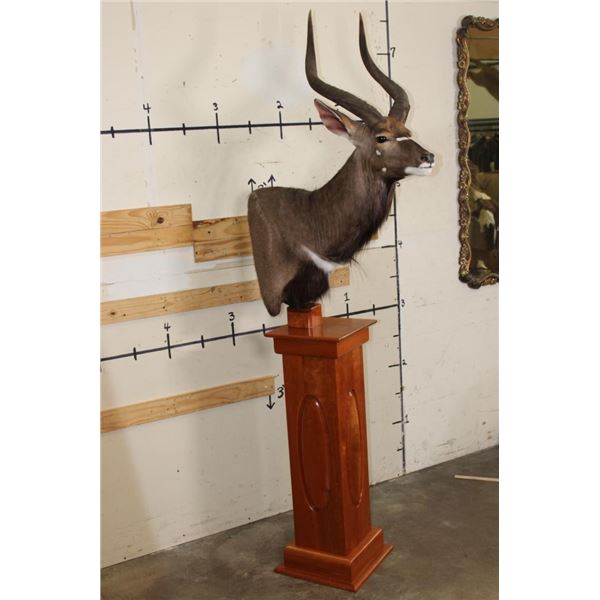 Incredible NYALA Pedestal Mount in *Like New* Condition. This is a Very High Quality mount and the Nyala is on a Cherry Wood Pedestal Base. The Left Horn measures 27.75" Long and the Right Horn measures 28" Long. The Cherry wood Pedestal Base measures 15" Long x 15" Wide x 39.5" Tall. The Total mount Height is approximately 7' 1" Tall. TAXIDERMY