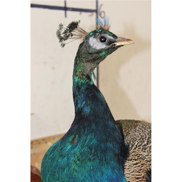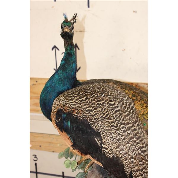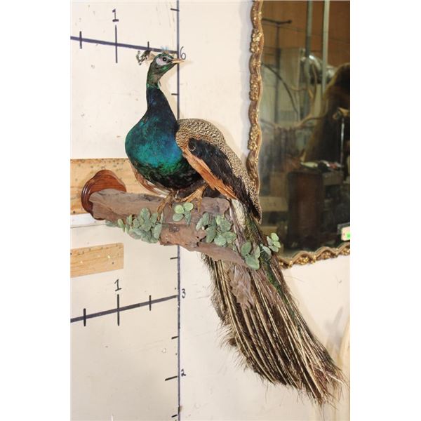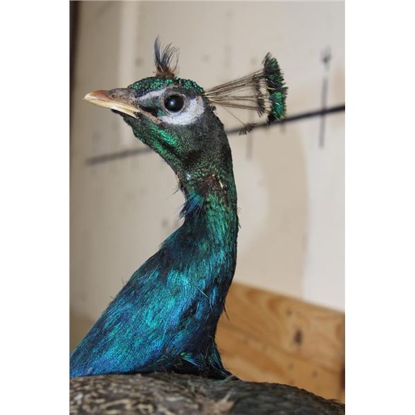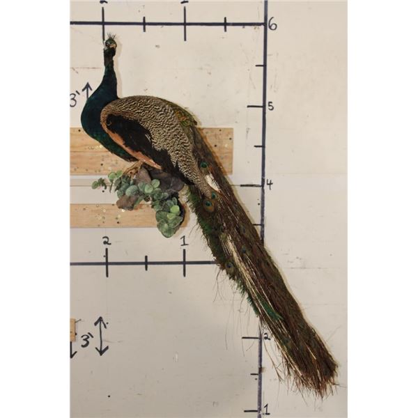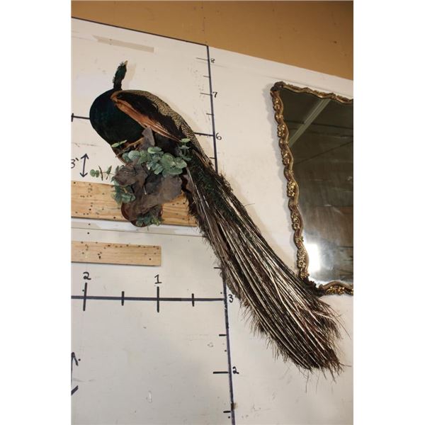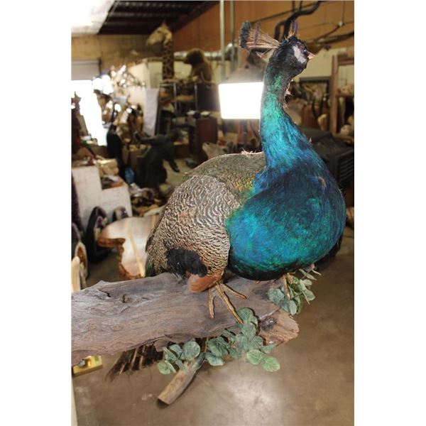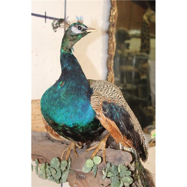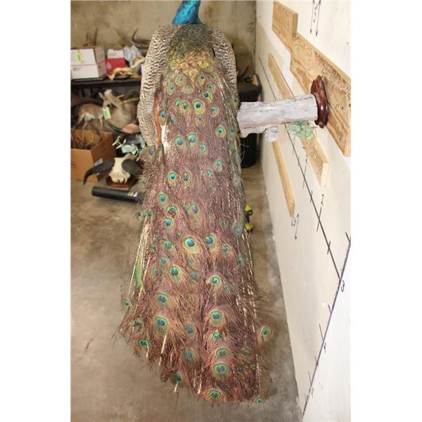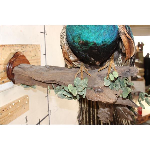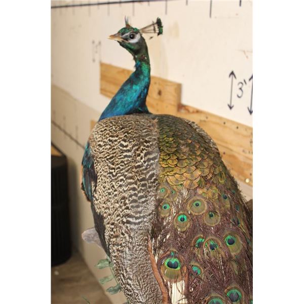 Beautiful Life-sized PEACOCK on a Driftwood Perch Wall Hanger. The Mount measures 50" Tall x 36" Wide x 27" Depth (from the wall). TAXIDERMY BIRDS