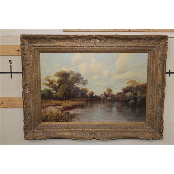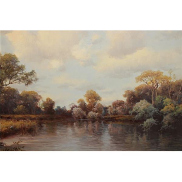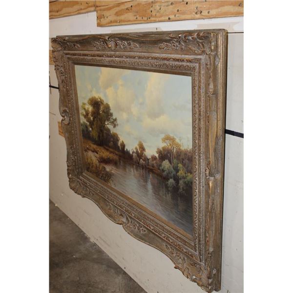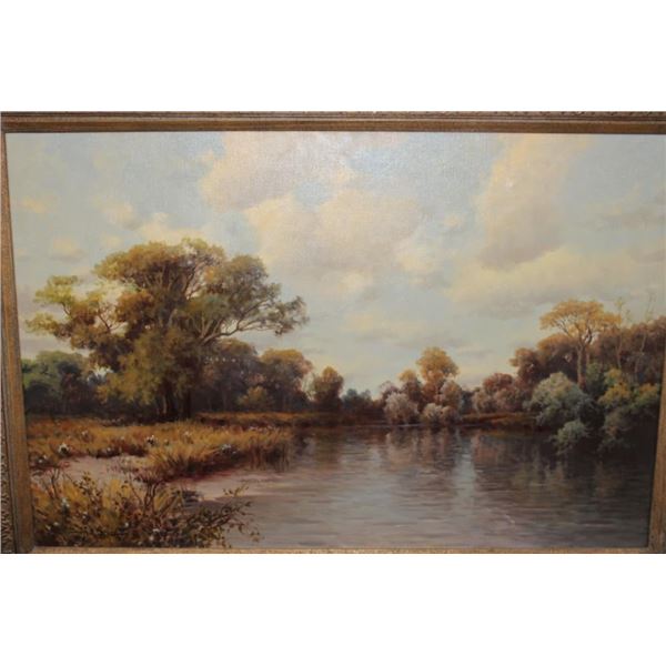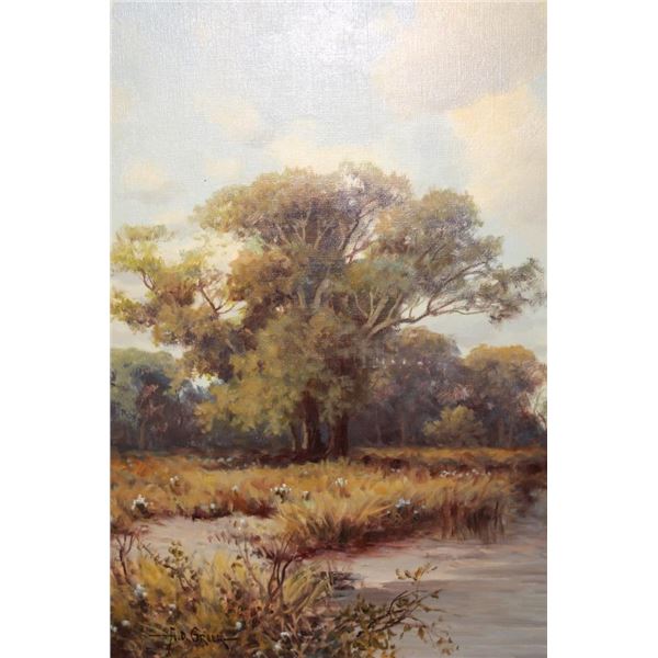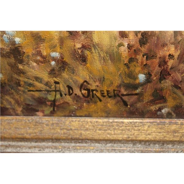A.D. Greer Original Landscape Oil Painting signed by the artist in a stunning ornate wooden frame. The Canvas measures 36" Long x 24" Tall and the Wooden Frame measures: 48" Long x 35.25"Tall. A.D. Greer (1904-1998) was a celebrated American artist known for his luminous landscape and still-life paintings. Despite being self-taught, Greer mastered the art of rendering landscapes and still lives with a remarkable level of realistic detail. Greer's profound observation of beauty and his ability to preserve it in his artwork earned him a revered status among Texas landscape painters. To learn more about the artist and see his other works, click the link below: