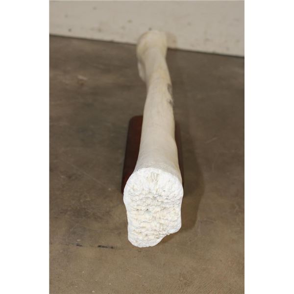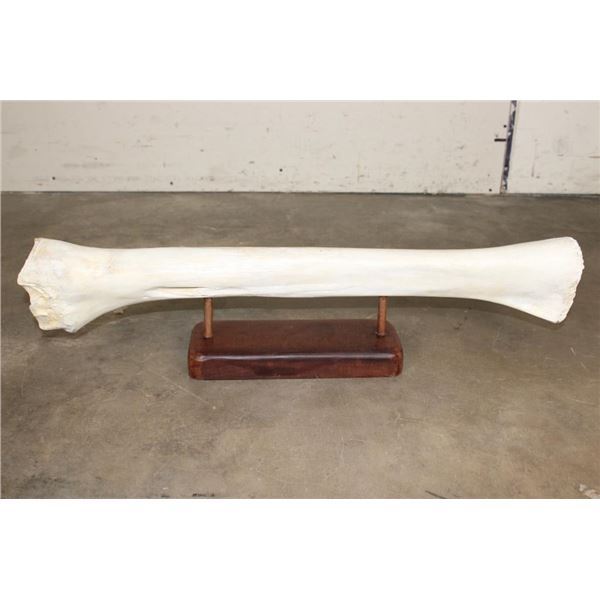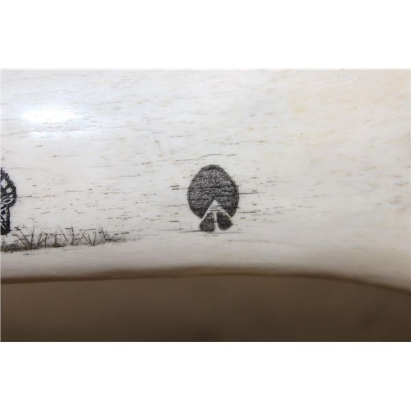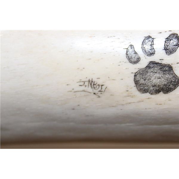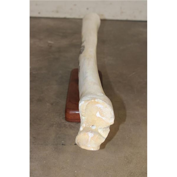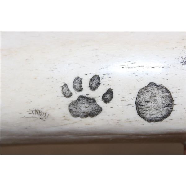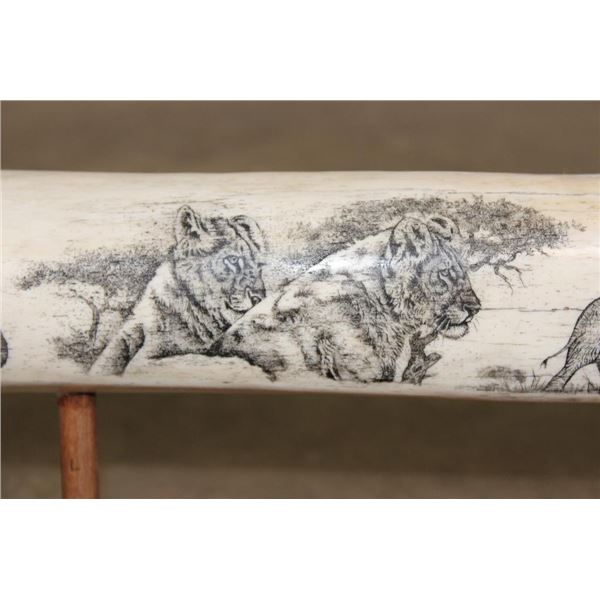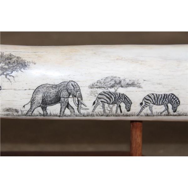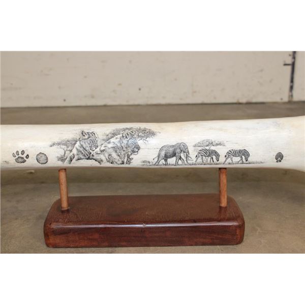 Scrimshawed or etched GIRAFFE Femur Bone on a Wooden Display Stand. Images of Lions, Zebras, and an Elephant have been delicately etched onto the bone. It measures 30.5" Long x 4.75" Wide x 8" Tall. The Total Weight is 9 lbs 12 oz. It has been signed by the artist "J.NKOSI. The next Lot is another etched bone by the same artist. COLLECTIBLE AFRICAN TAXIDERMY ART