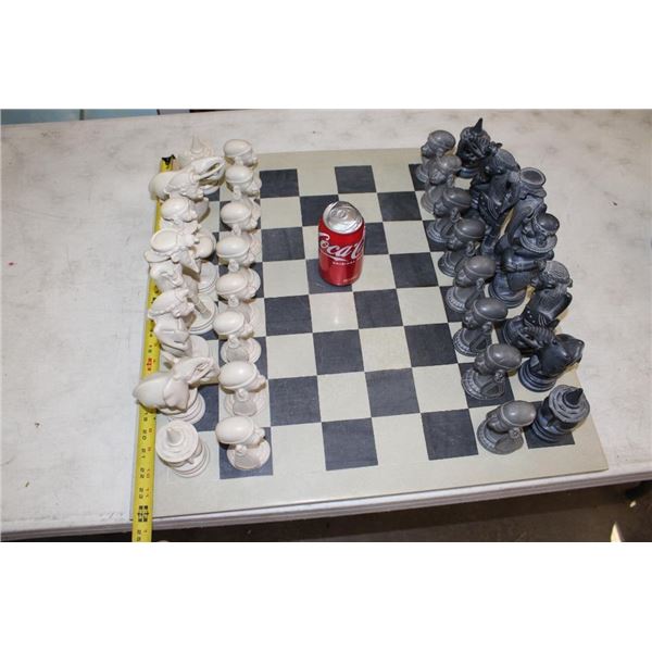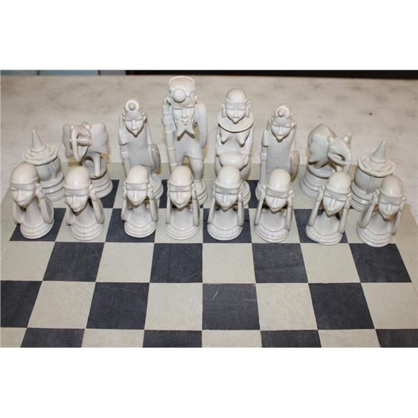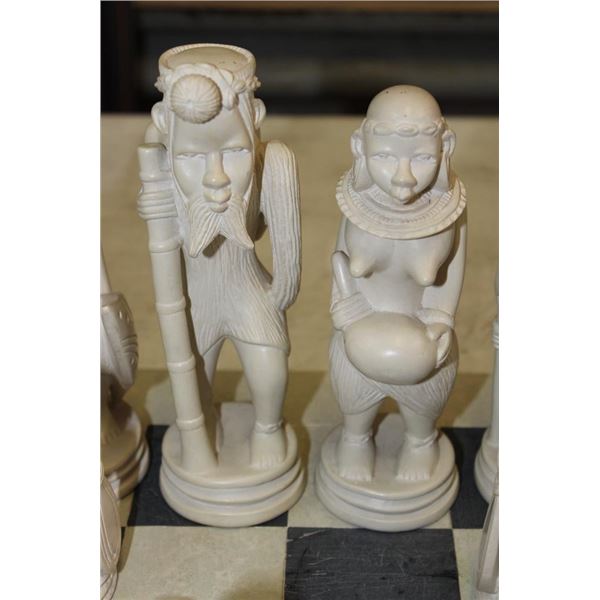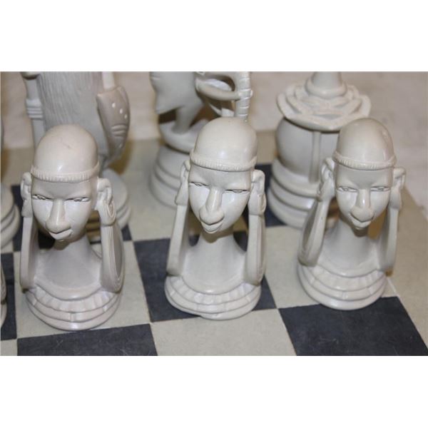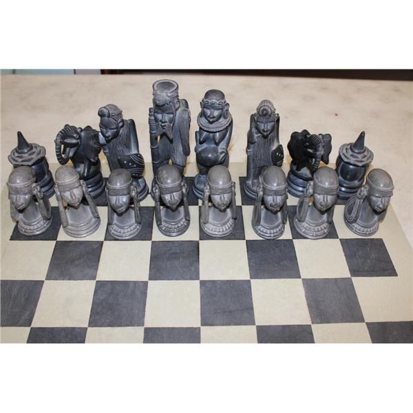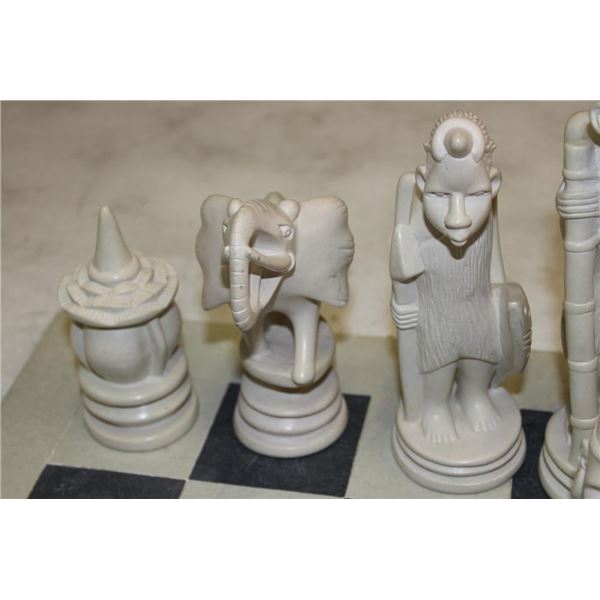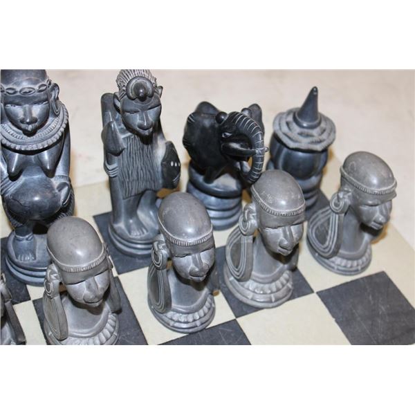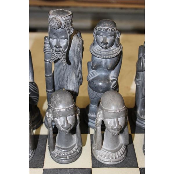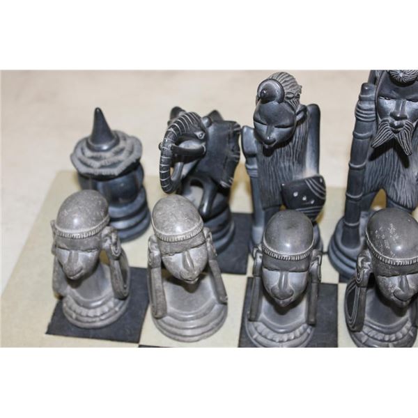 *Big* Hand-carved Soap Stone African CHESS BOARD Set with All 32 Pieces. The Chess Board measures 24" Long x 24" Wide x 3/8" Thick. The Chess Pieces are 4-7" Tall. The Total Weight is approximately 50 lbs. COLLECTIBLE AFRICAN ART CARVINGS AND BOARD GAMES