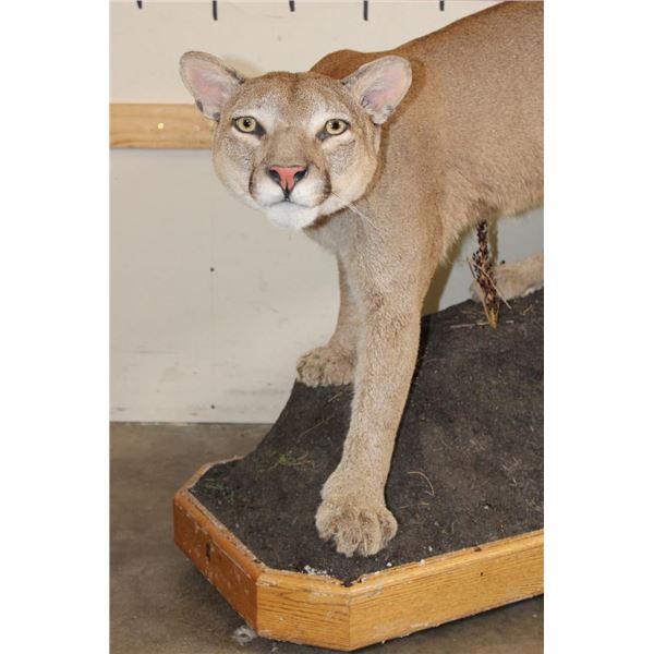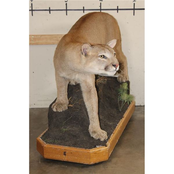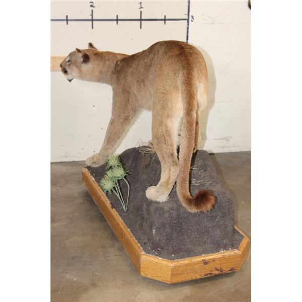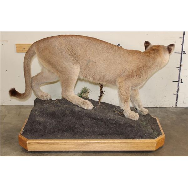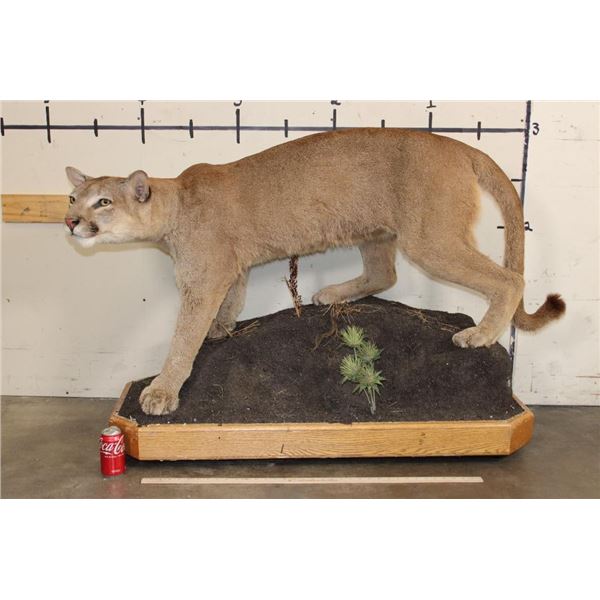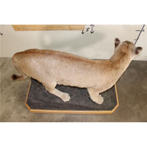 Very Nice Life-sized MOUNTAIN LION or COUGAR. It has been mounted on a Foam on Wood Base with Wheels. The Total Mount measures 55" Long x 20" Wide x 38" Tall. This was removed from a diorama. There is some residue on the Base that can easily be cleaned off. the Mountain Lion is in Very Good Condition. TAXIDERMY