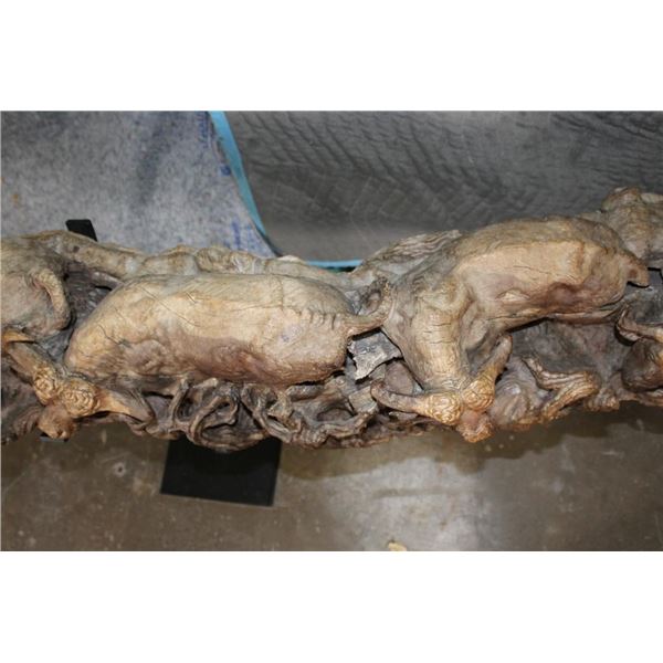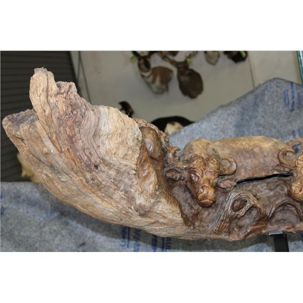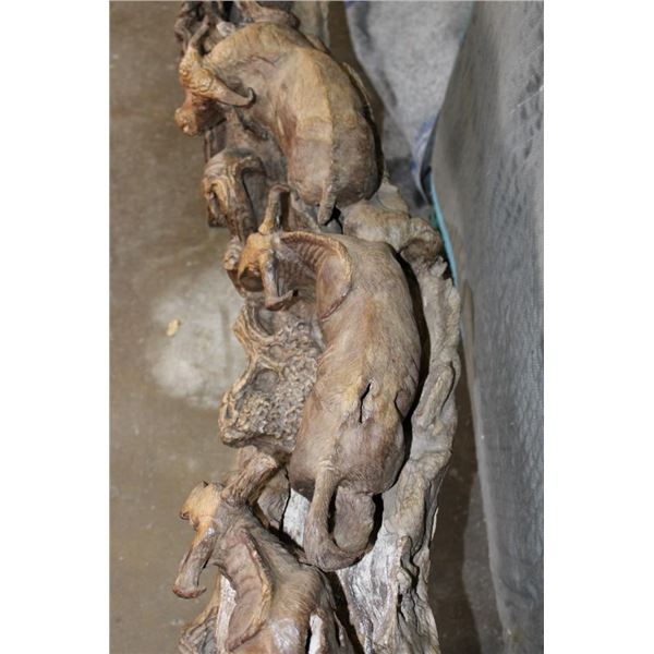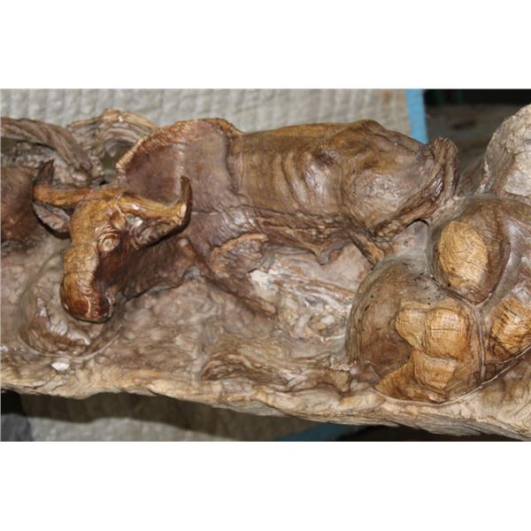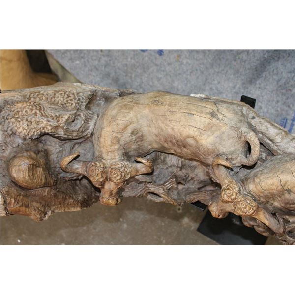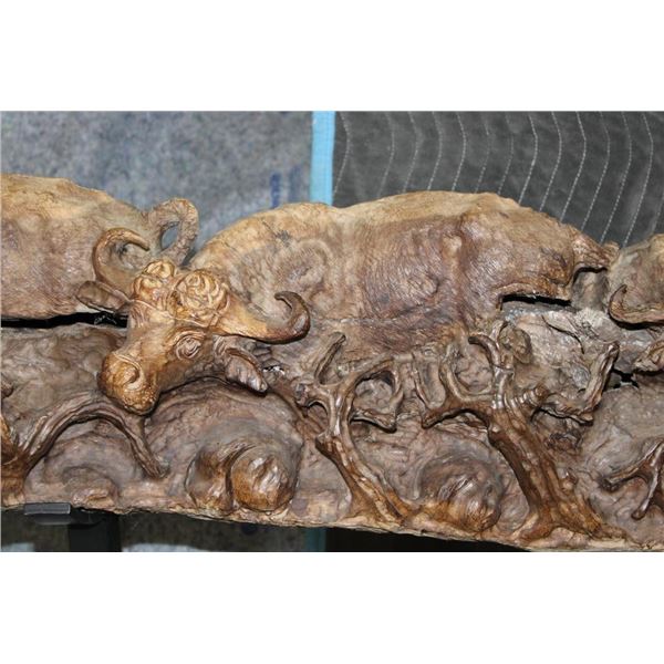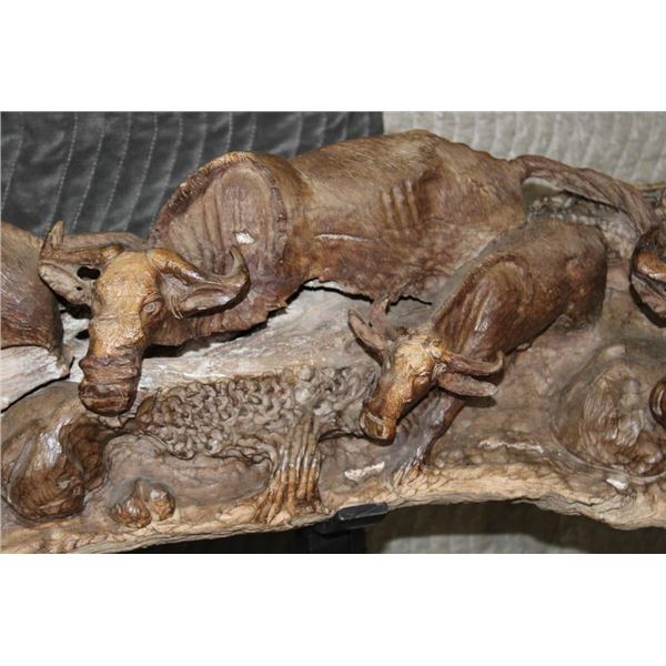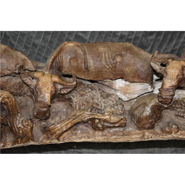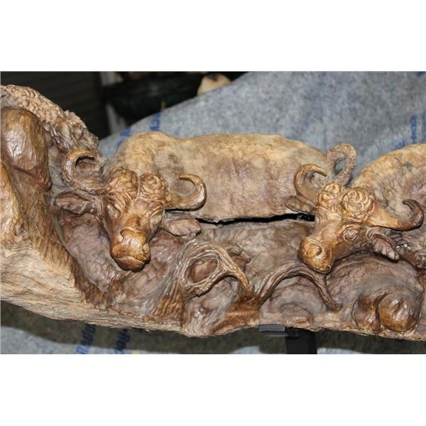 XXL 8' 10" Long Original Leadwood Carving of 3 CAPE BUFFALO and 4 WILDEBEEST by African artist Robert Nzali. The Sculpture has been masterfully carved from a single piece of a leadwood tree and measures 8'10" Long x 12" Thick x 48" Tall. It has been mounted on a Custom 2 piece Metal Stand Base with the 3rd Leg being part of the Leadwood sculpture. The sculpture is removable from the Base. COLLECTIBLE AFRICAN ART CARVINGS AND SCULPTURES
