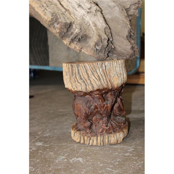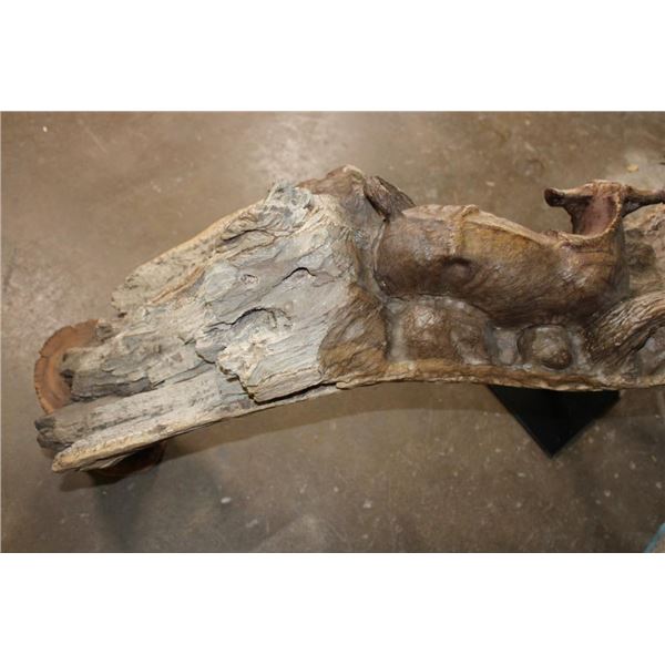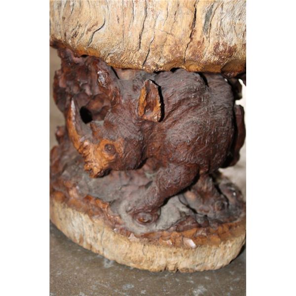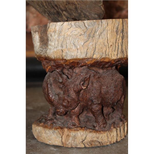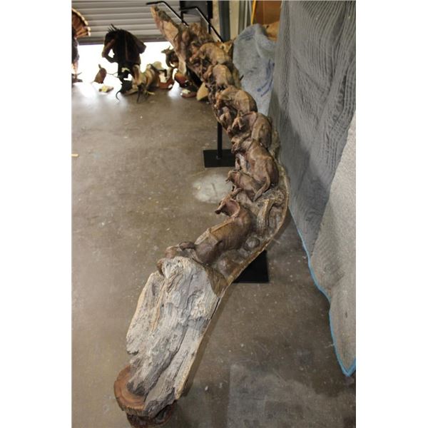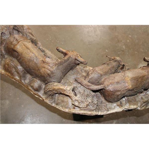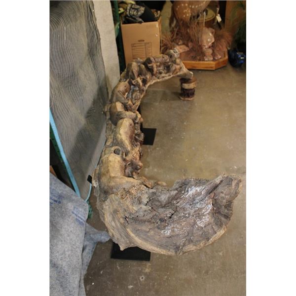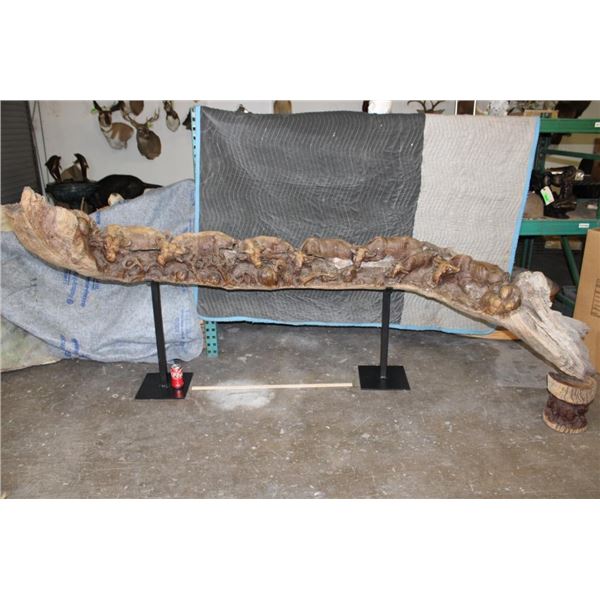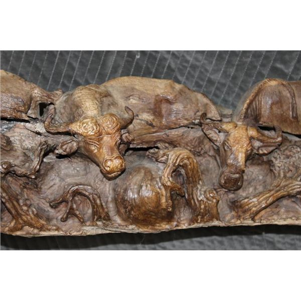 XXL 8' 10" Long Original Leadwood Carving of 3 CAPE BUFFALO and 4 WILDEBEEST by African artist Robert Nzali. The Sculpture has been masterfully carved from a single piece of a leadwood tree and measures 8'10" Long x 12" Thick x 48" Tall. It has been mounted on a Custom 2 piece Metal Stand Base with the 3rd Leg being part of the Leadwood sculpture. The sculpture is removable from the Base. COLLECTIBLE AFRICAN ART CARVINGS AND SCULPTURES