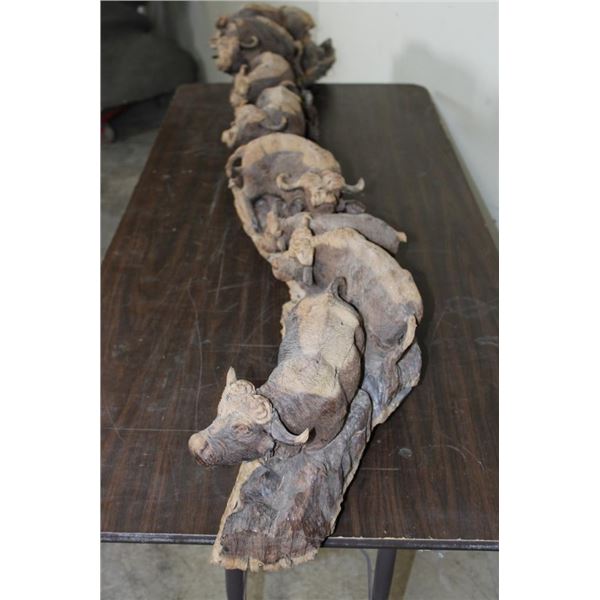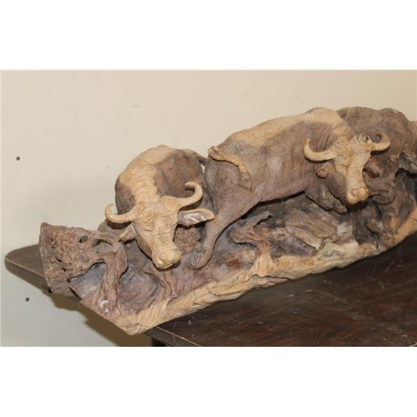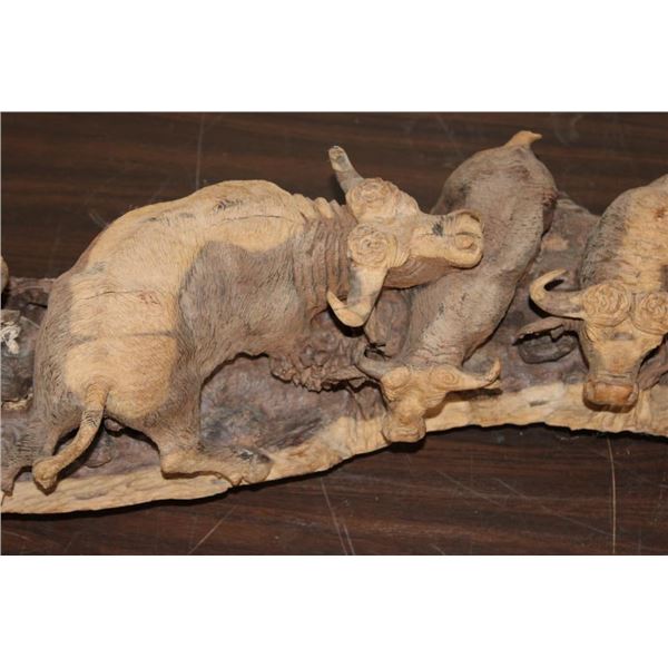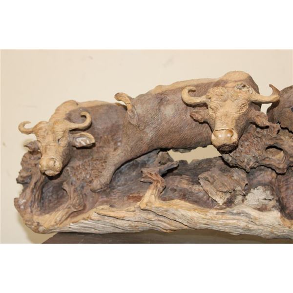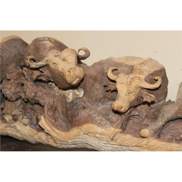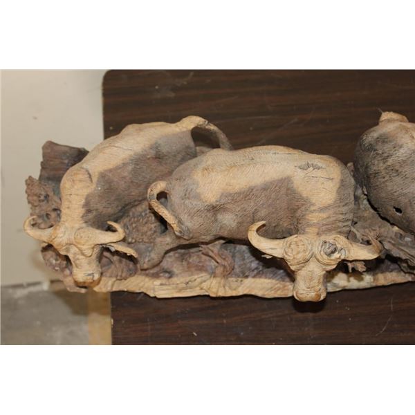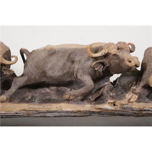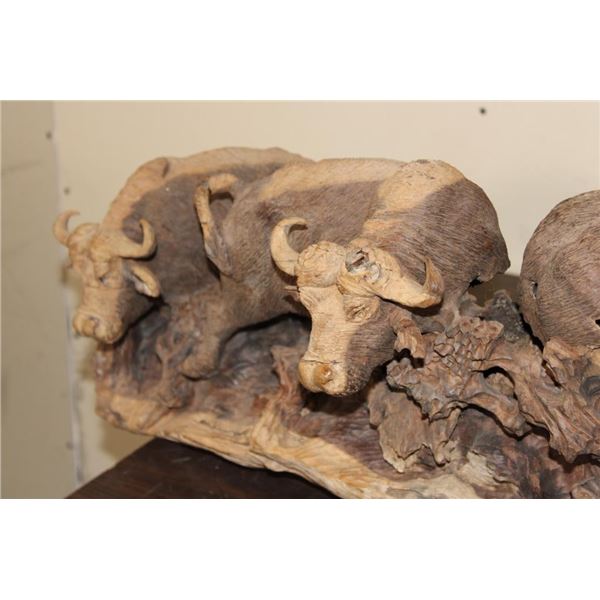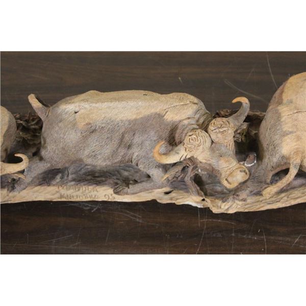 Original Hand-carved Leadwood Sculpture of 3 CAPE BUFFALO by African artist Mandla Khumalo. It measures 77.5" Long x 13" Wide x 12" Tall. This beautiful sculpture will make an exceptional Mantle Piece. It has no base, it can be placed in any space. COLLECTIBLE AFRICAN ART AND CARVINGS