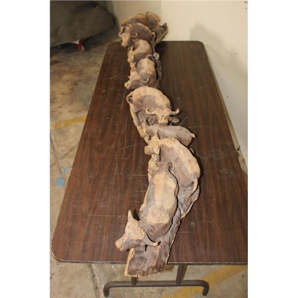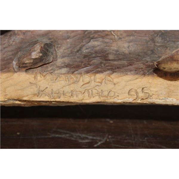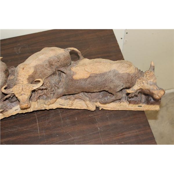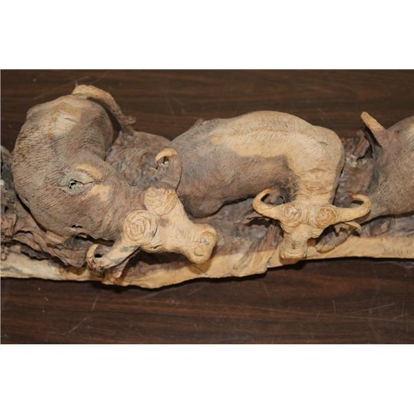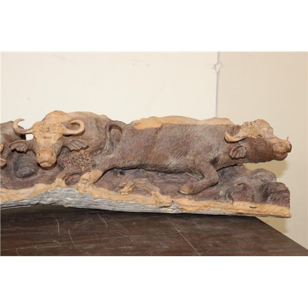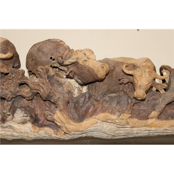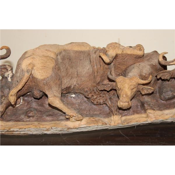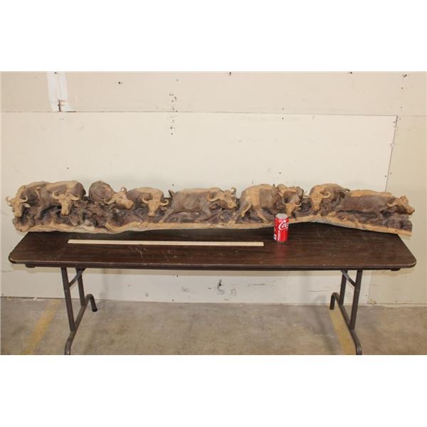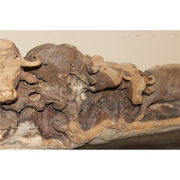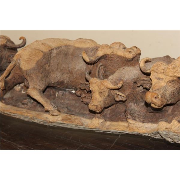 Original Hand-carved Leadwood Sculpture of 3 CAPE BUFFALO by African artist Mandla Khumalo. It measures 77.5" Long x 13" Wide x 12" Tall. This beautiful sculpture will make an exceptional Mantle Piece. It has no base, it can be placed in any space. COLLECTIBLE AFRICAN ART AND CARVINGS
