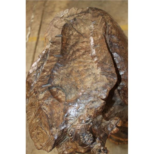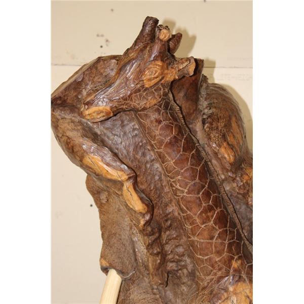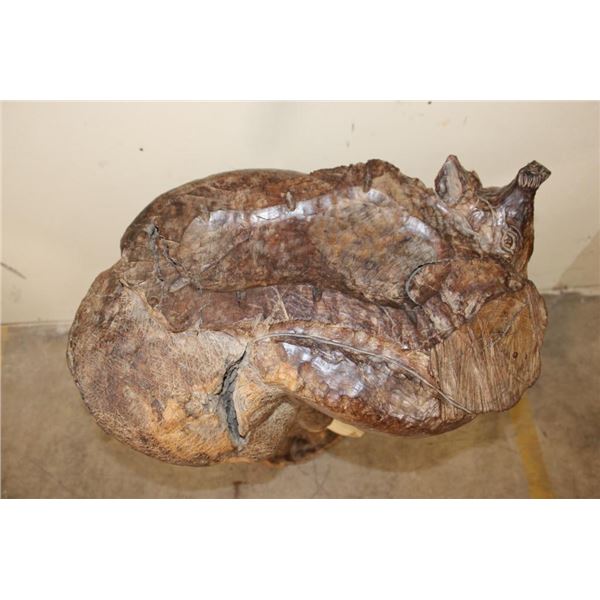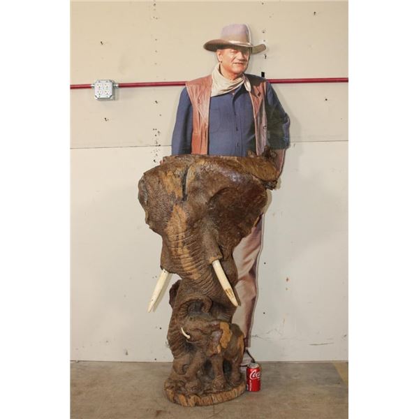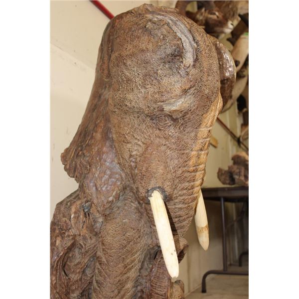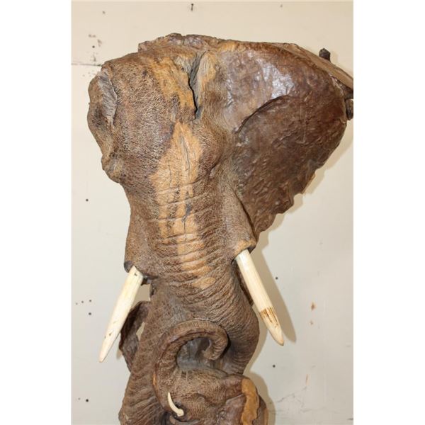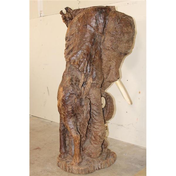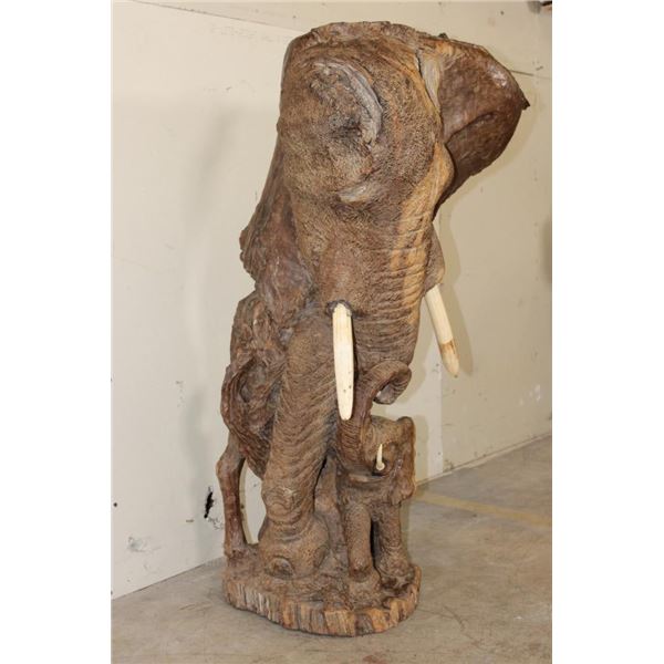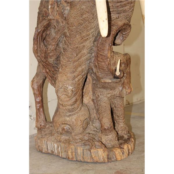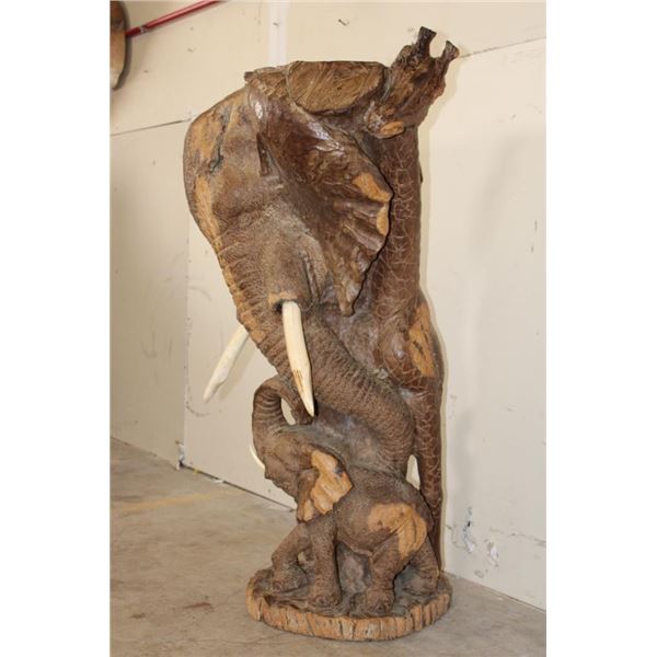 XL Leadwood Carving of a Mother Elephant and her Elephant Calf on one side and a Giraffe on the other. The Mother Elephant's Tusks are made from *Real* Hippopotamus Tooth Ivory. A Cigar Ashtray has been carved at the top of the sculpture. The beautiful carving measures 46" Tall x 25" Wide (at the top) x 23" Wide (at the Bottom). The sculpture Weighs over 200 lbs. COLLECTIBLE AFRICAN ART AND CARVINGS