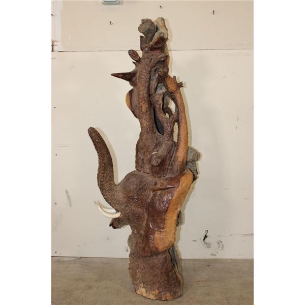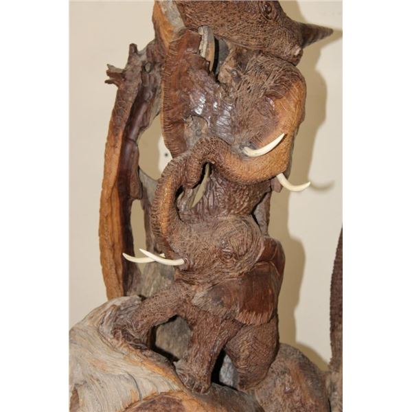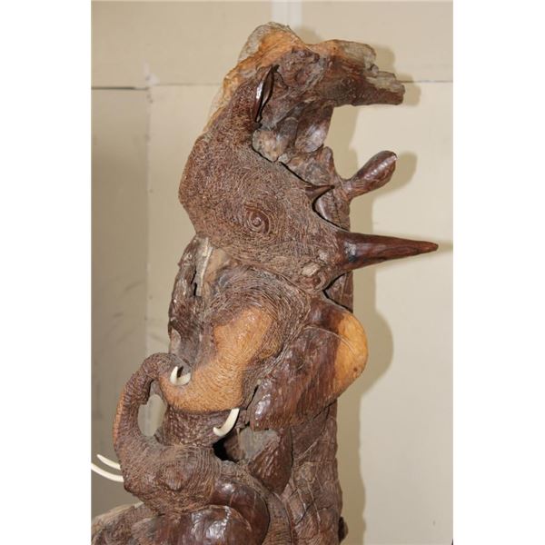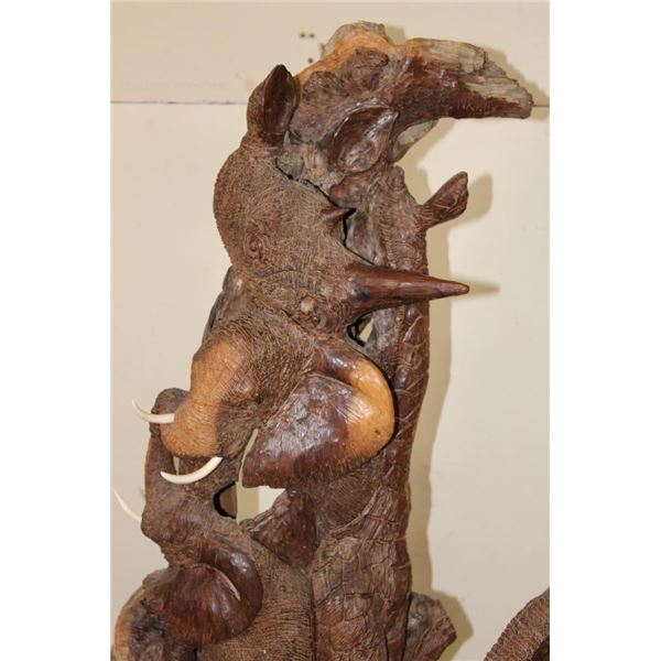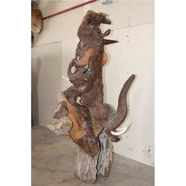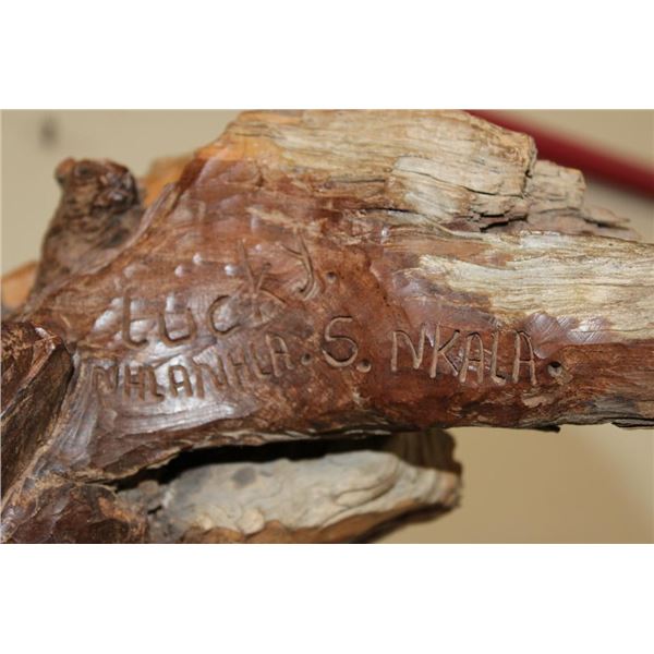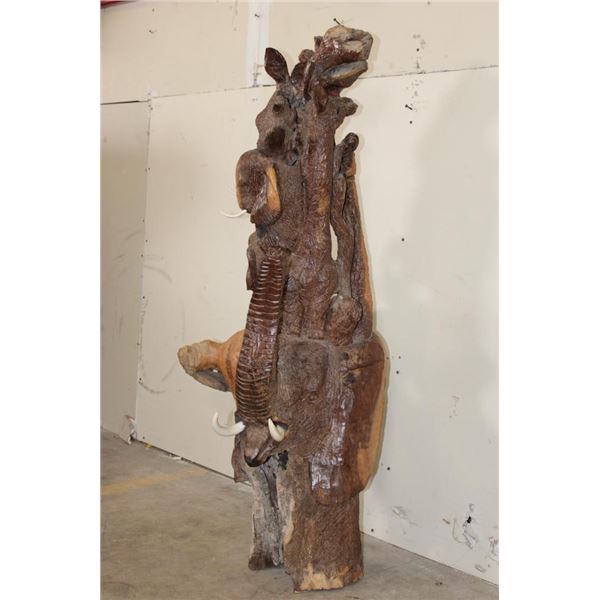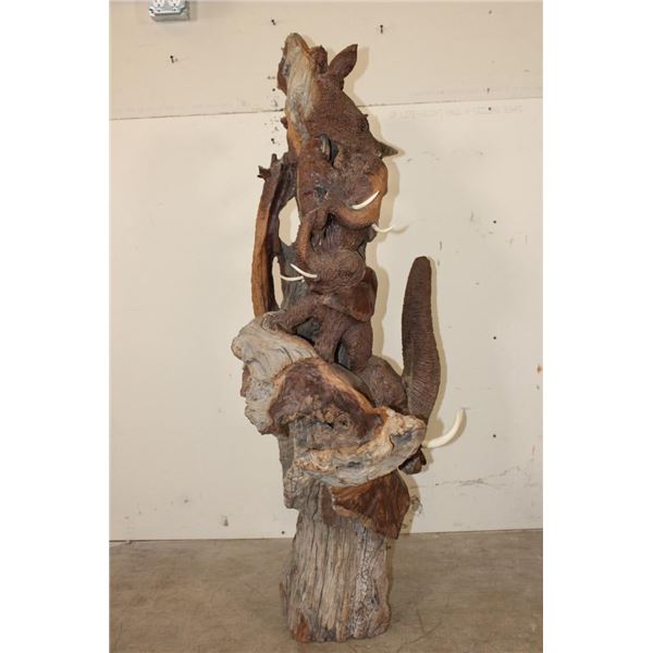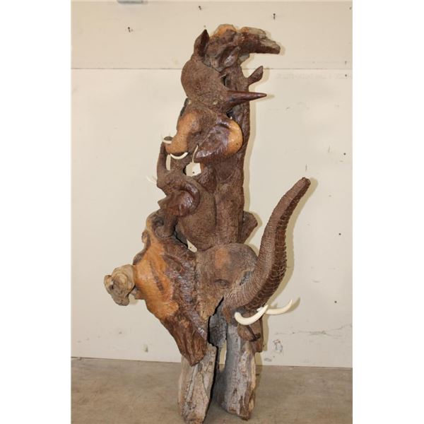 XL 4' Original Leadwood Hand-carved Sculpture "Lucky" by African artist Nhlanhla S. Nkala. This stunning sculpture depicts 3 Elephants, 2 Giraffes, and a Rhinoceros. The Elephants Tusks are believed to be carved from Warthog Tusk. The sculpture measures 51" Tall x 25" Long x 22" Wide and Weighs approximately 100 lbs. The artist has carved "Lucky. Nhlanhla. S. Nkala" into the piece. COLLECTIBLE AFRICAN ART SCULPTURES AND CARVINGS