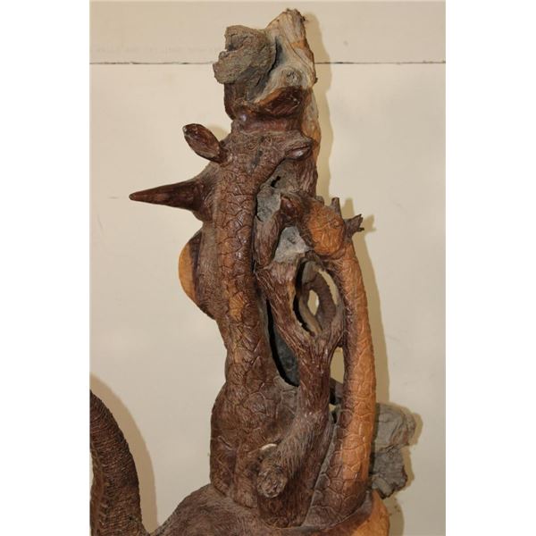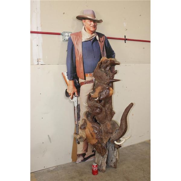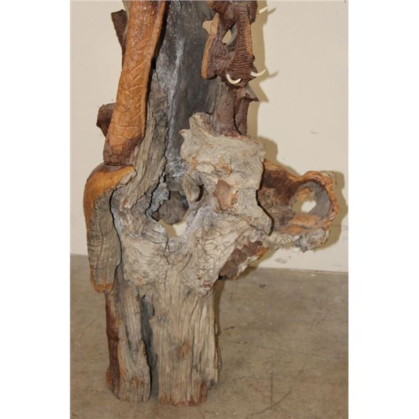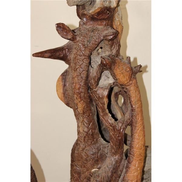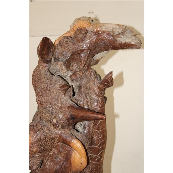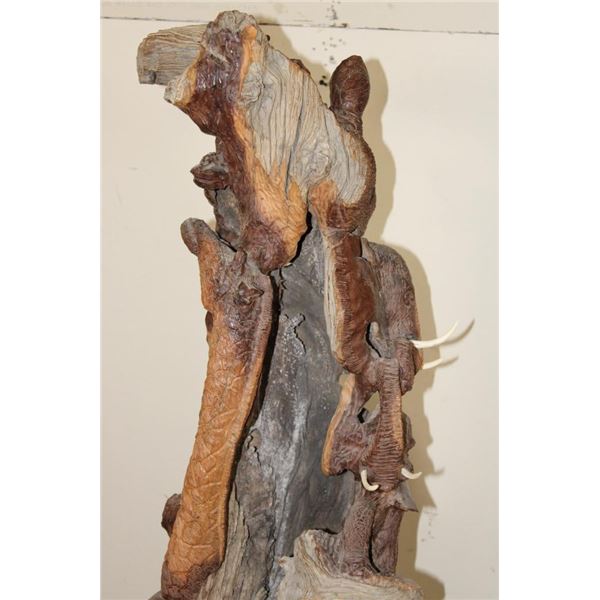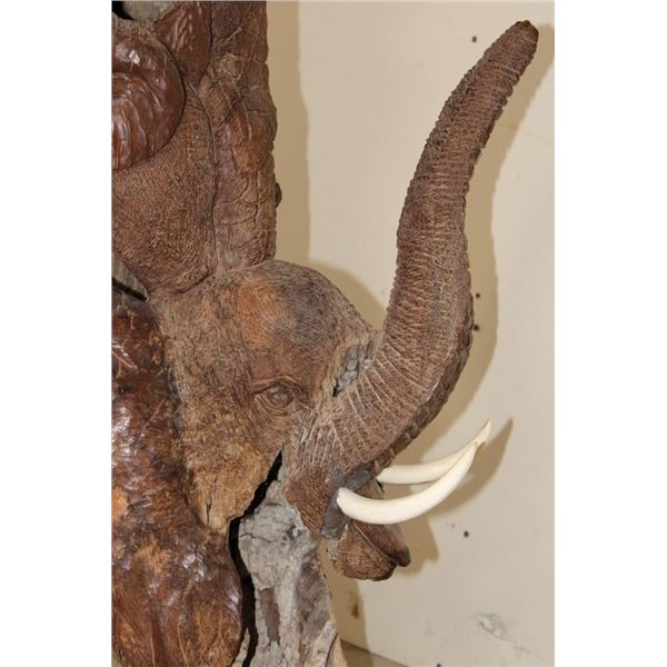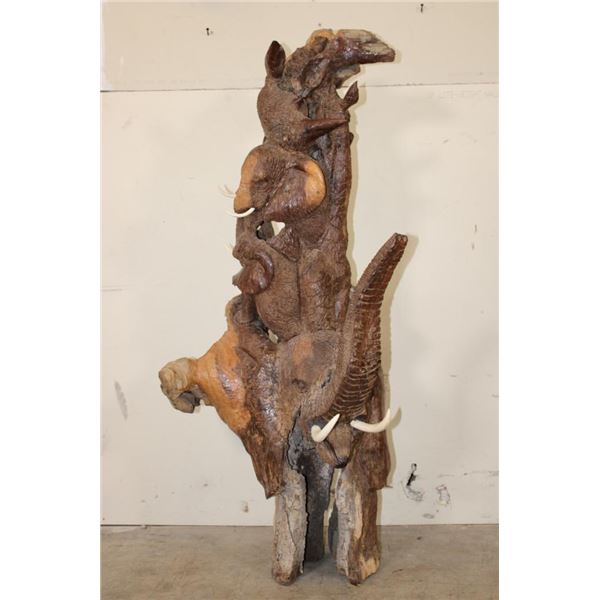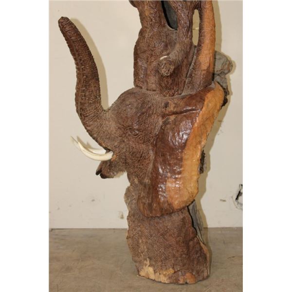 XL 4' Original Leadwood Hand-carved Sculpture "Lucky" by African artist Nhlanhla S. Nkala. This stunning sculpture depicts 3 Elephants, 2 Giraffes, and a Rhinoceros. The Elephants Tusks are believed to be carved from Warthog Tusk. The sculpture measures 51" Tall x 25" Long x 22" Wide and Weighs approximately 100 lbs. The artist has carved "Lucky. Nhlanhla. S. Nkala" into the piece. COLLECTIBLE AFRICAN ART SCULPTURES AND CARVINGS