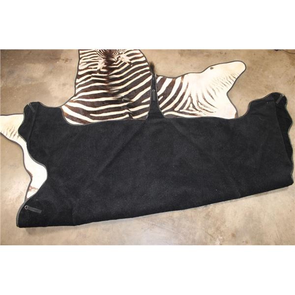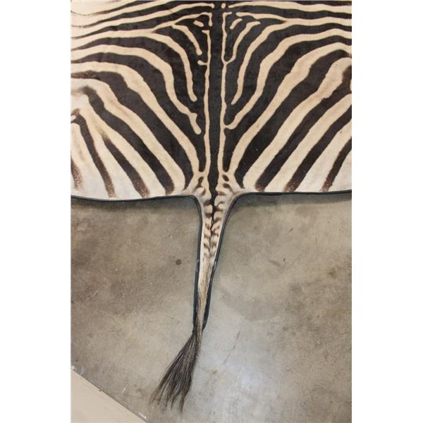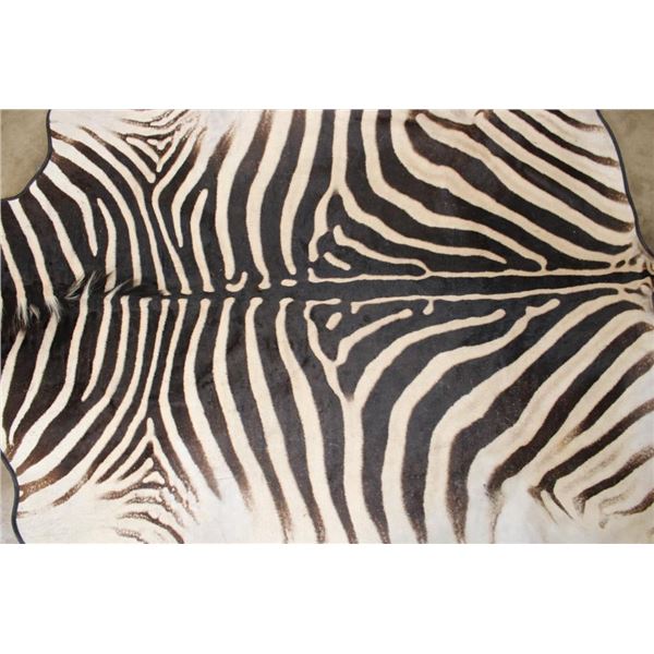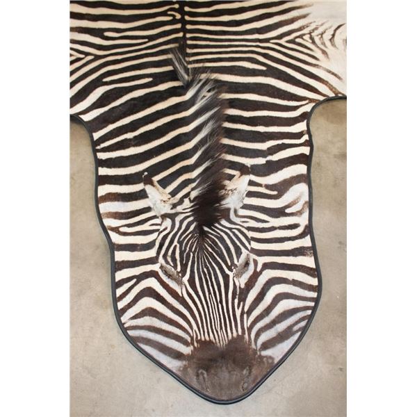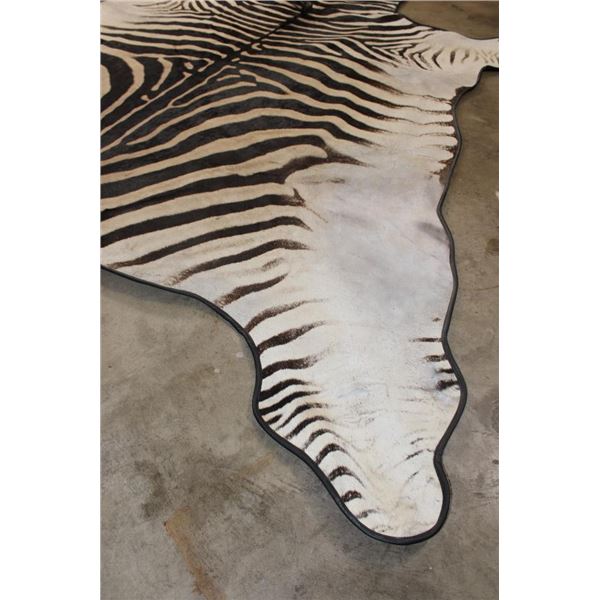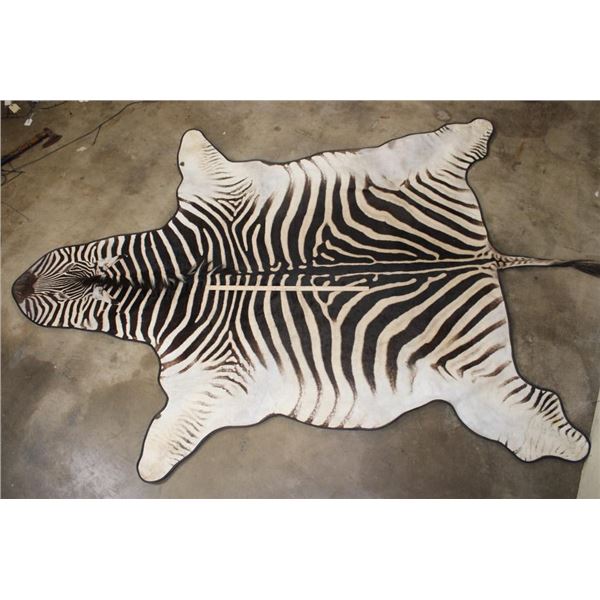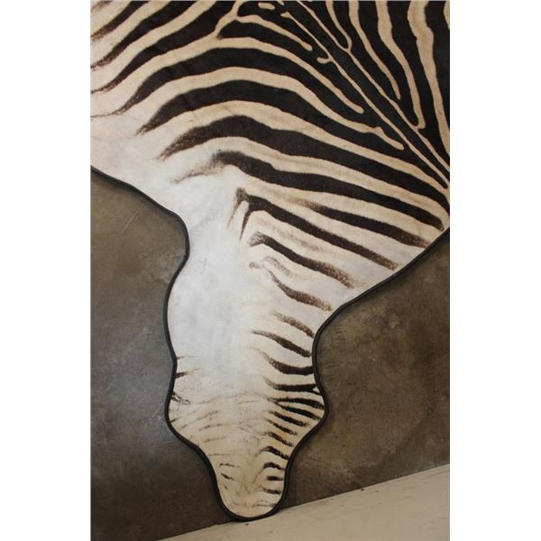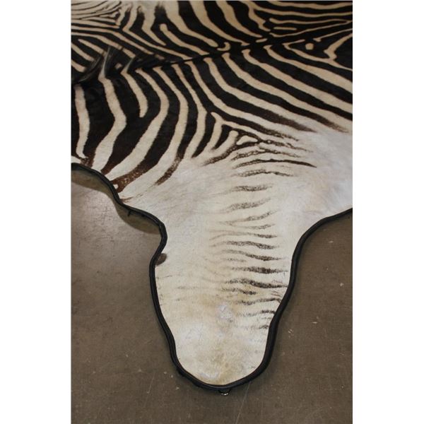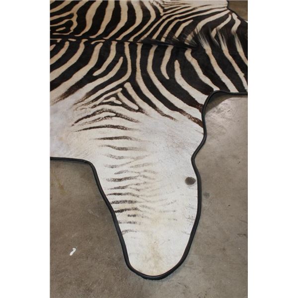 Looks Brand New! This is a vibrant white with dark stripes ZEBRA Rug. It has excellent construction and is complete with a Carpet Backing, Hanging Loops, and Leather Piping. It measures 11.5" Long x 7' 8" Wide. TAXIDERMY RUGS