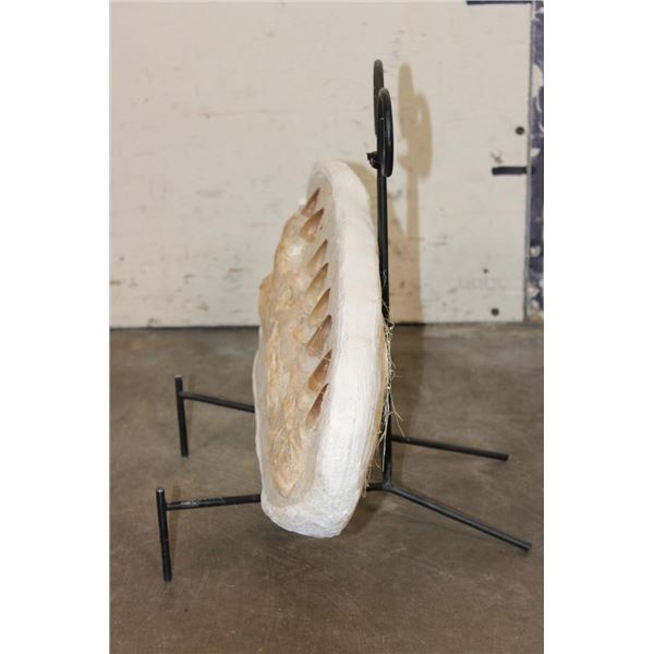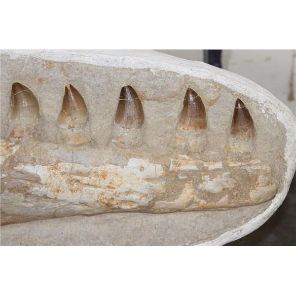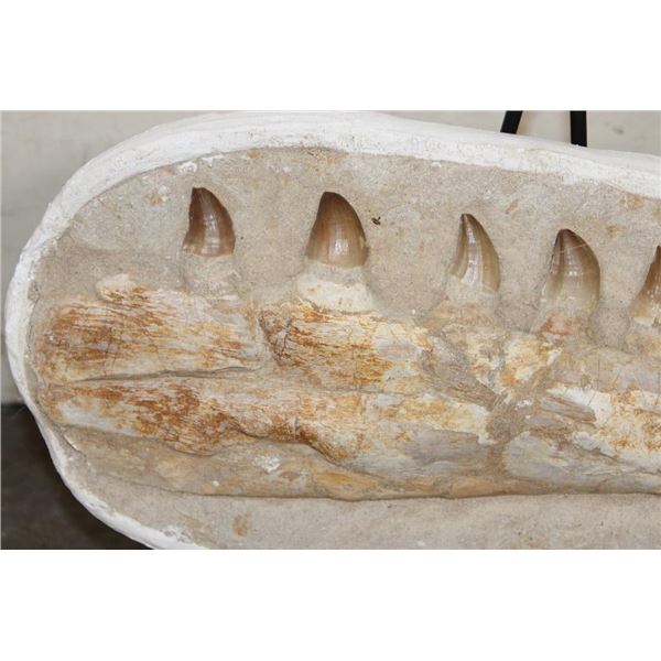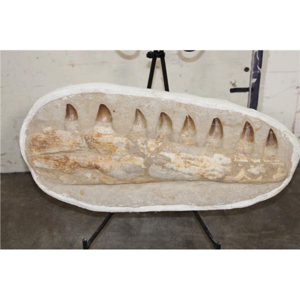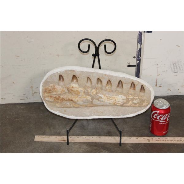 MOSASAURUS Jaw Fossil in a Matrix with 8 Big Teeth and a Metal Display Stand. The complete specimen measures 16" Long x 7.5" tall x 3" Thick. The Total Weight is 11 lbs. ROCKS MINERALS FOSSILS