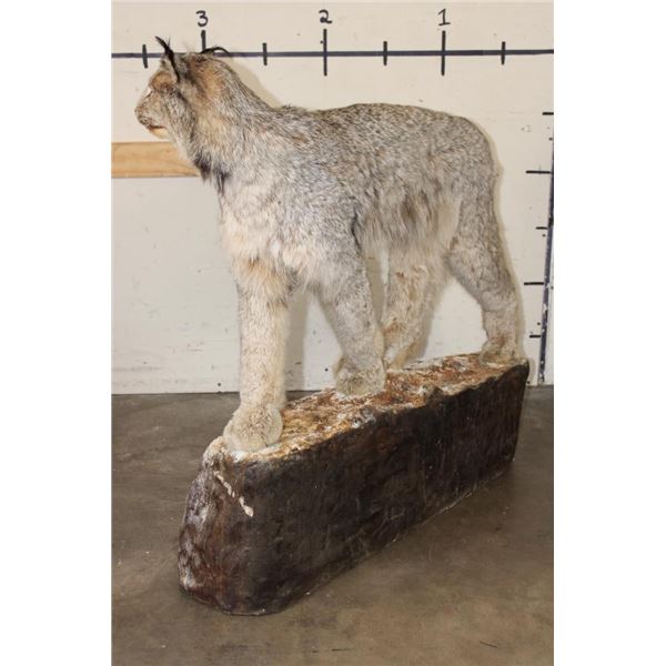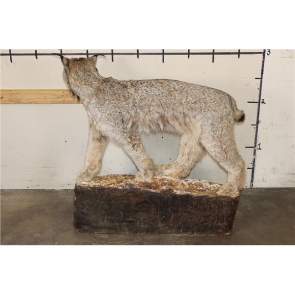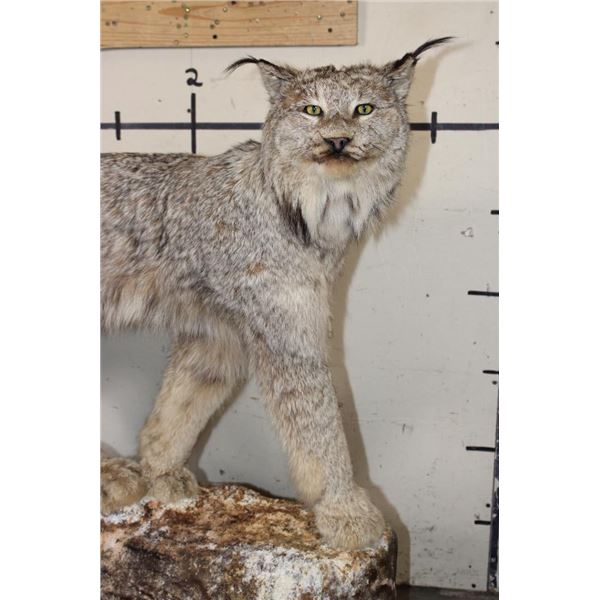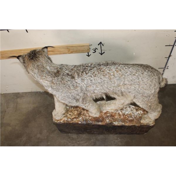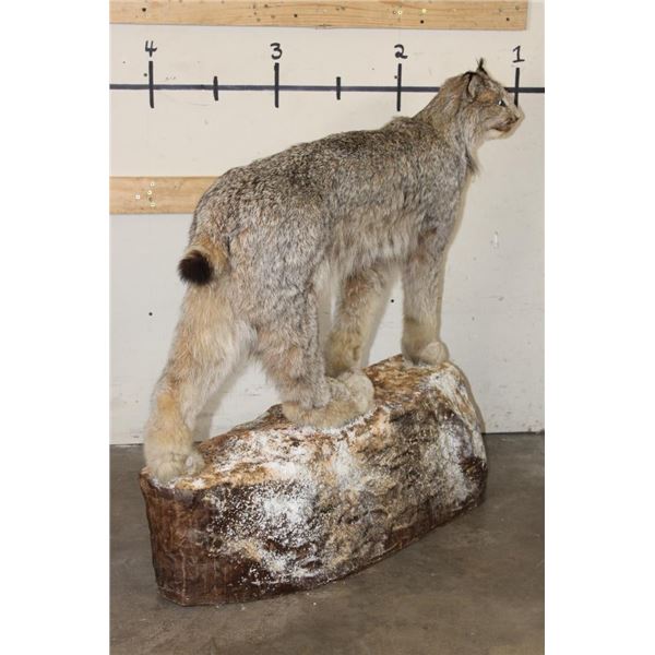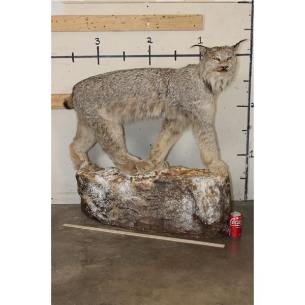 Very Nice Life-sized LYNX on a simulated Rock Base. It measures 39" Long x 11" Wide x 40" Tall and is in Very Good Condition. TAXIDERMY