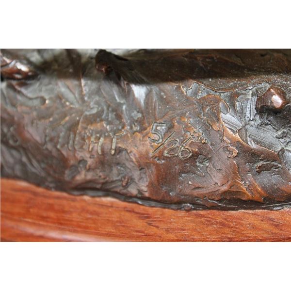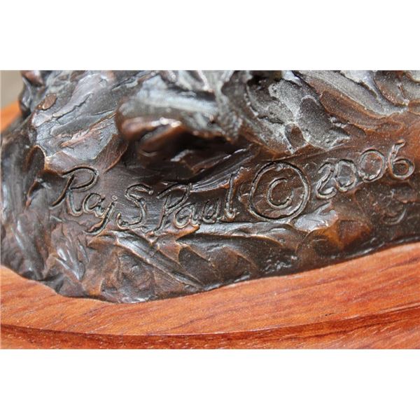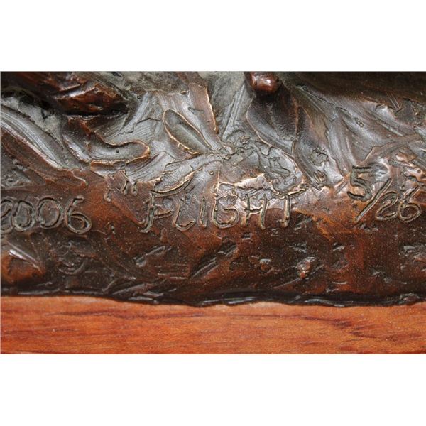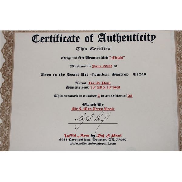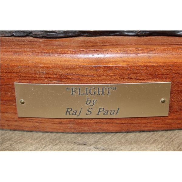 Original Cast Bronze "Flight" by Raj S. Paul. It has been signed, numbered #5/26 and is complete with a Certificate of Authenticity. It measures 14" Tall x 13.5" Long x 7.5" Wide. The Total Weight is 12 lbs 6 oz. COLLECTIBLE BRONZE SCULPTURES AND STATUES