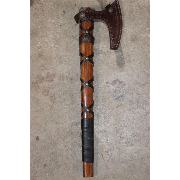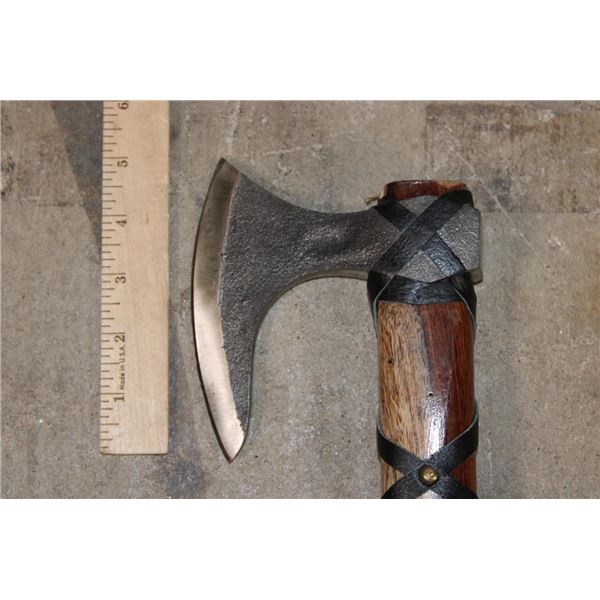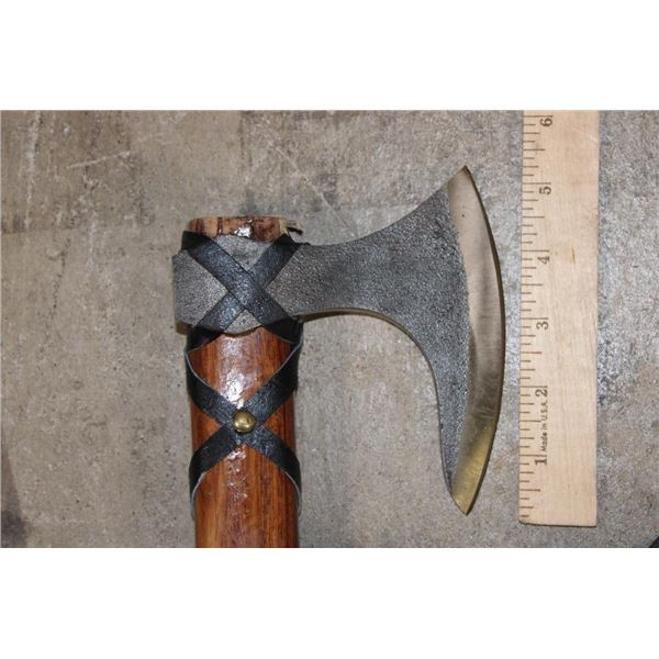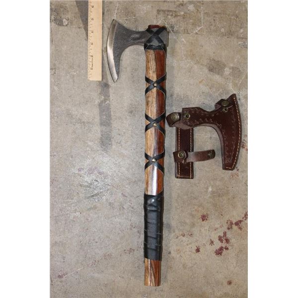 Contemporary Viking Battle AXE. It has a Leather Sheath and a Belt Loop with a Carbon Steel Blade. The wooden handle measures 20" Long and the Blade measures 5.5" Wide x 6" Long. The Total Weight is 1 lb 13 oz. Great Axe for practical use. AXES AND MACHETES
