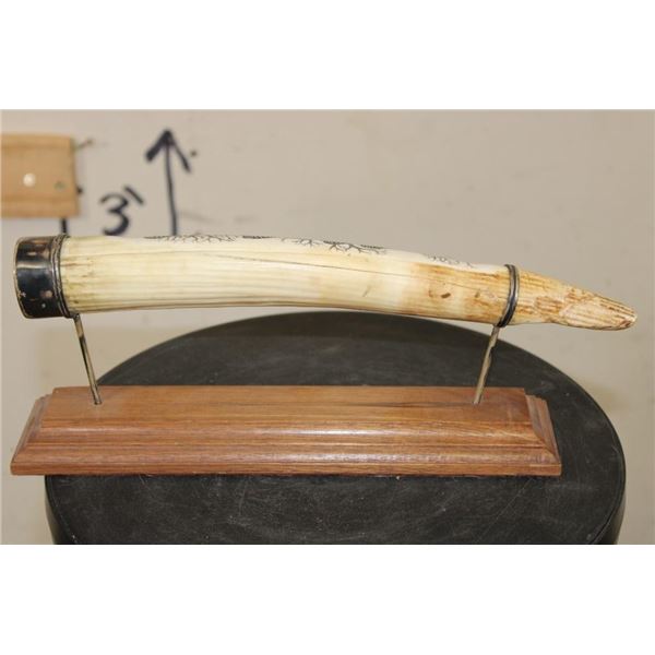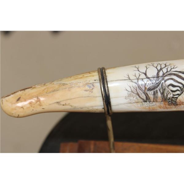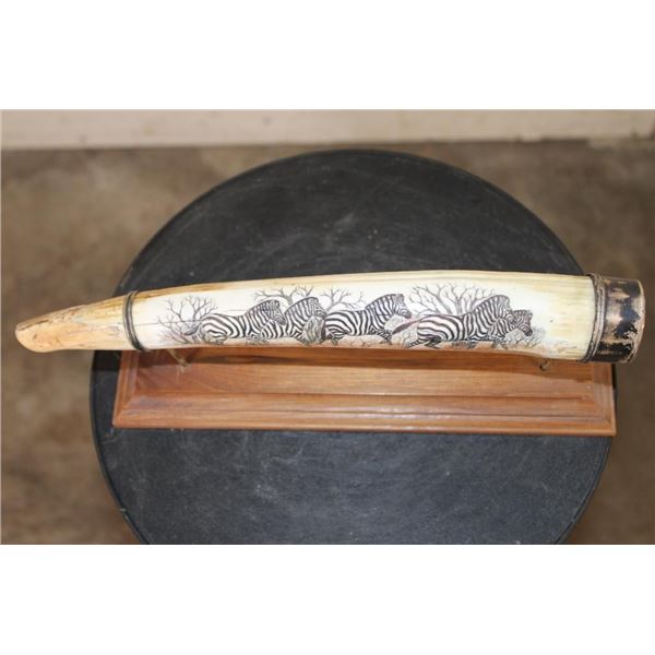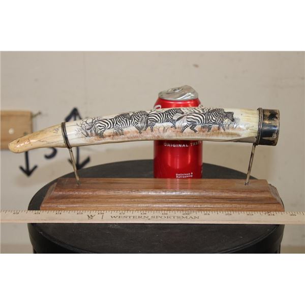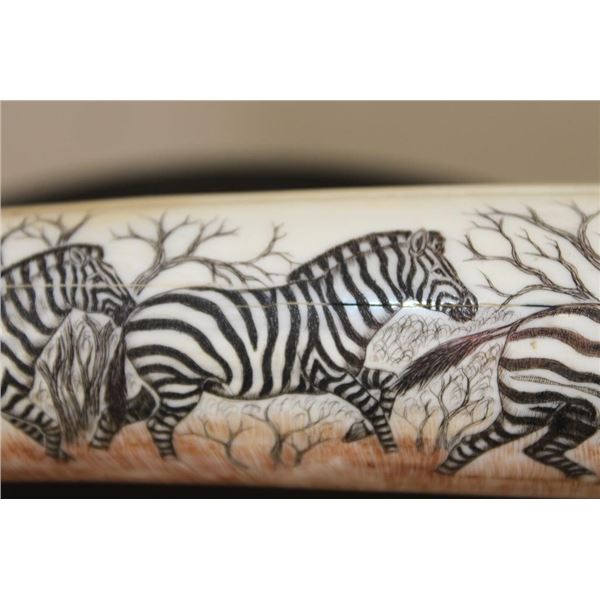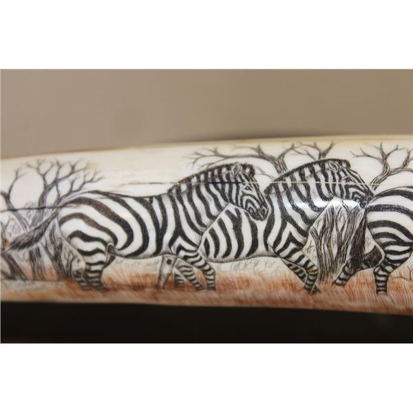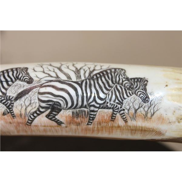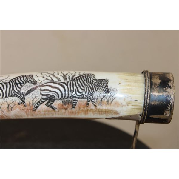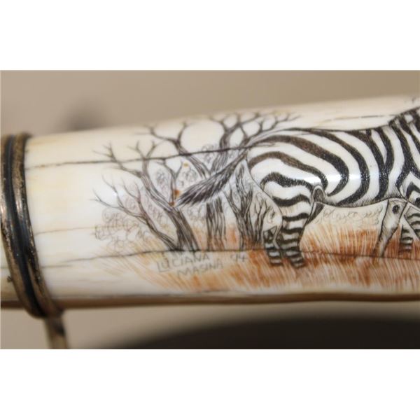 Masterfully carved Hippo Ivory Tusk signed by African artist "Luciana Macina 94 ". This is an incredible scrimshawed HIPPOPOTAMUS Tusk. It features 5 Zebras roaming in their natural habitat. It has delicate details that capture the beauty of African wildlife. The Hippo Tusk itself measures approximately 13" around the curve. It is displayed on a metal and wood stand and the Total piece measures 13.25" Long x 3" Wide x 5" Tall. The next Lot is another piece by the same artist. COLLECTIBLE AFRICAN ART AND TAXIDERMY