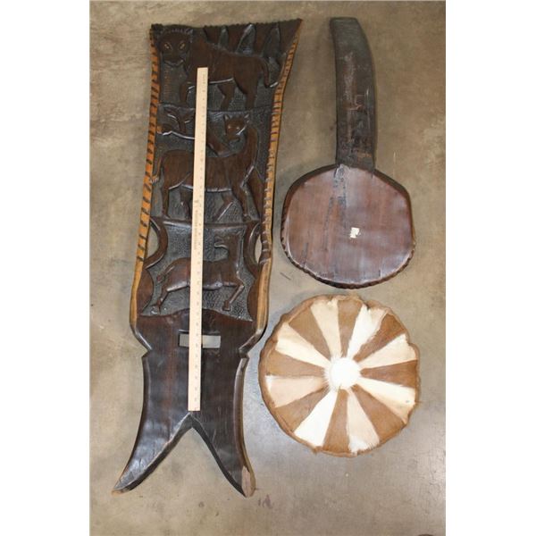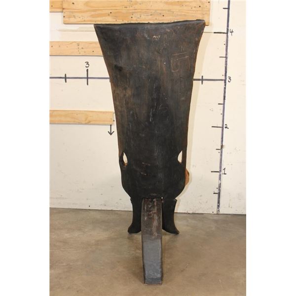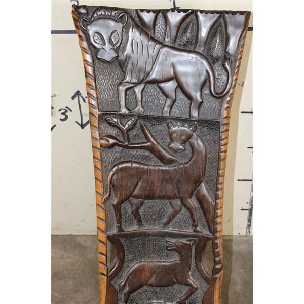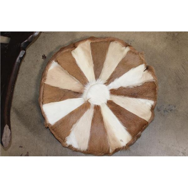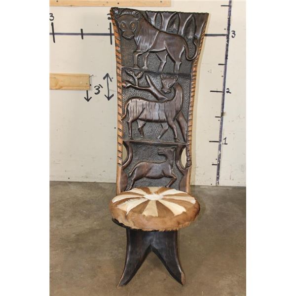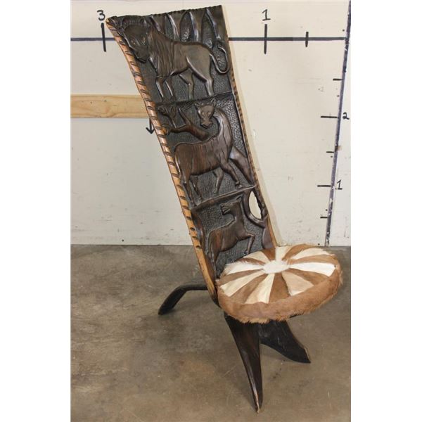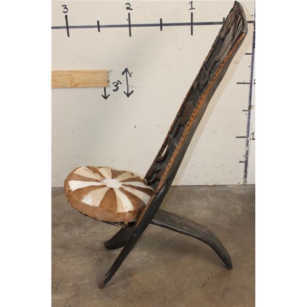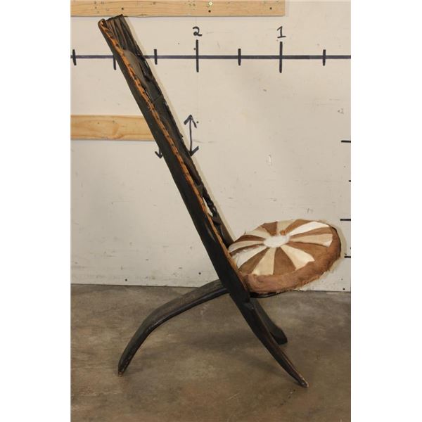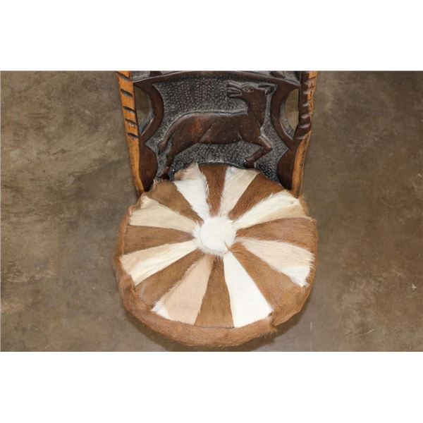 Beautiful 2 Piece, Hand-carved African Palaver Chair. It has a removable patchwork IMPALA and SPRINGBOK Hide Seat Cushion. It measures 29" Long x 17.5" Wide x 43.5" Tall. The Total Weight is 24 lbs. COLLECTIBLE AFRICAN ART AND FURNITURE
