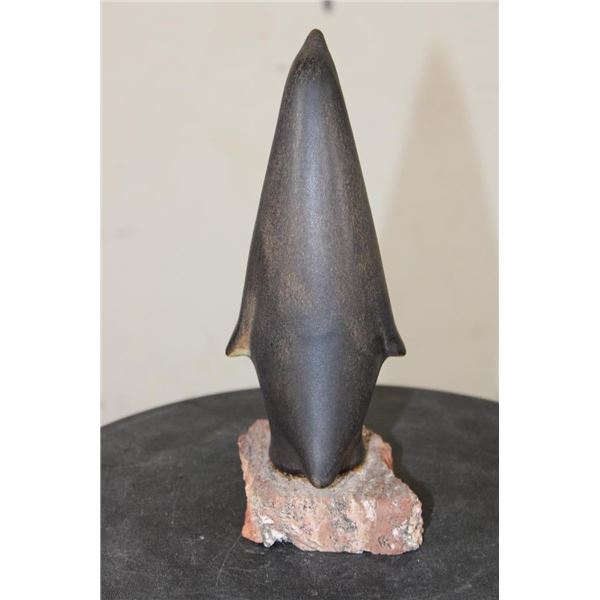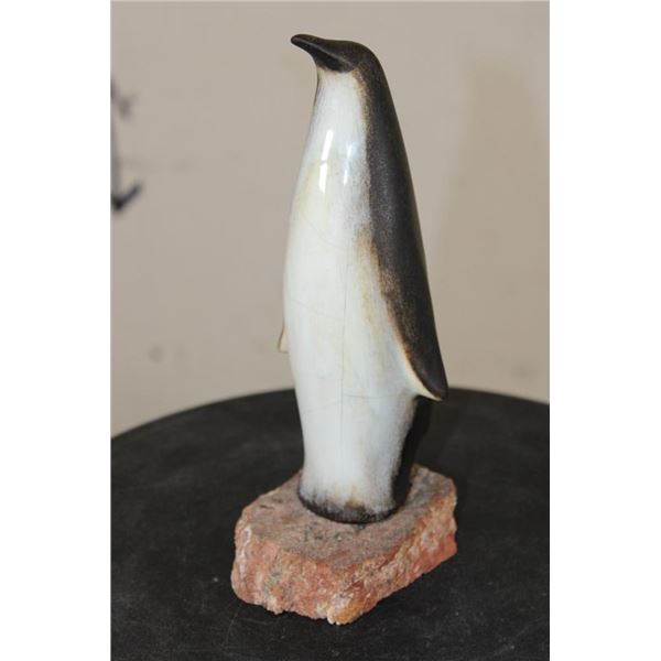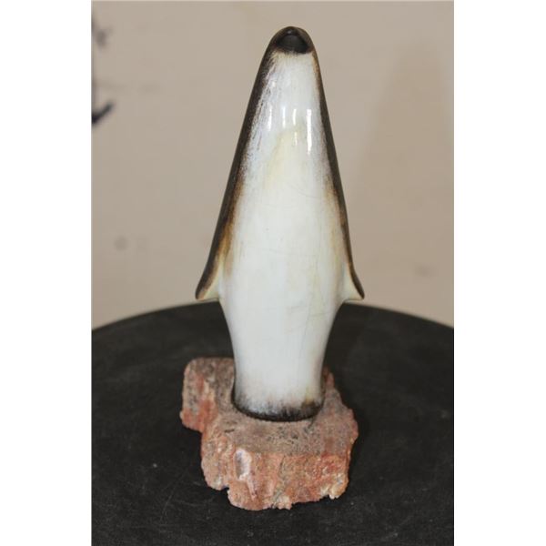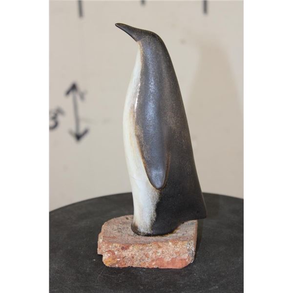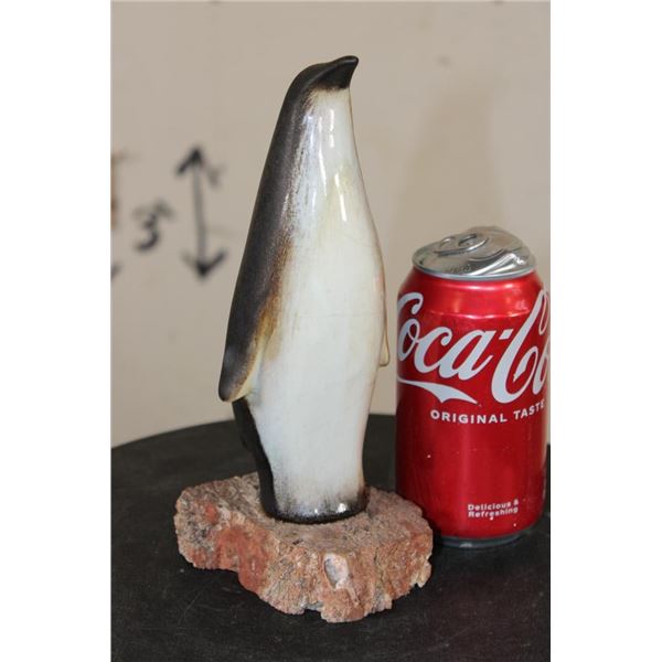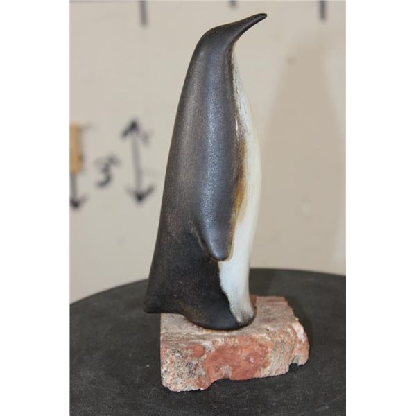 Original Ceramic PENGUIN Sculpture on a Petrified Wood Base signed "Daga" (on the bottom) by the artist Maigonis Daga. It measures 4.25" Long x 3.5" Wide x 8.5" Tall. The Total Weight is 1 lb 2 oz. COLLECTIBLE ART SCULPTURES