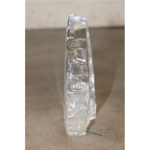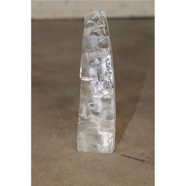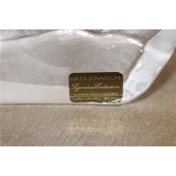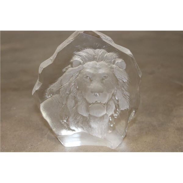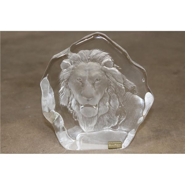 Crystal AFRICAN LION Sculpture by Mats Jonasson for Kosta Boda Signature Collection. It was hand-made in Sweden and is made of Lead Crystal (28% Pb0). It measures 7" Tall x 6.25" Wide x 1.75" Thick. The Total Weight is 3 lbs 14 oz. COLLECTIBLE AFRICAN DECOR