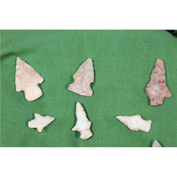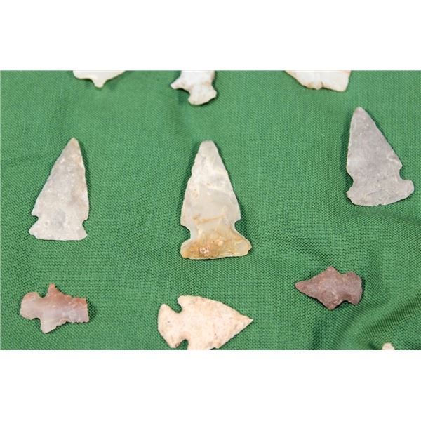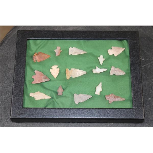 (15) Flint Bird Point ARROWHEADS. They measure from 3/4" to 1 3/8" Long. They are displayed in an 8" Long x 6" Wide Case with Glass. (ONE$) ARROWHEADS *While these arrowheads came from an estate of a long-time collector; we as the auction company are not going to get into a protracted discussion about age and authenticity. This collector has no paperwork or COA as to age or authenticity. While we believe the vast majority; if not all to be old; we are wholly uncomfortable with an argument with qualified and unqualified, alleged authorities. All of that to say; we are not guaranteeing age or authenticity*