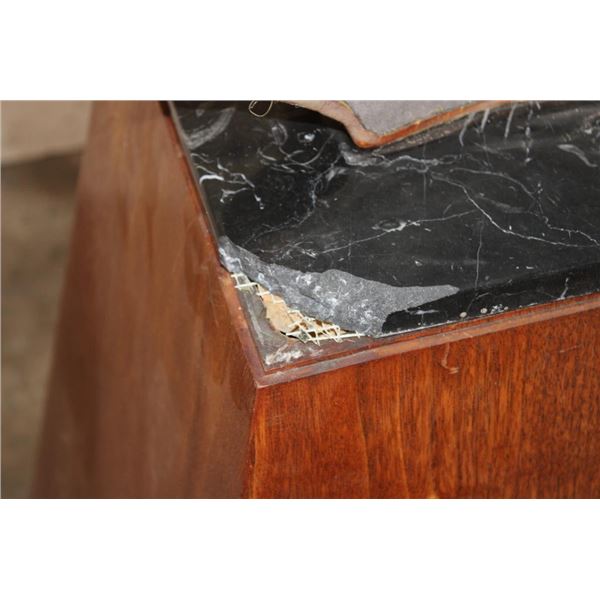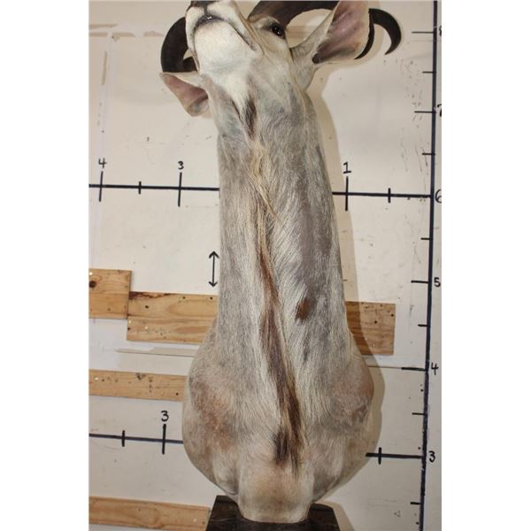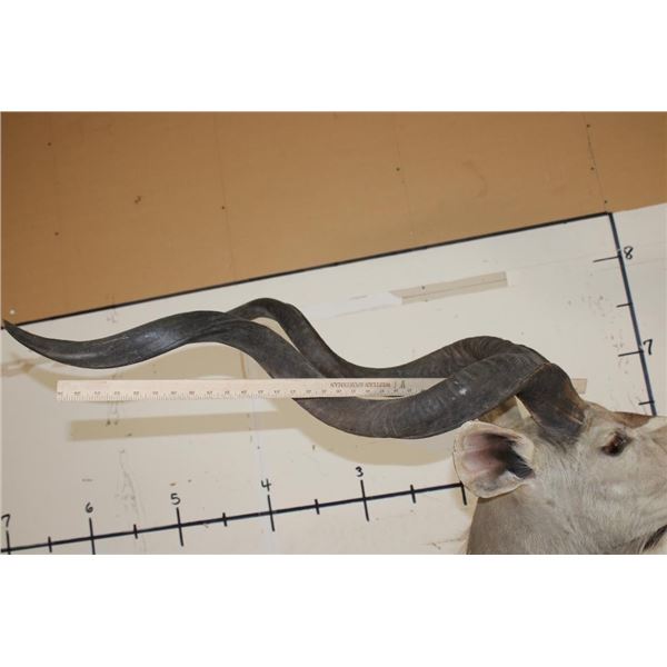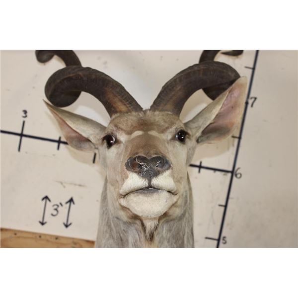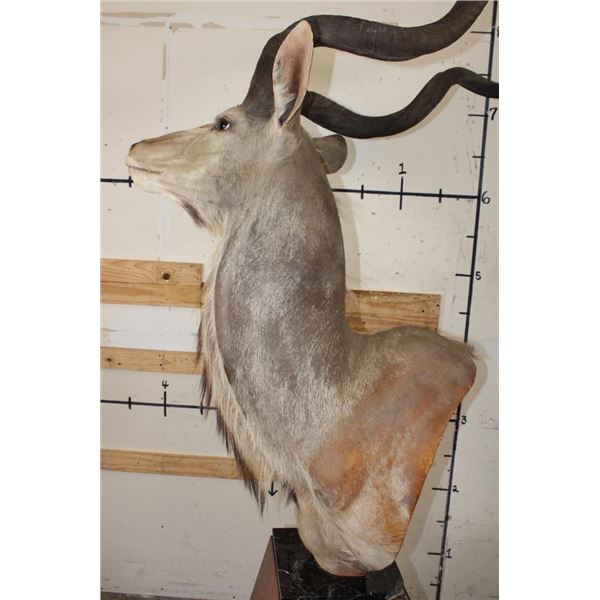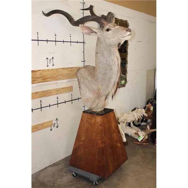 KUDU Pedestal Mount with a Marble Base Top and a Wood Pedestal. It measures approximately 7' 2" Tall x 2" Wide x 46" Depth (from the wall). The Kudu/Marble Slab are removable. The marble on the back side is chipped a tiny bit in the corner. The mount measures over 7.5' Tall. TAXIDERMY