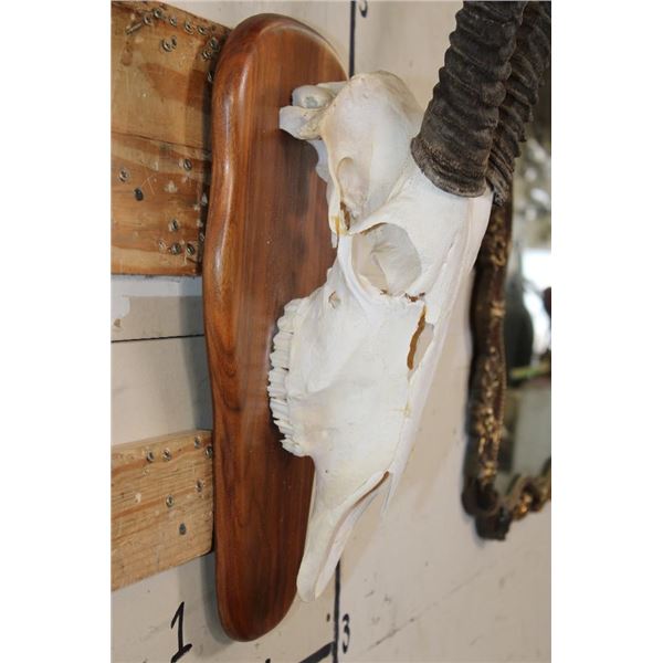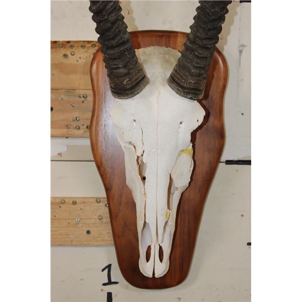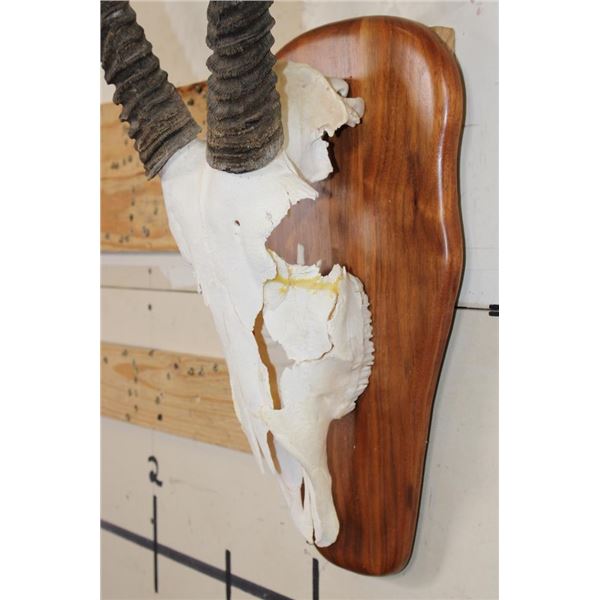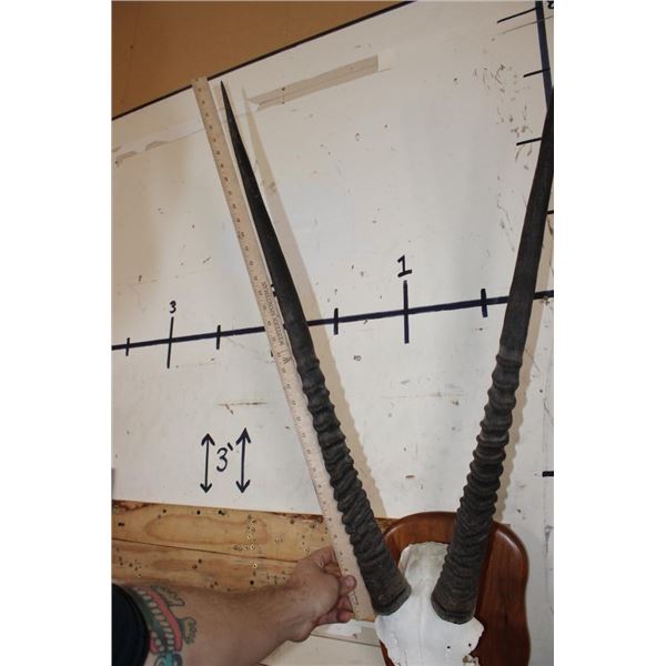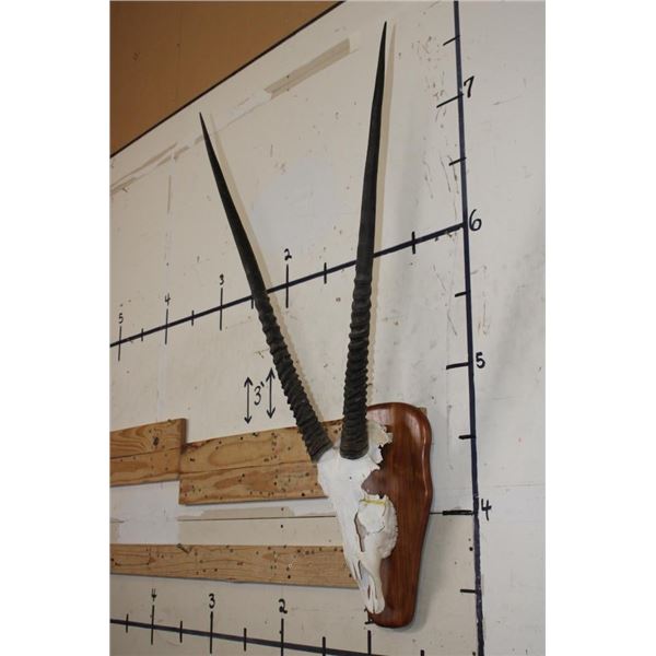 Big GEMSBOK Skull on a Wooden Plaque. The Left Horn measures 34.5" Long and the Right Horn measures 35" Long. It has several glue repairs. TAXIDERMY