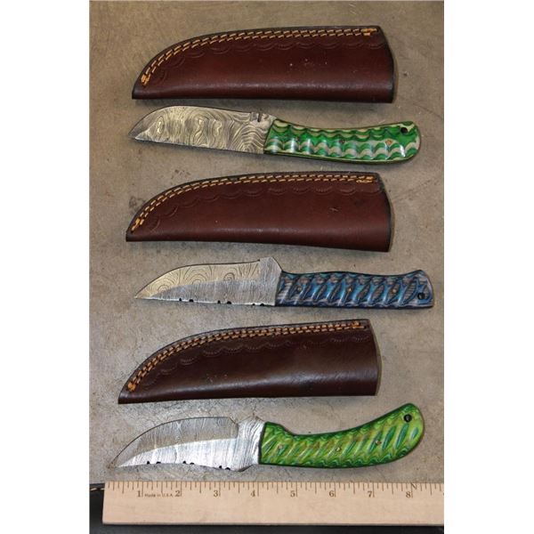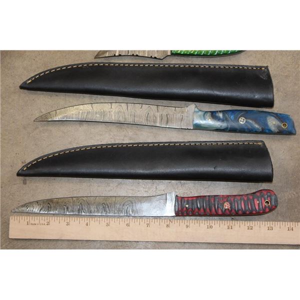 5 Damascus Steel KNIVES. There are 2 Big Filet Knives and 3 Fixed Blade Knives. They all have colorful Wood or Resin Handles and come with thier own Leather Sheaths. (ONE$) FISHING AND HUNTING KNIVES AND BLADES