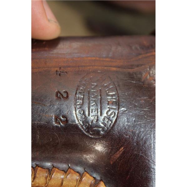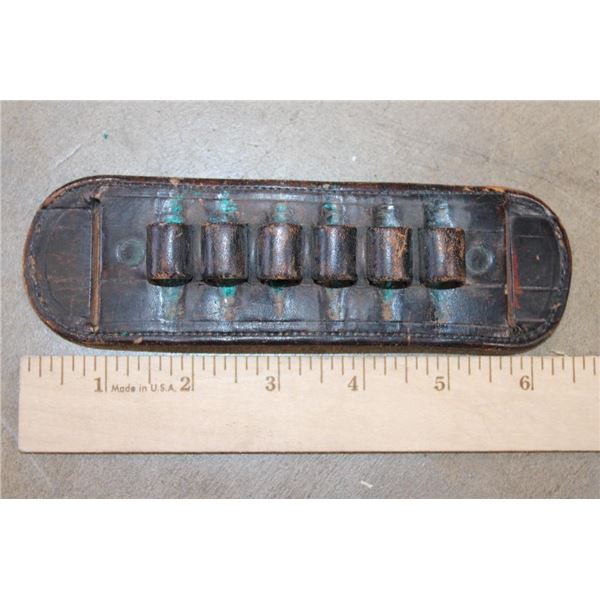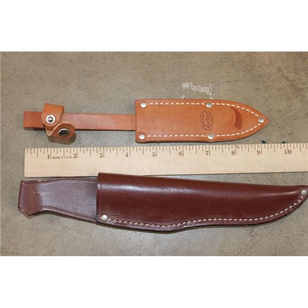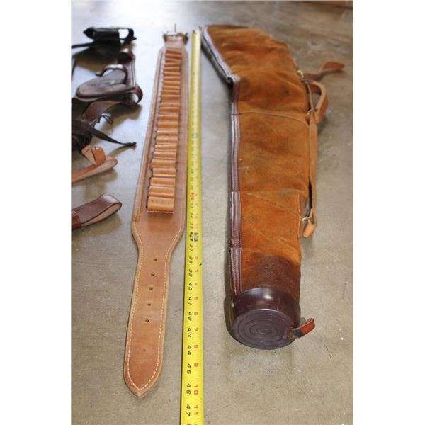 1 Vintage Leather RIFLE CASE, 1 Shell Belt for 12 ga., 3 Holsters, 2 Leather Knife Sheaths, and a Leather Bullet Holder for a Belt (ONE$). GUN HOLSTERS AND ACCESSORIES