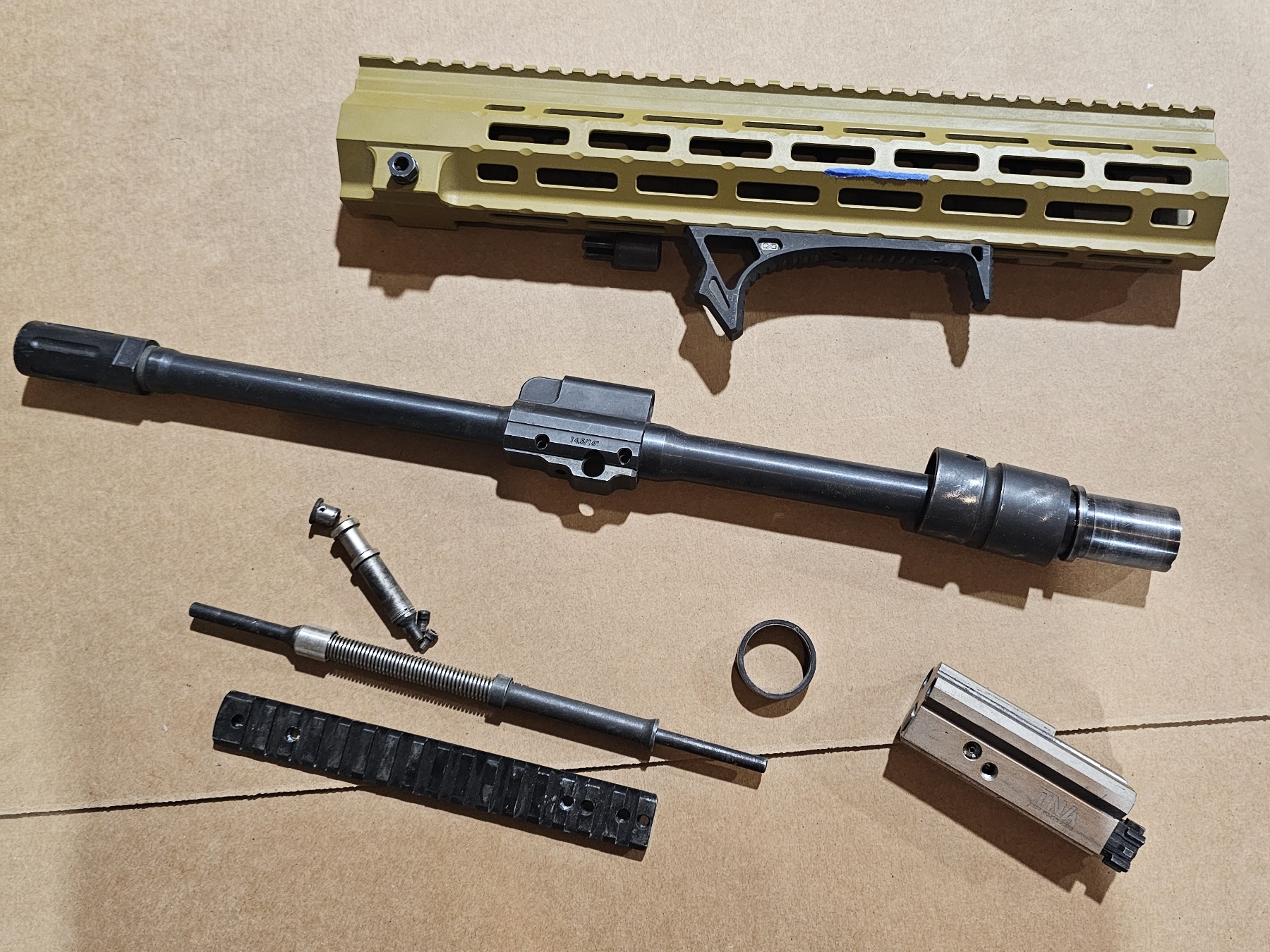 Includes: Midwest Industries handguard. 16.5'' barrel. BRN-4 gas block and piston. Modified bolt carrier group. 1:7 twist barrel. S&J Hardware linear comp. Miscellaneous small parts.