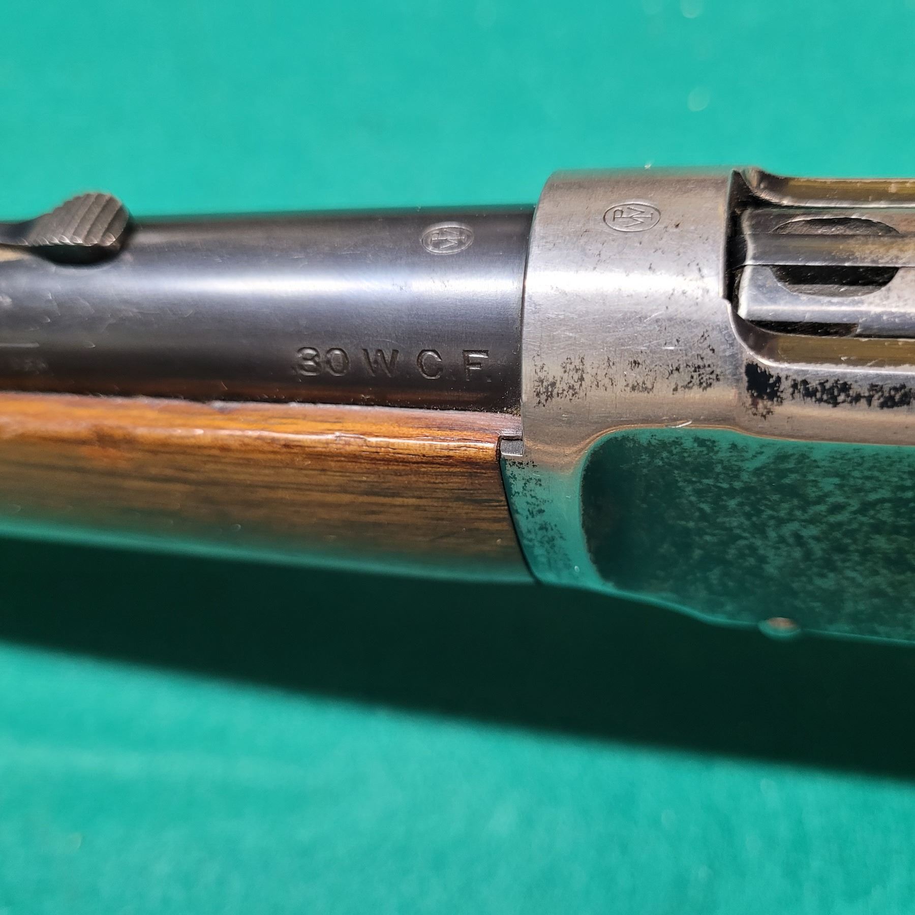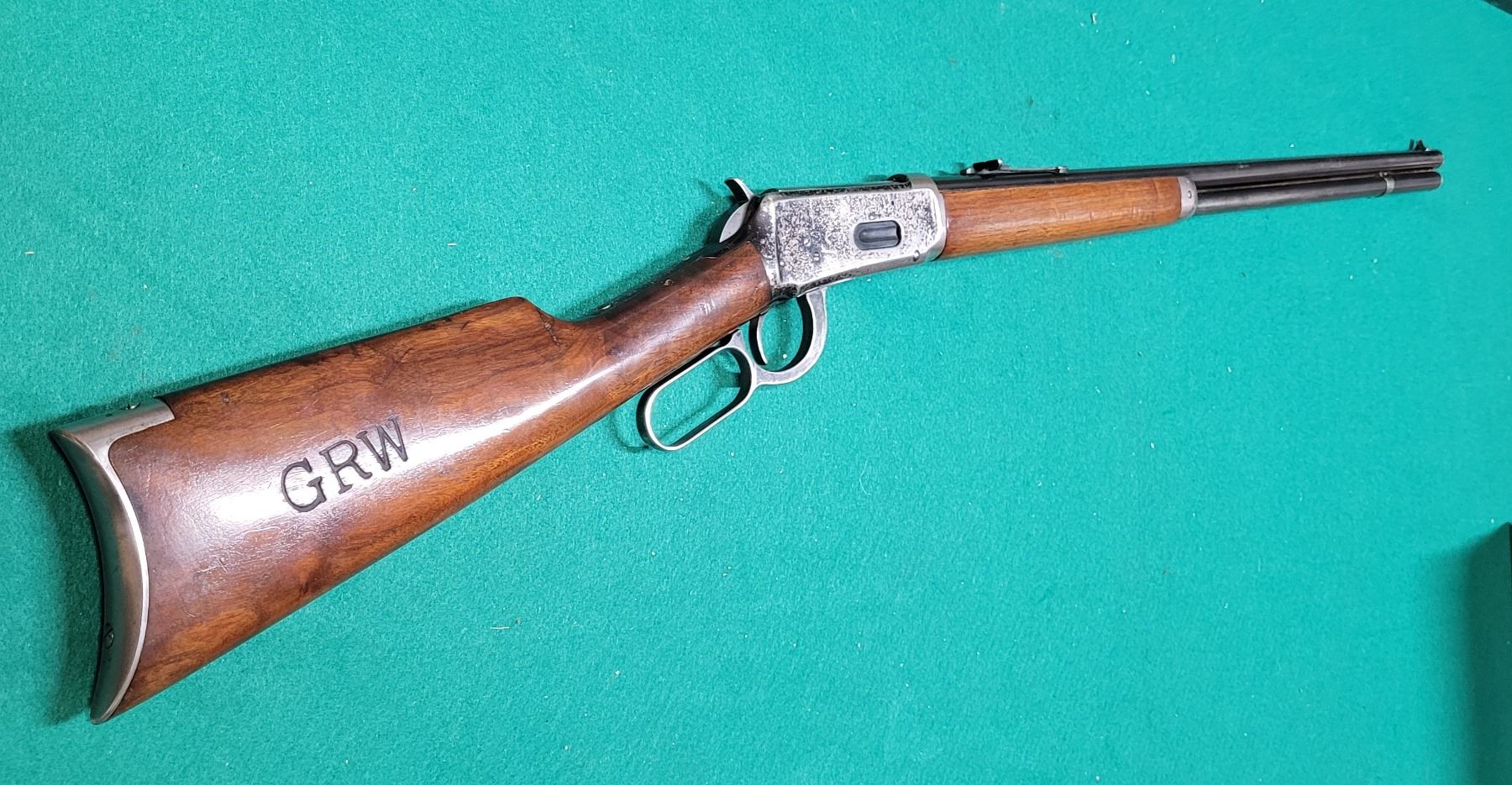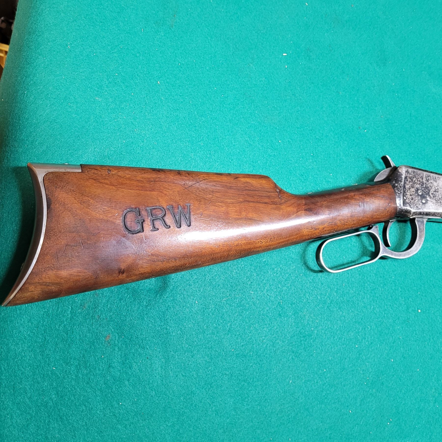 The buttsock has the block letters GRW stamped on the right side. It looks to be burned into the stock using 3/4" Brand. There is also 2 screw holes in the wood on each side of the upper tang. Possibly for an aftermarket receiver sight.