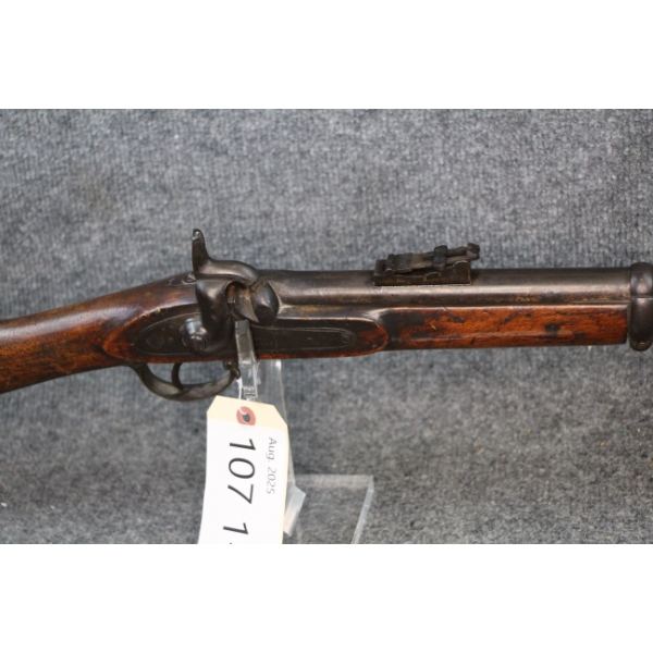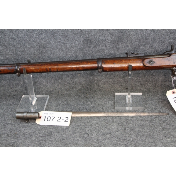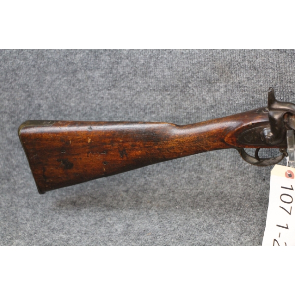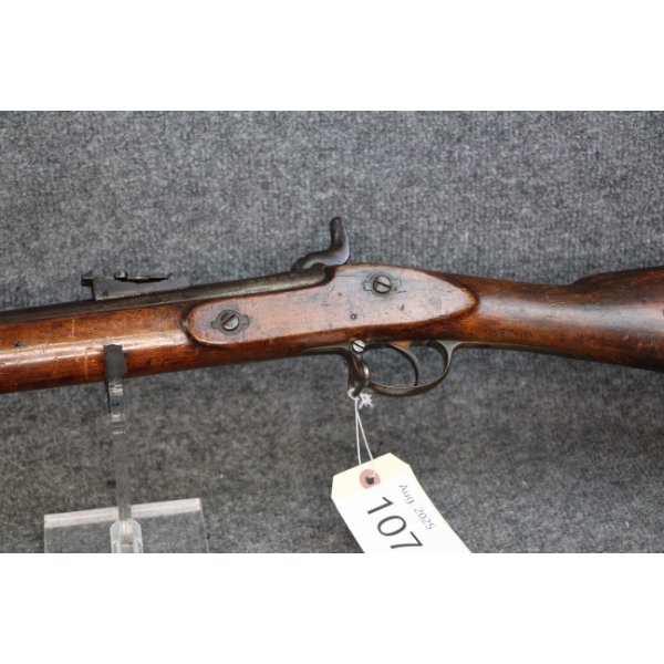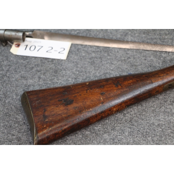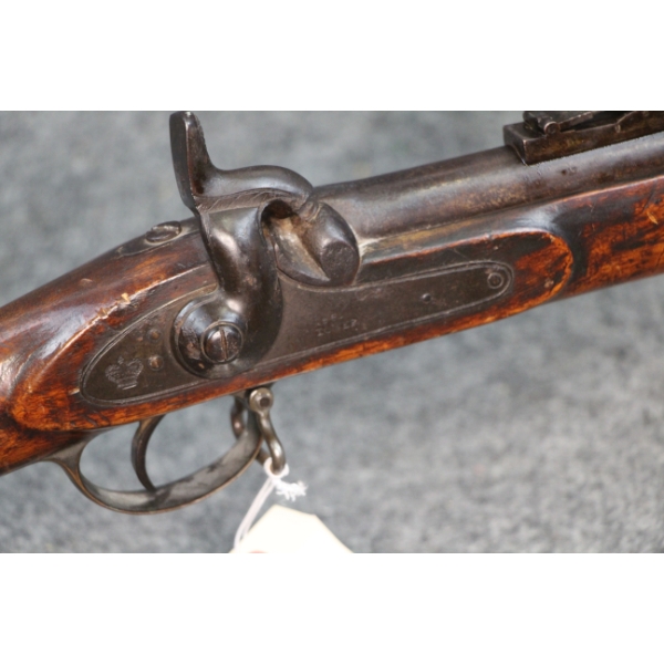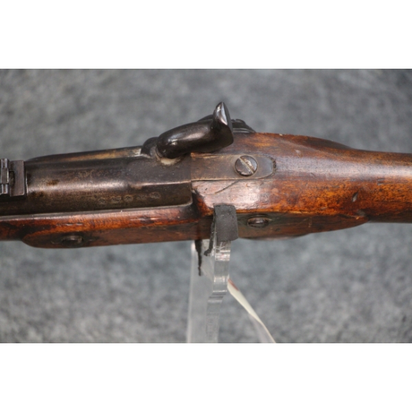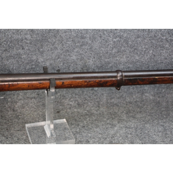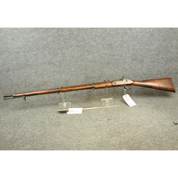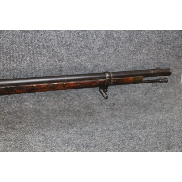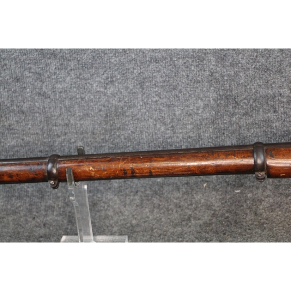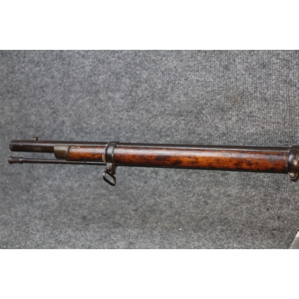 *ANTIQUE. No lic. req.* The term "rifle-musket" originally referred to muskets with the smooth-bored barrels replaced with rifled barrels. The length of the barrels were unchanged, allowing the weapons to be fired in ranks, since a long rifle was necessary to enable the muzzles of the second rank of soldiers to project beyond the faces of the men in front. The weapon would also be sufficiently long when fitted with a bayonet to be effective against cavalry. Such weapons manufactured with rifled barrels, muzzle loading, single shot, and utilizing the same firing mechanism,[2] also came to be called rifle-muskets.