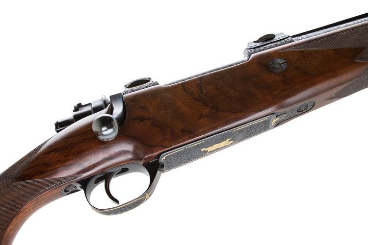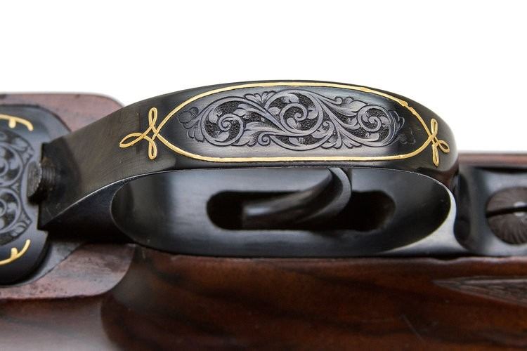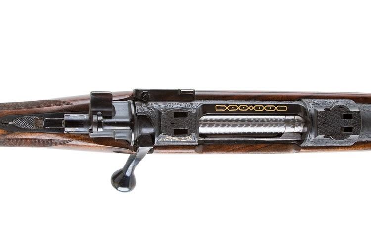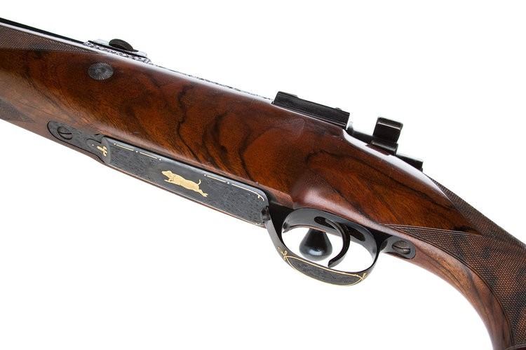 • Intricate hand-engraving throughout the receiver, floorplate, and trigger guard—highlighted with gold inlays, including animal motifs that pay homage to classic African game scenes.