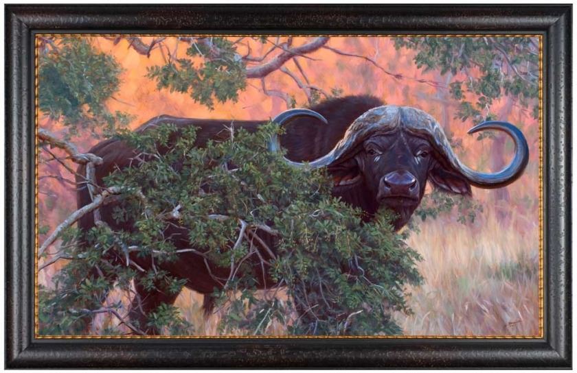“Hunting my first cape buffalo, with Phillip Reed of Zambezi Hunters in the Save Conservancy, was a life changing experience. Over several days of stalking the 150 plus herd of Nyati, I was never so aware of every sound and smell - all my senses seemed as if they were electrified. Even though we were trying to get close enough for a clean shot, I could not help but be transfixed by the golden, even light juxtaposed with the steel umber hue of the buffalo torsos....and the shimmer of sunlight on their horns seemed as if they wore “helmets of black gold". The intimacy one attains with a buffalo during such a hunt is etched in your mind for life.” –John Banovich