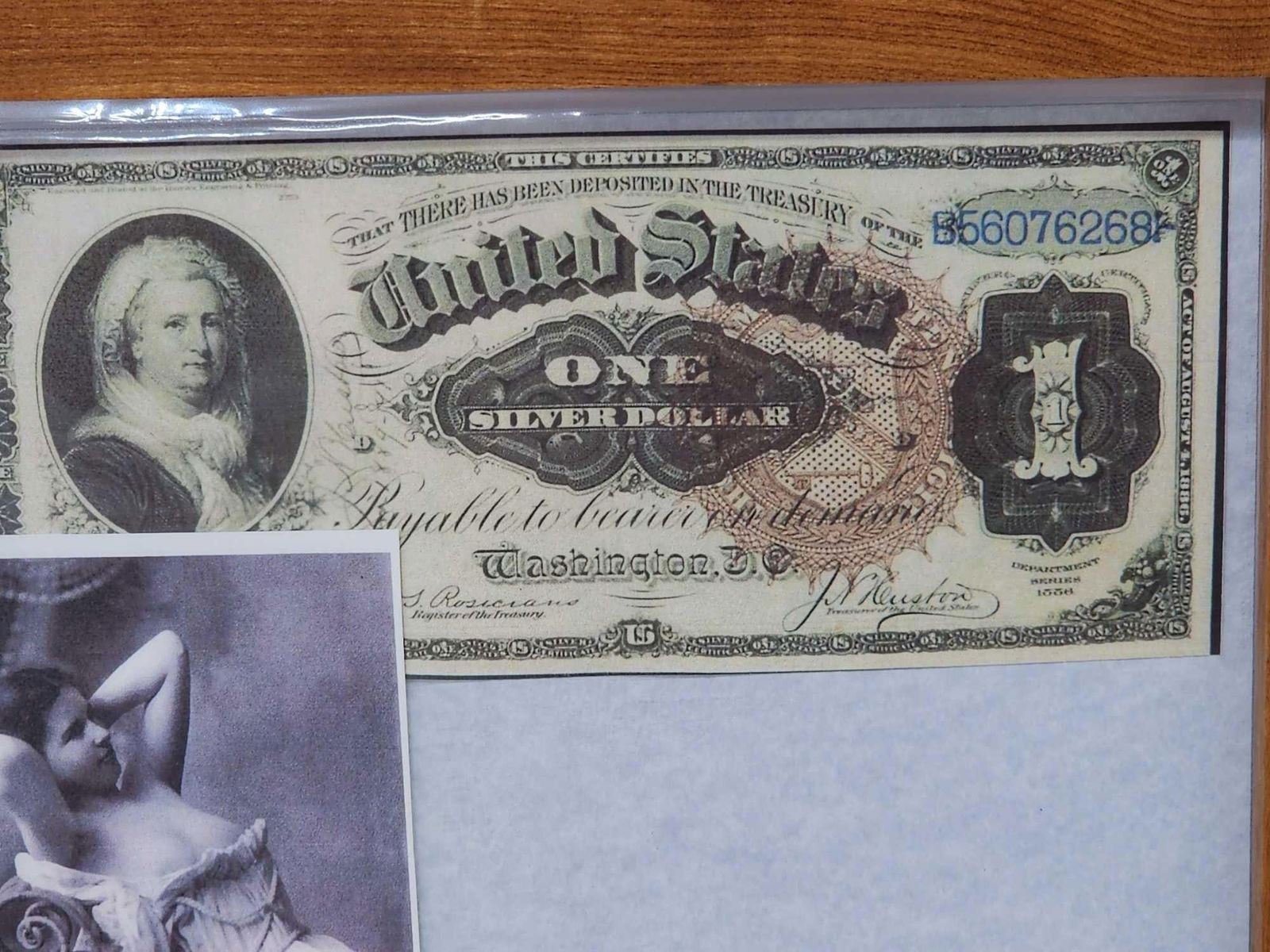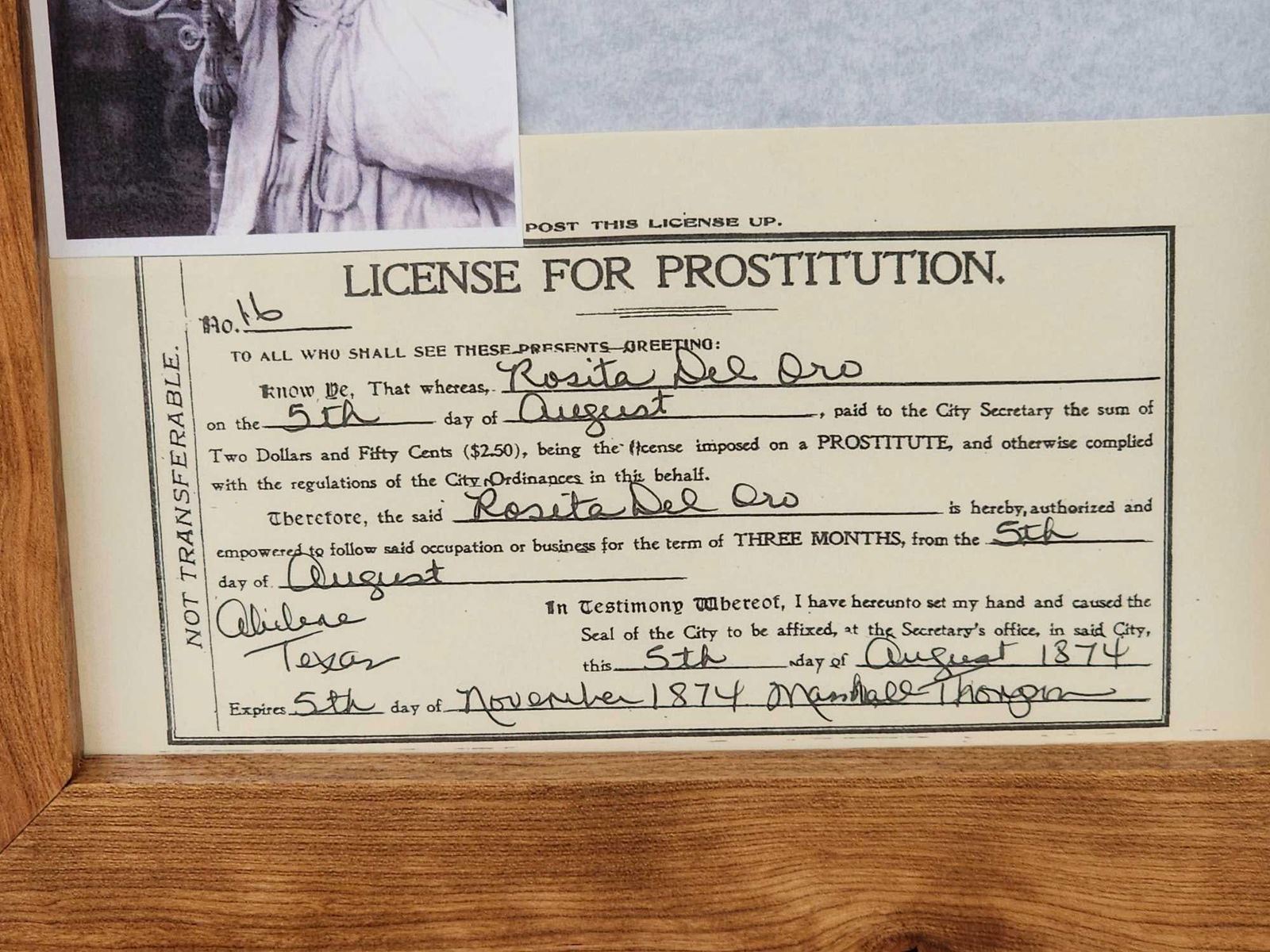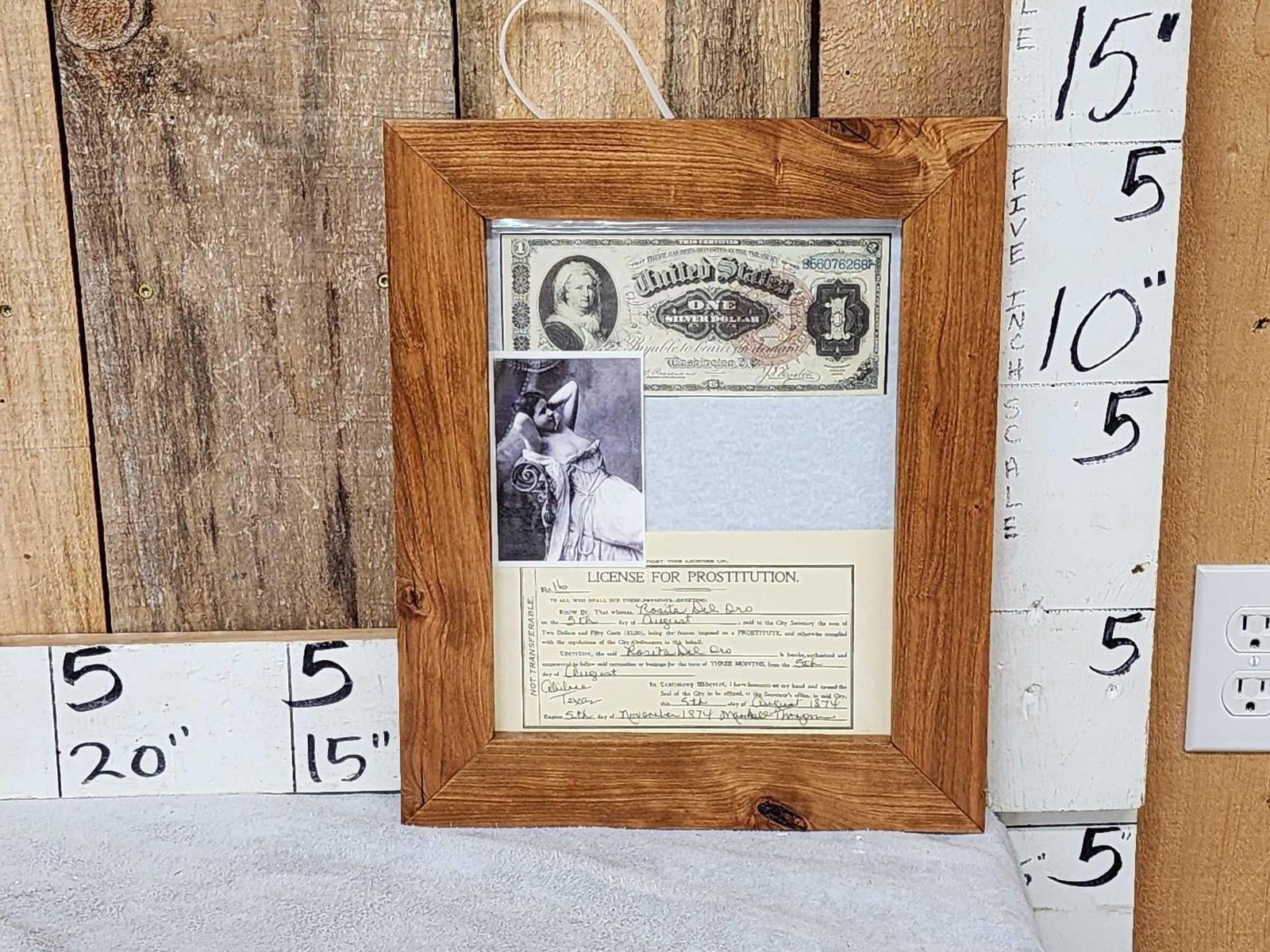 1.31 Issued to Rosita Del Oro Abilene Texas great conversation piece in hand Made cherry wood frame
