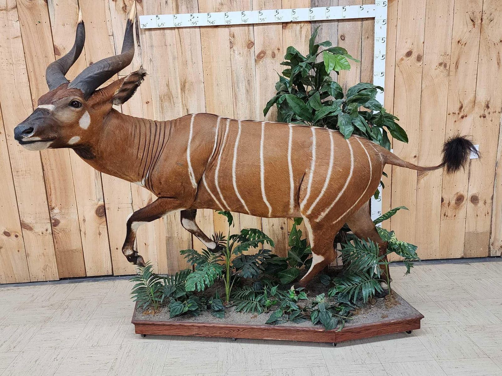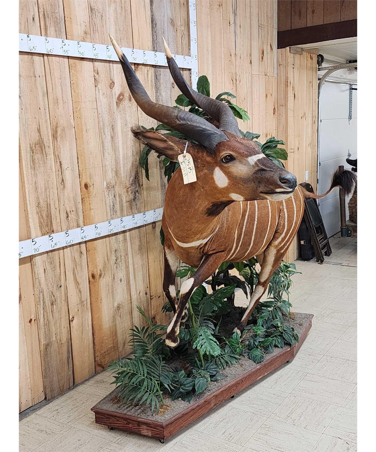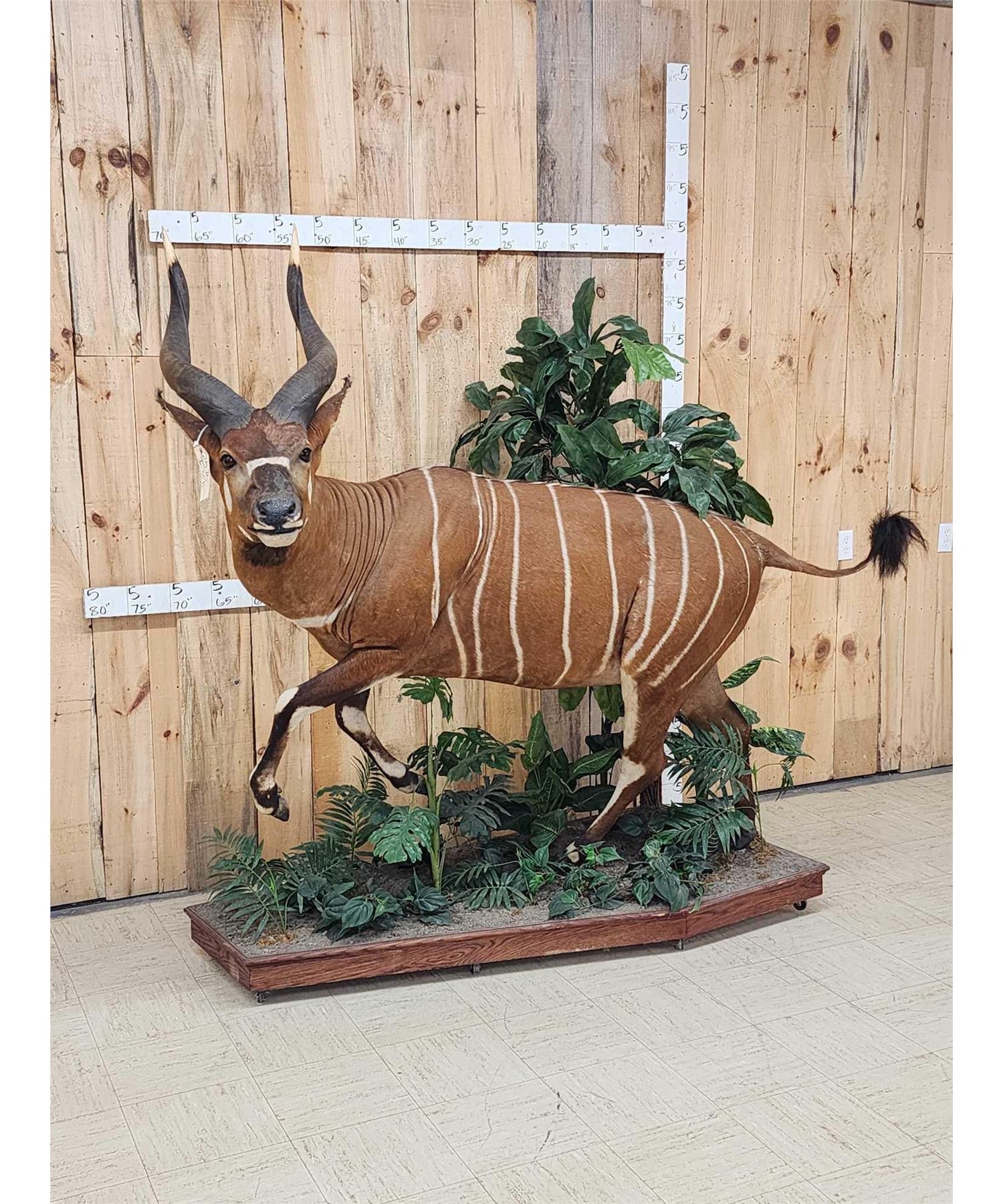 25.15 Awesome color markings big horns on roll around habitat base. A Bongo hunt is QUITE expensive to go on let alone the Taxidermy fees take advantage of this opportunity to invest in this world class specimen for your collection overall dimensions about 75" long x 66" wide x 79" tall