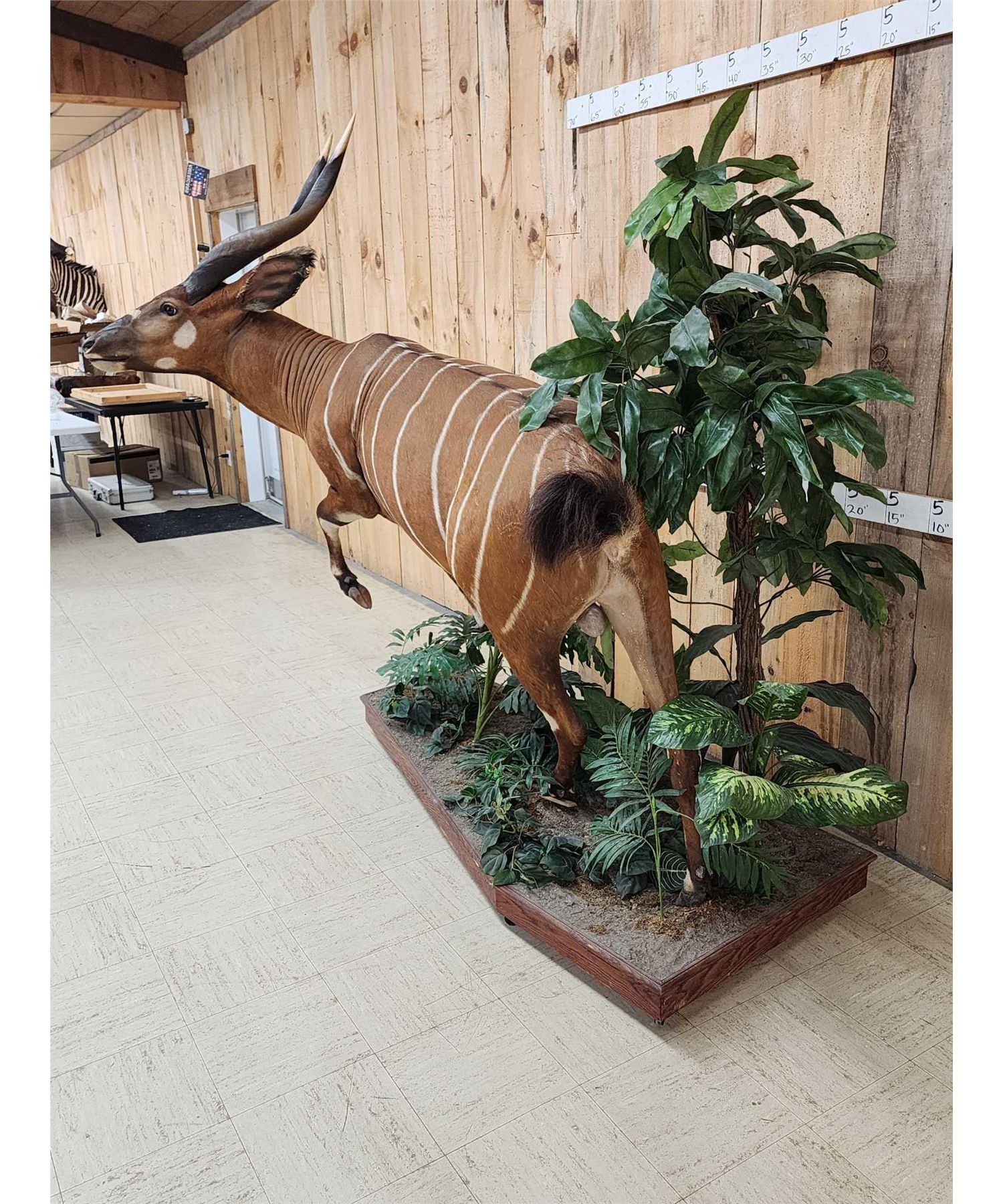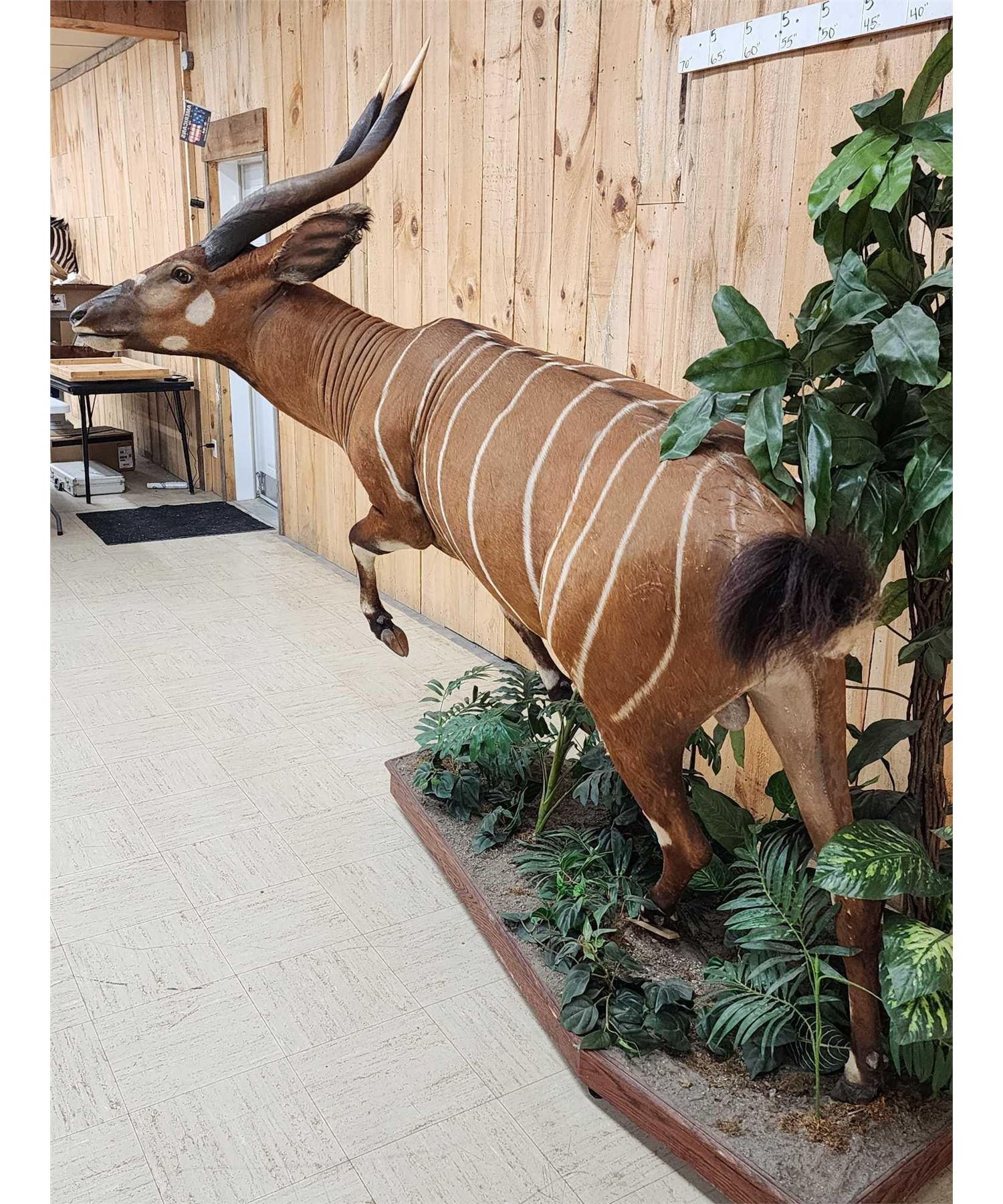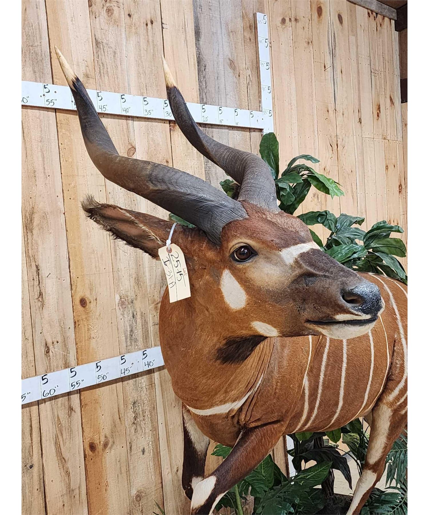 25.15 Awesome color markings big horns on roll around habitat base. A Bongo hunt is QUITE expensive to go on let alone the Taxidermy fees take advantage of this opportunity to invest in this world class specimen for your collection overall dimensions about 75" long x 66" wide x 79" tall
