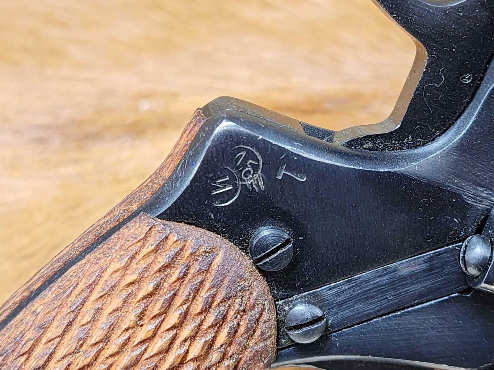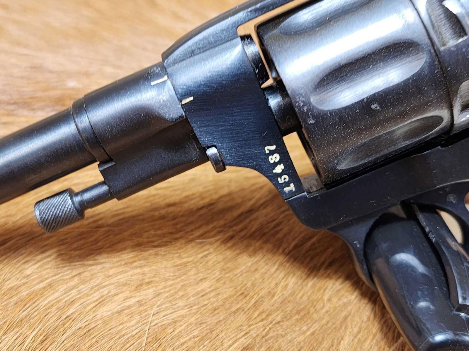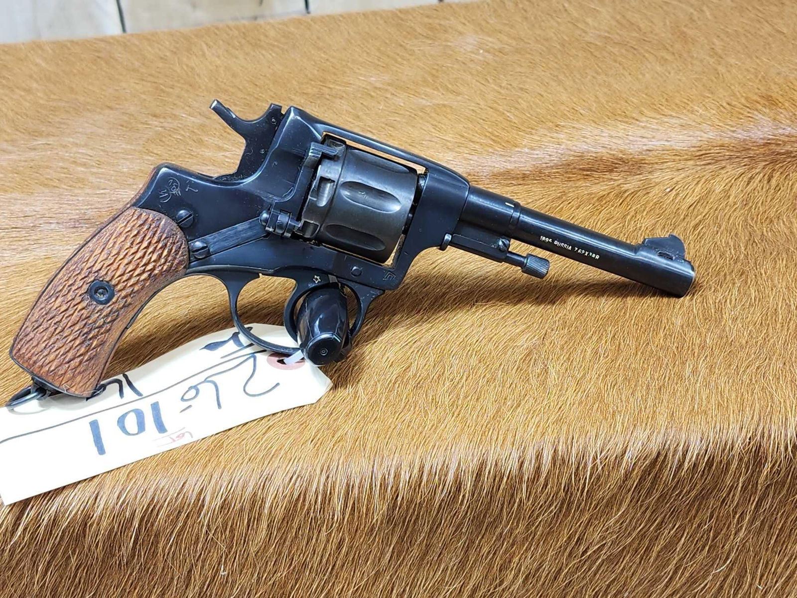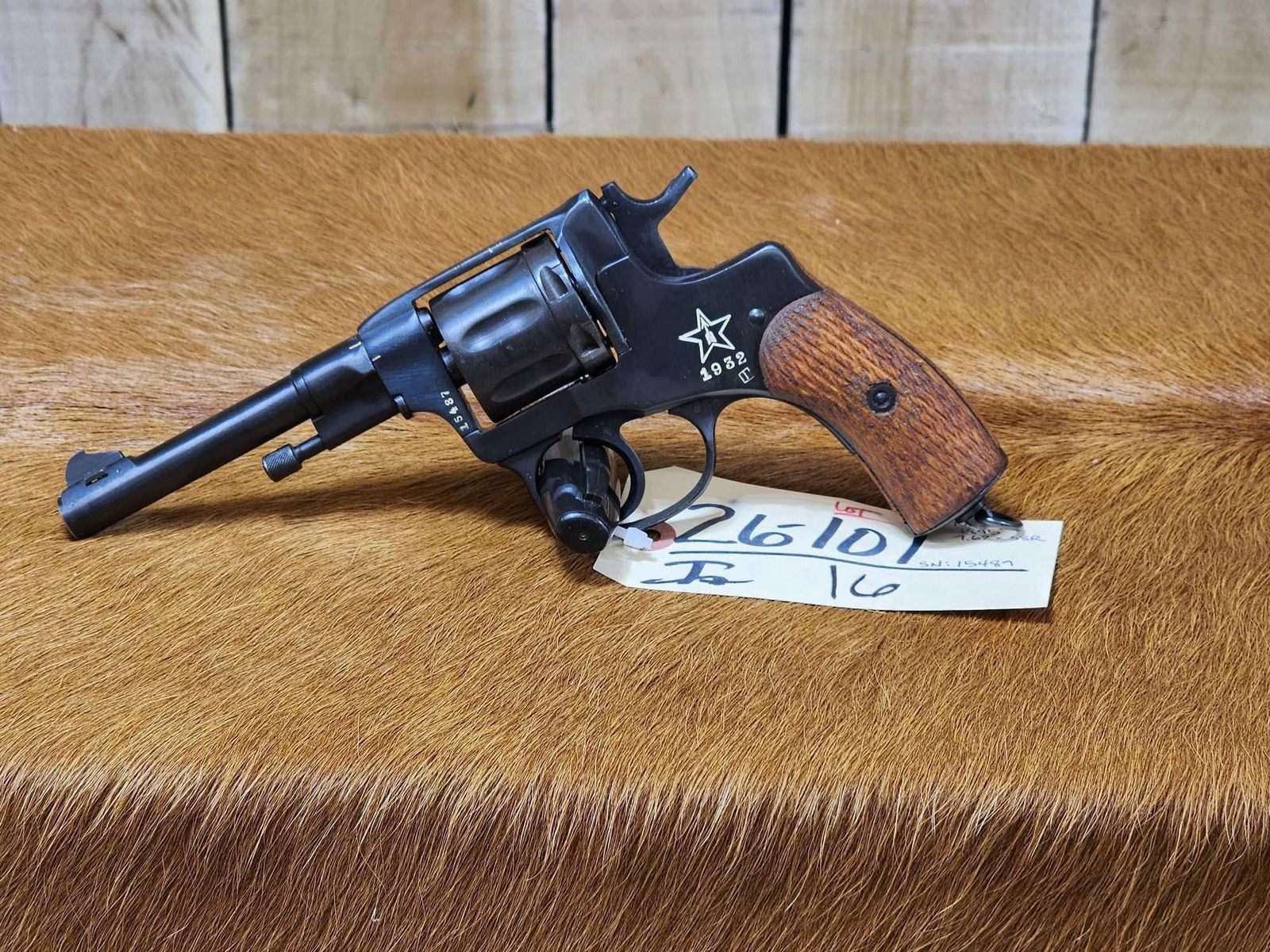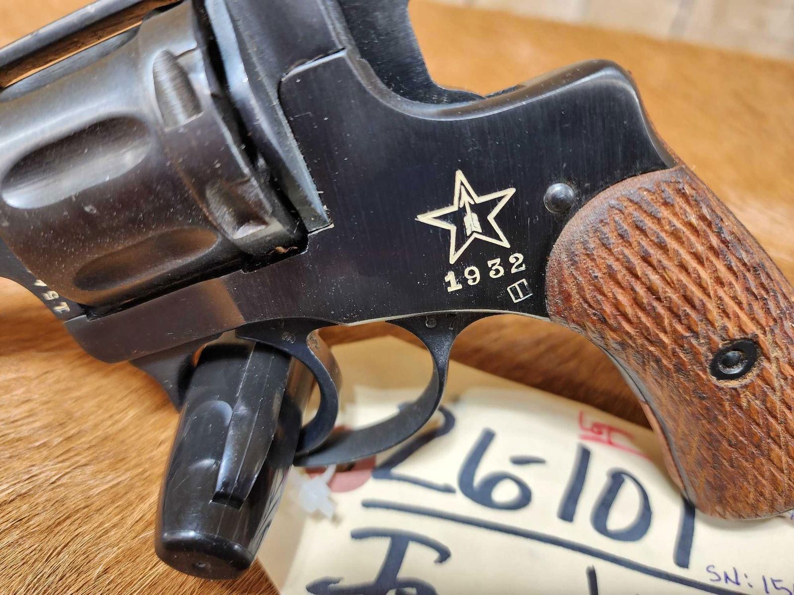 26.101. Lanyard ring. 4 1/2 Inch barrel Russia stamped on barrel. Star with arrow inside on left side. Wood grips. 1932 manufactureSN 15487