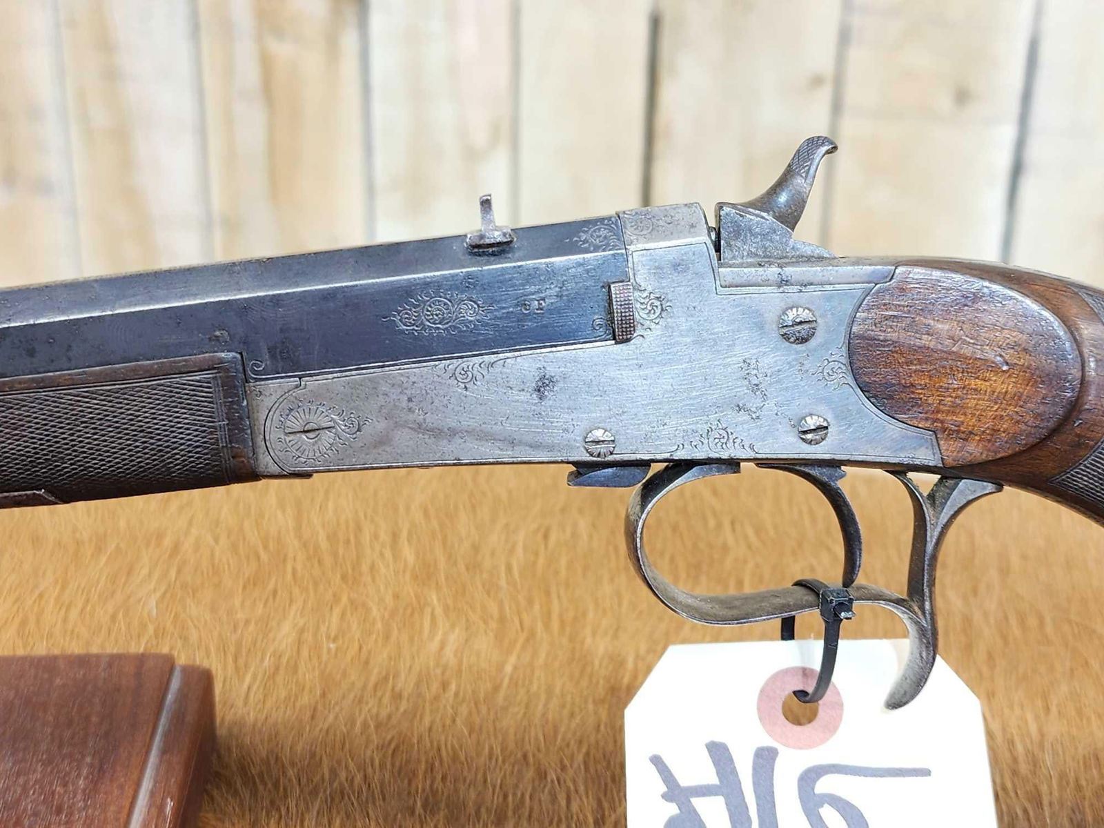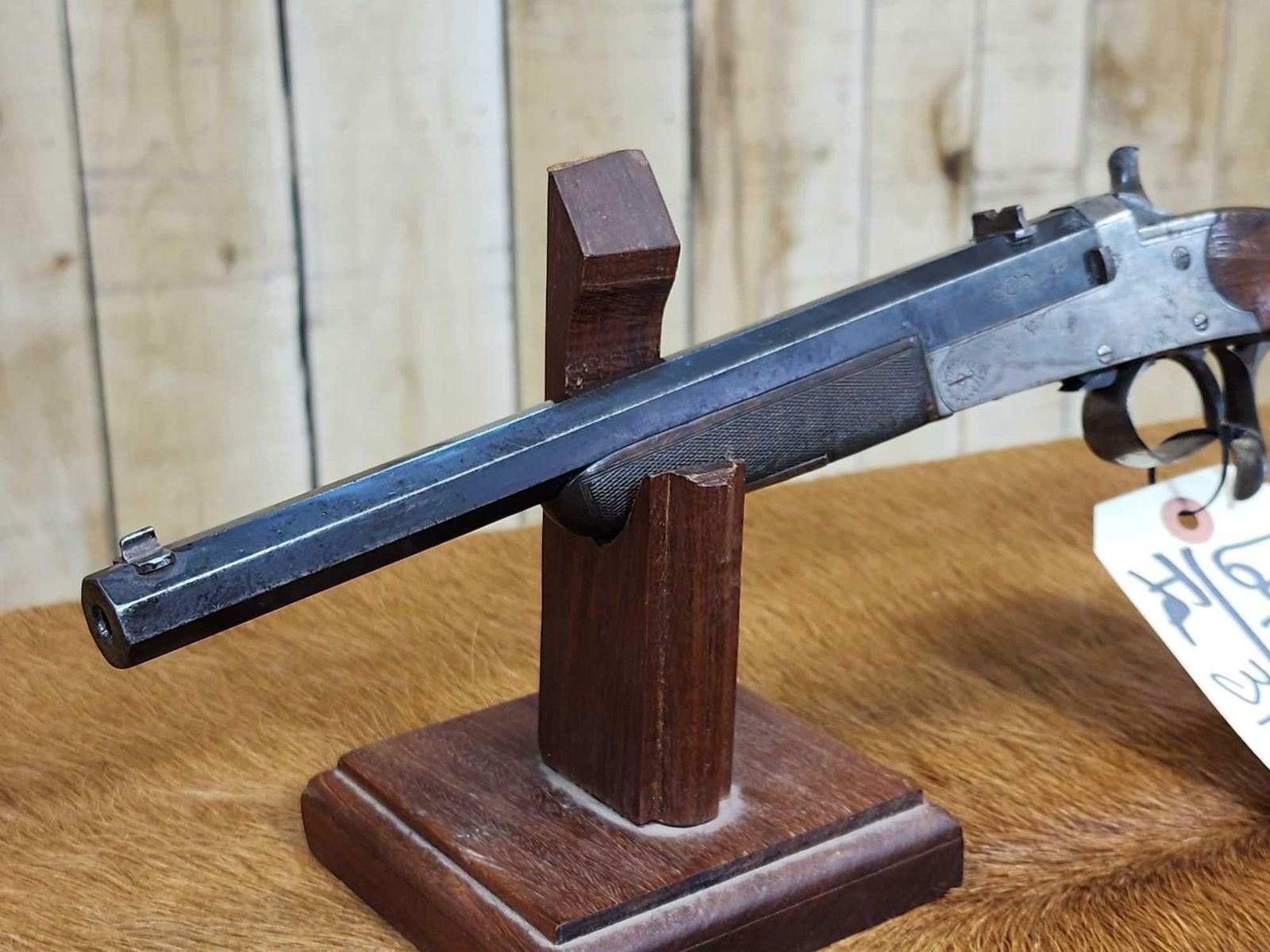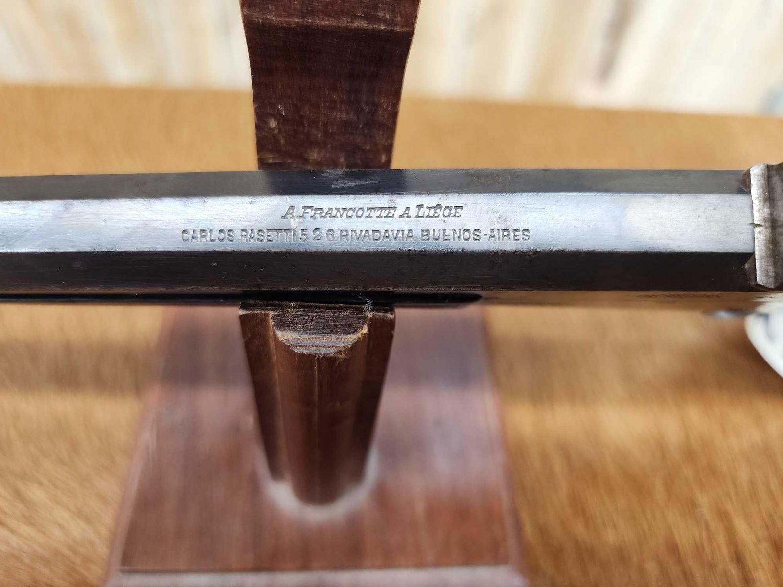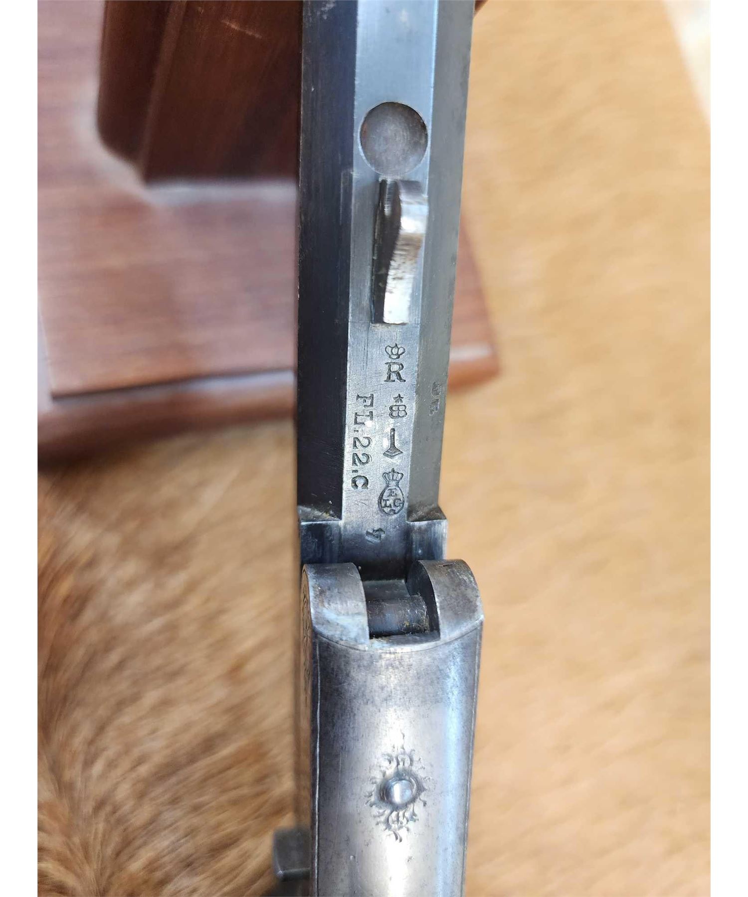 69.47 Belguim made bore measures 22 thoudandths probably .22 Flobert Importedr to Buenos Aires Carlos Rasetti 10" octagon barrel shiny bore good rifling crisp action ornate piece Chambers a .22 Short no problem Circa 1900 SN 565