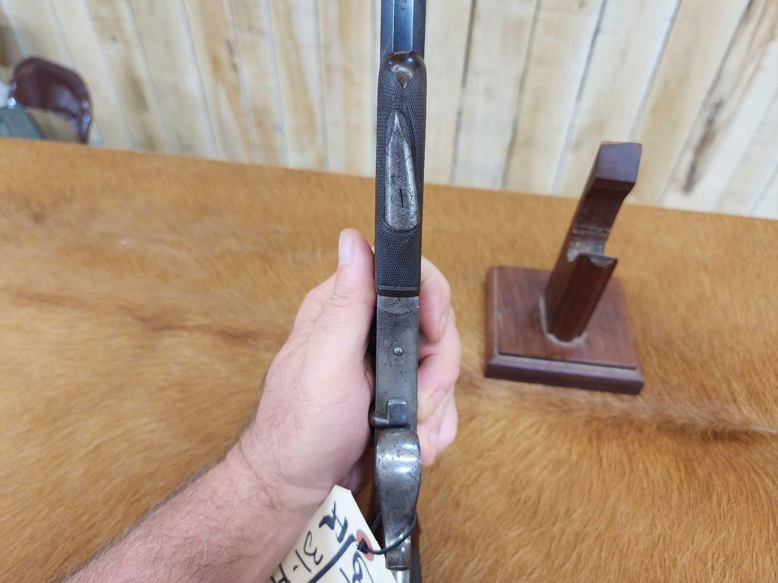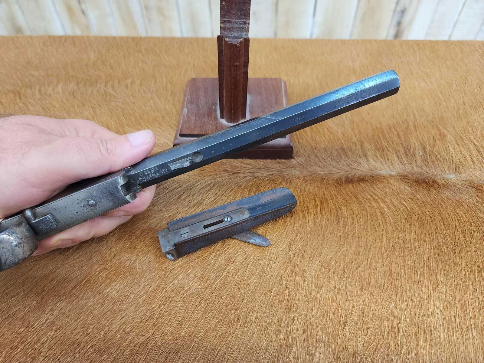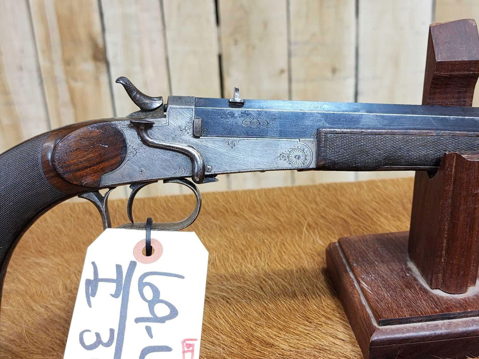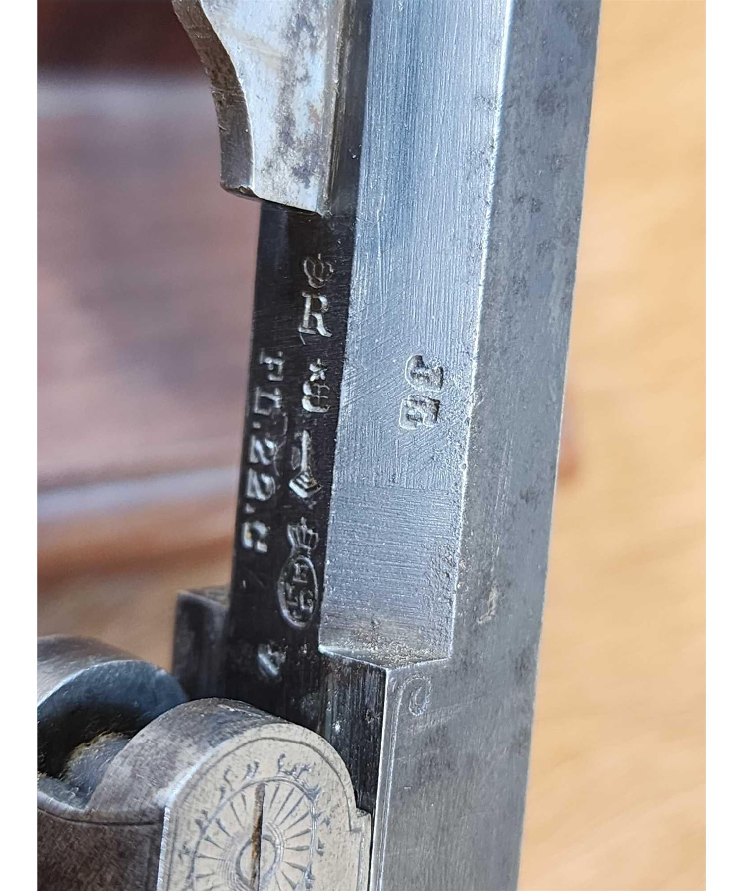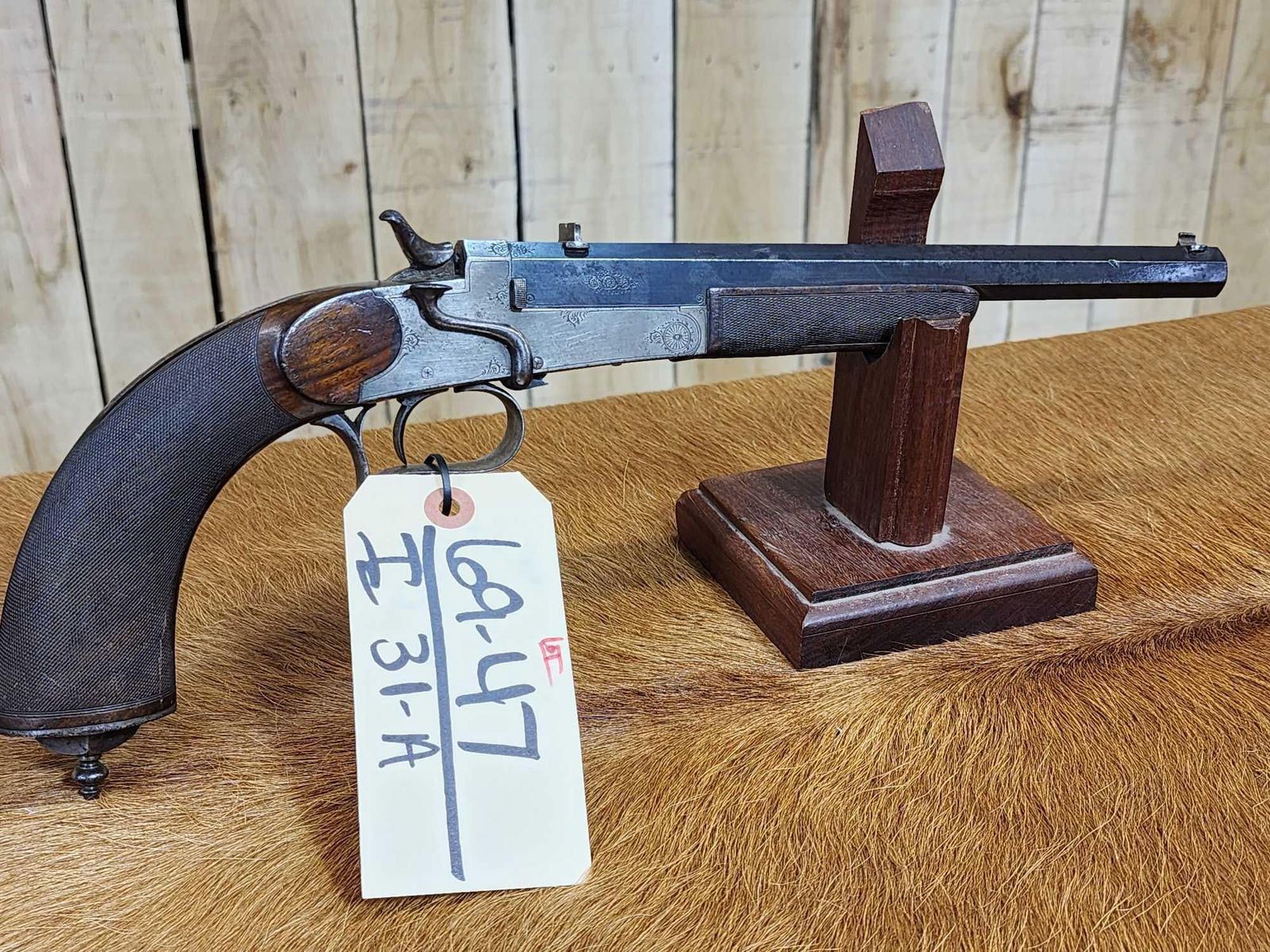 69.47 Belguim made bore measures 22 thoudandths probably .22 Flobert Importedr to Buenos Aires Carlos Rasetti 10" octagon barrel shiny bore good rifling crisp action ornate piece Chambers a .22 Short no problem Circa 1900 SN 565