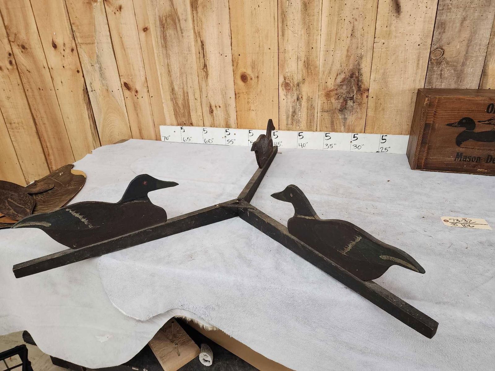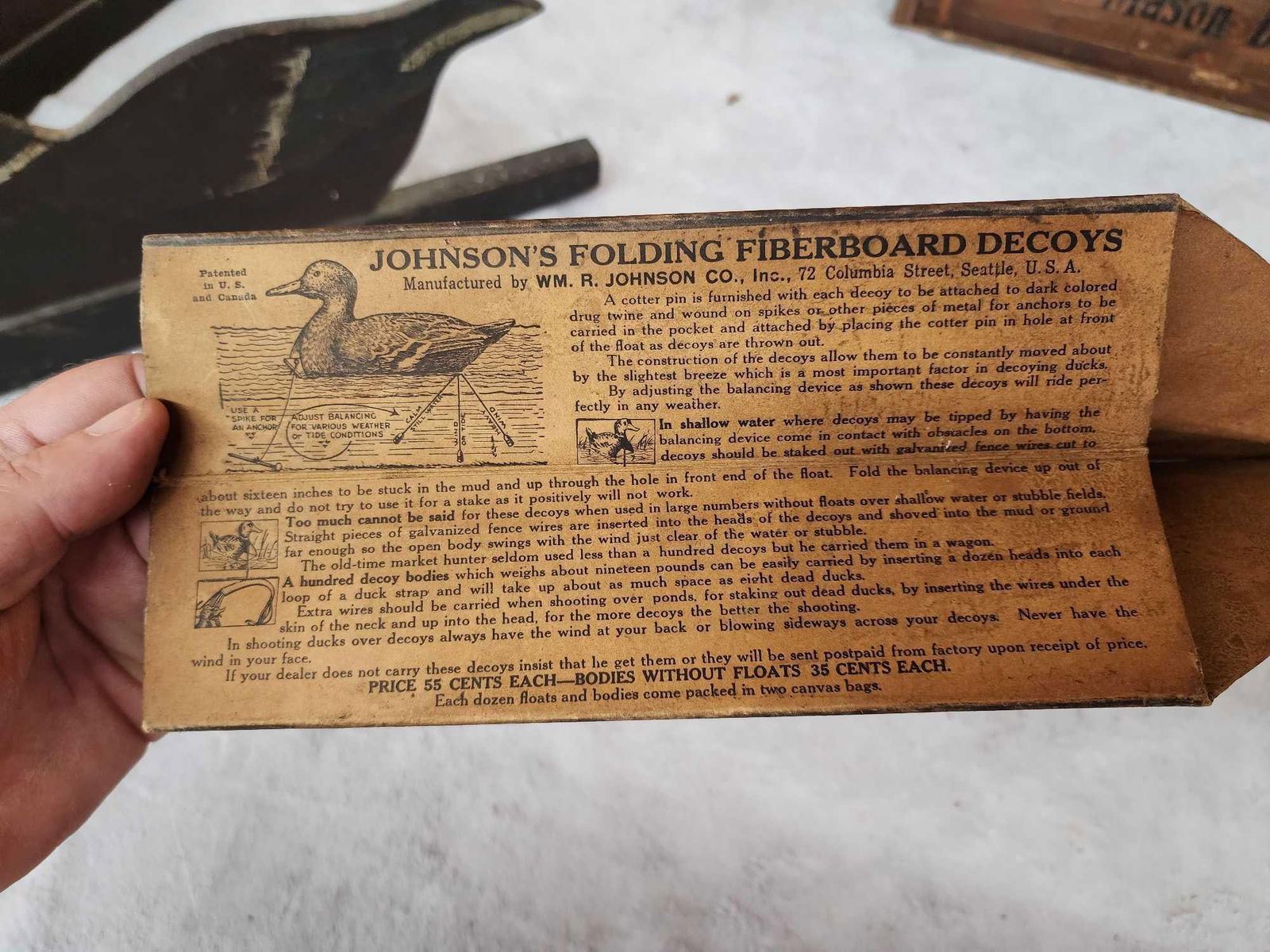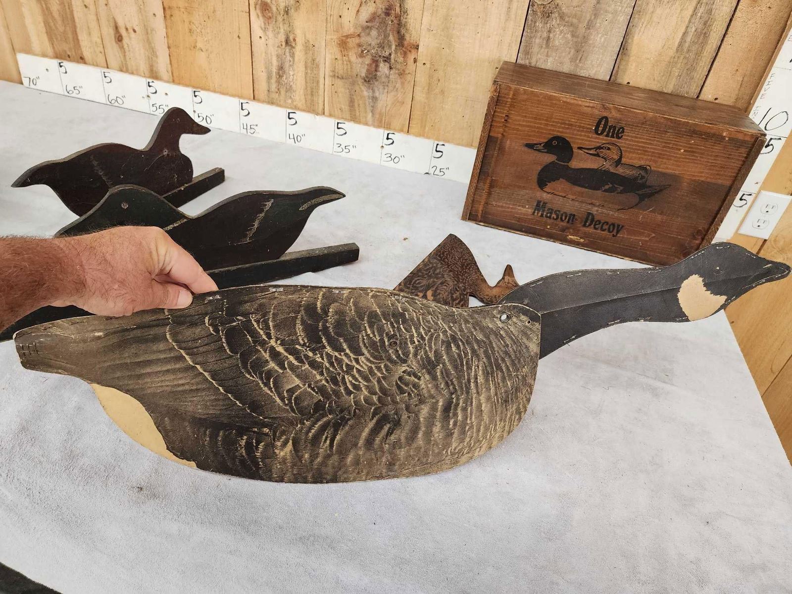 73.32 Includes 2 Johnson's folding fiber board folding decoys , Folk art triple folding decoy Mason Decoy wooden box