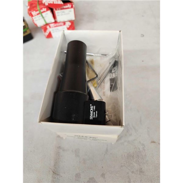 89.9 Includes BSA Spotting scope , BSA red dot sight , Tasco scope , Simmons Bore Sight , 20ga turkey loads .22 Ammunition, projectile Bullets powder disks one money buys the lot