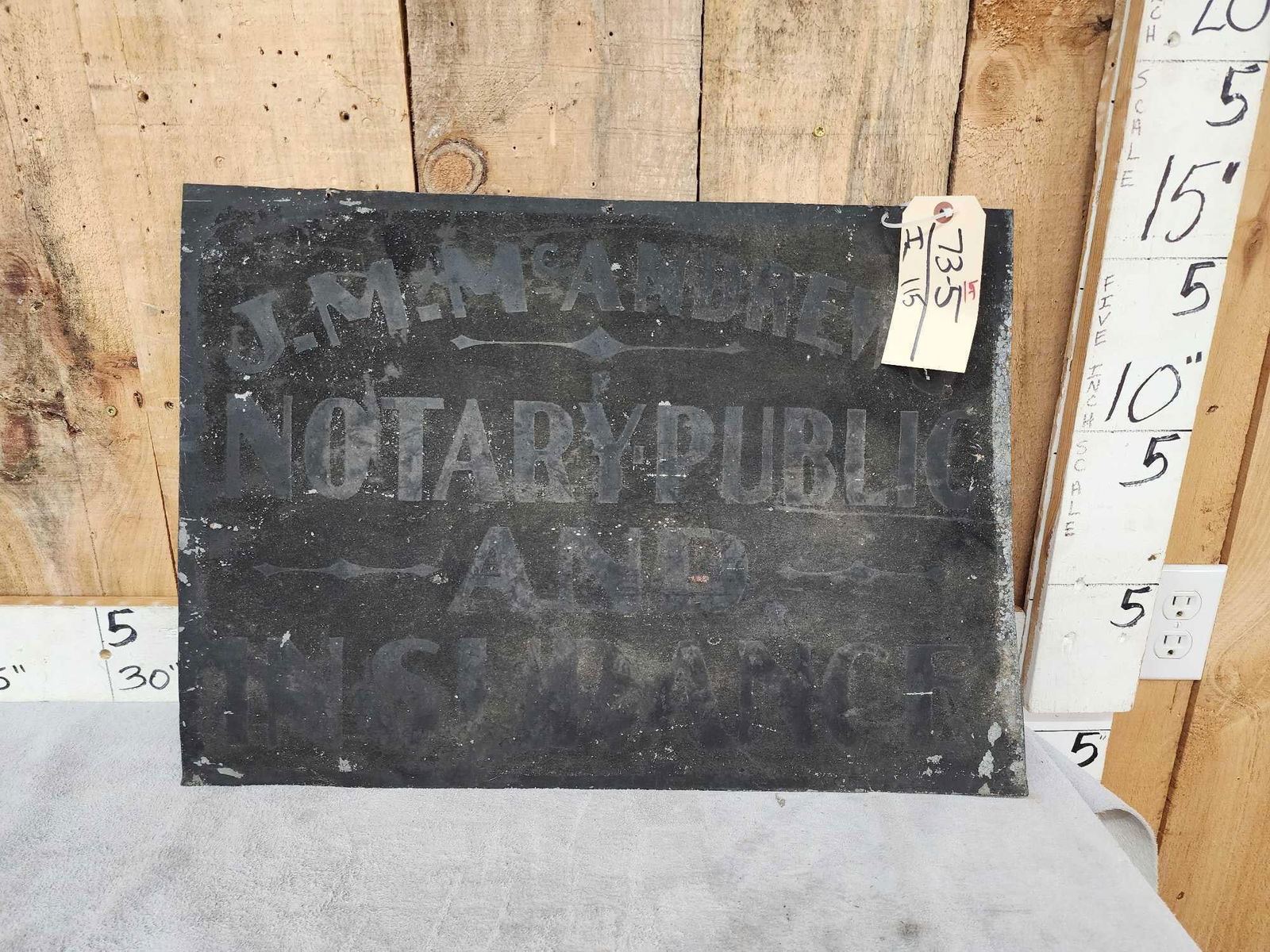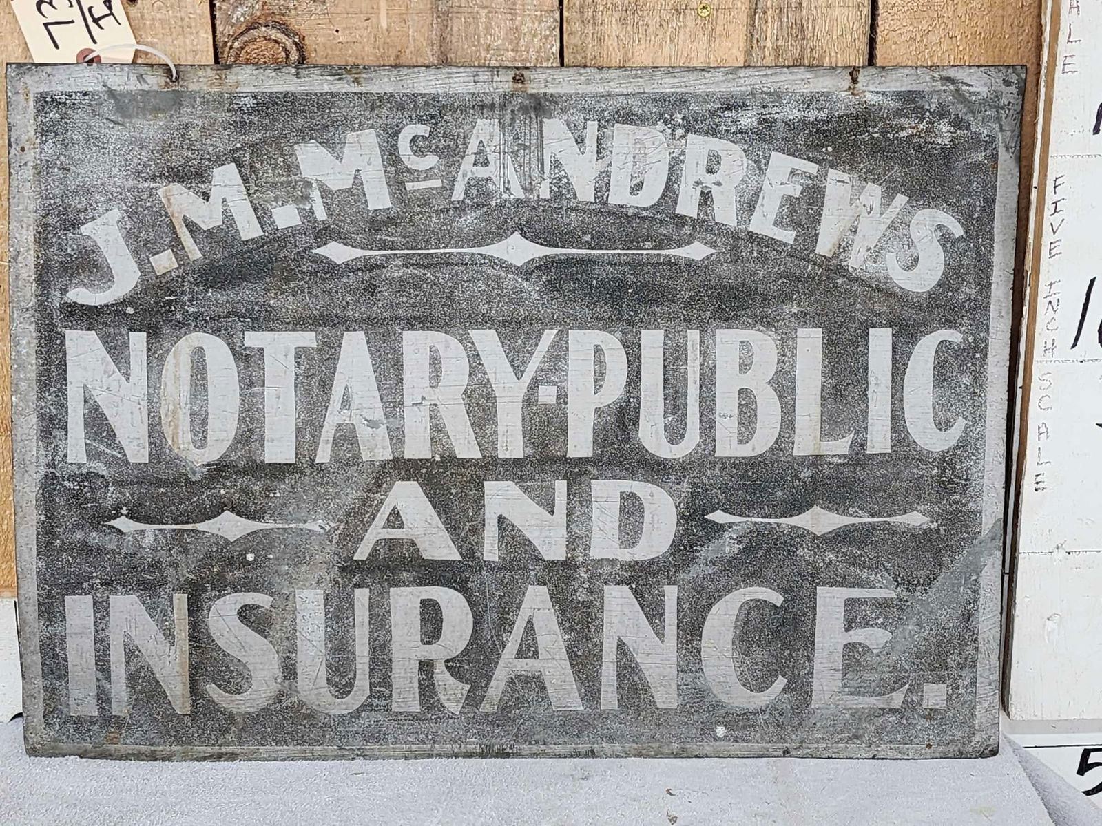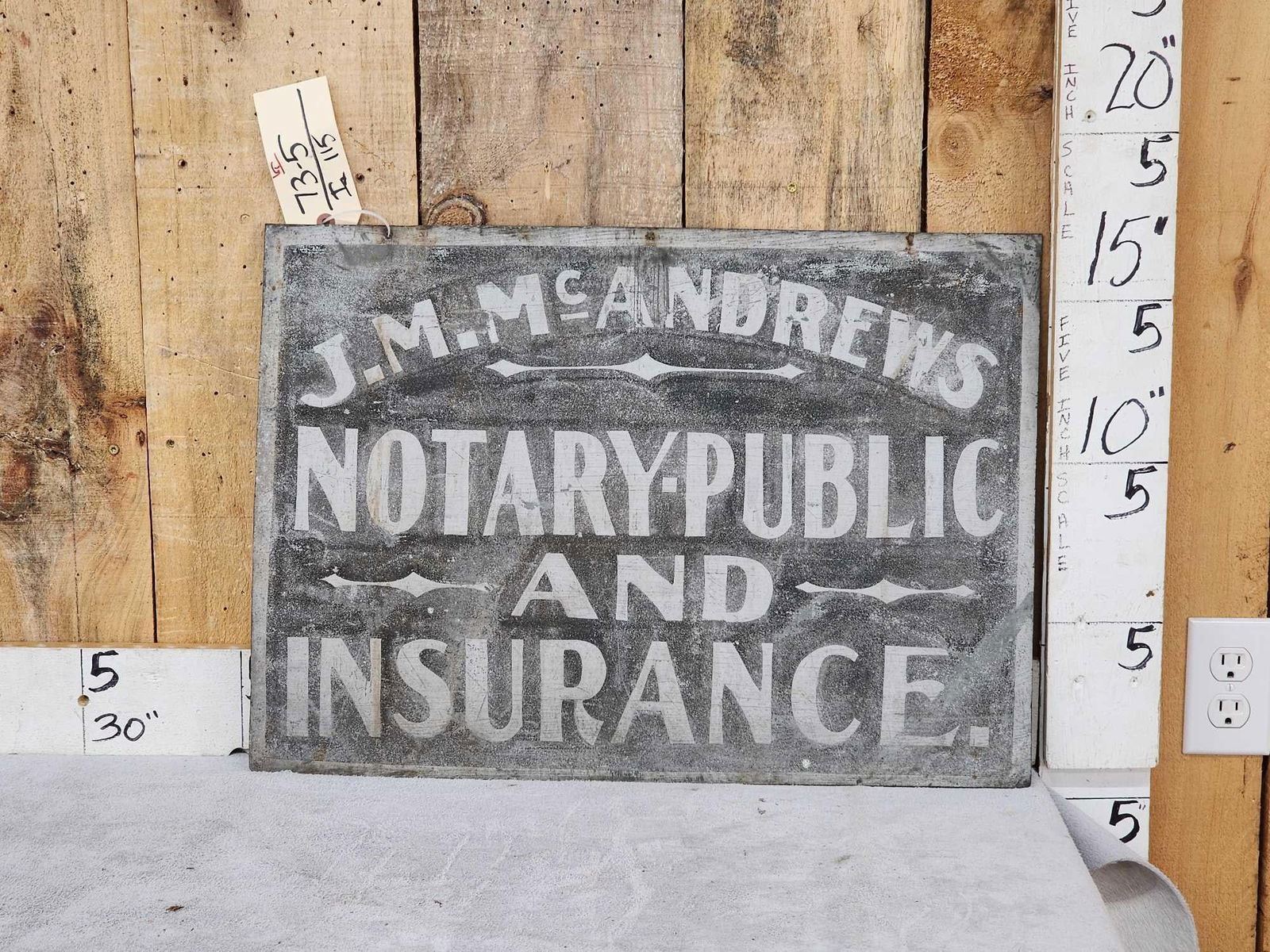 Lot 115 Vintage J.M. McAndrews Notary Public & Insurance Tin Sign