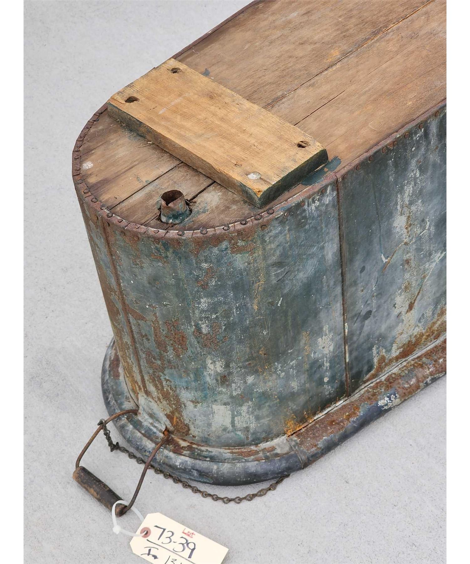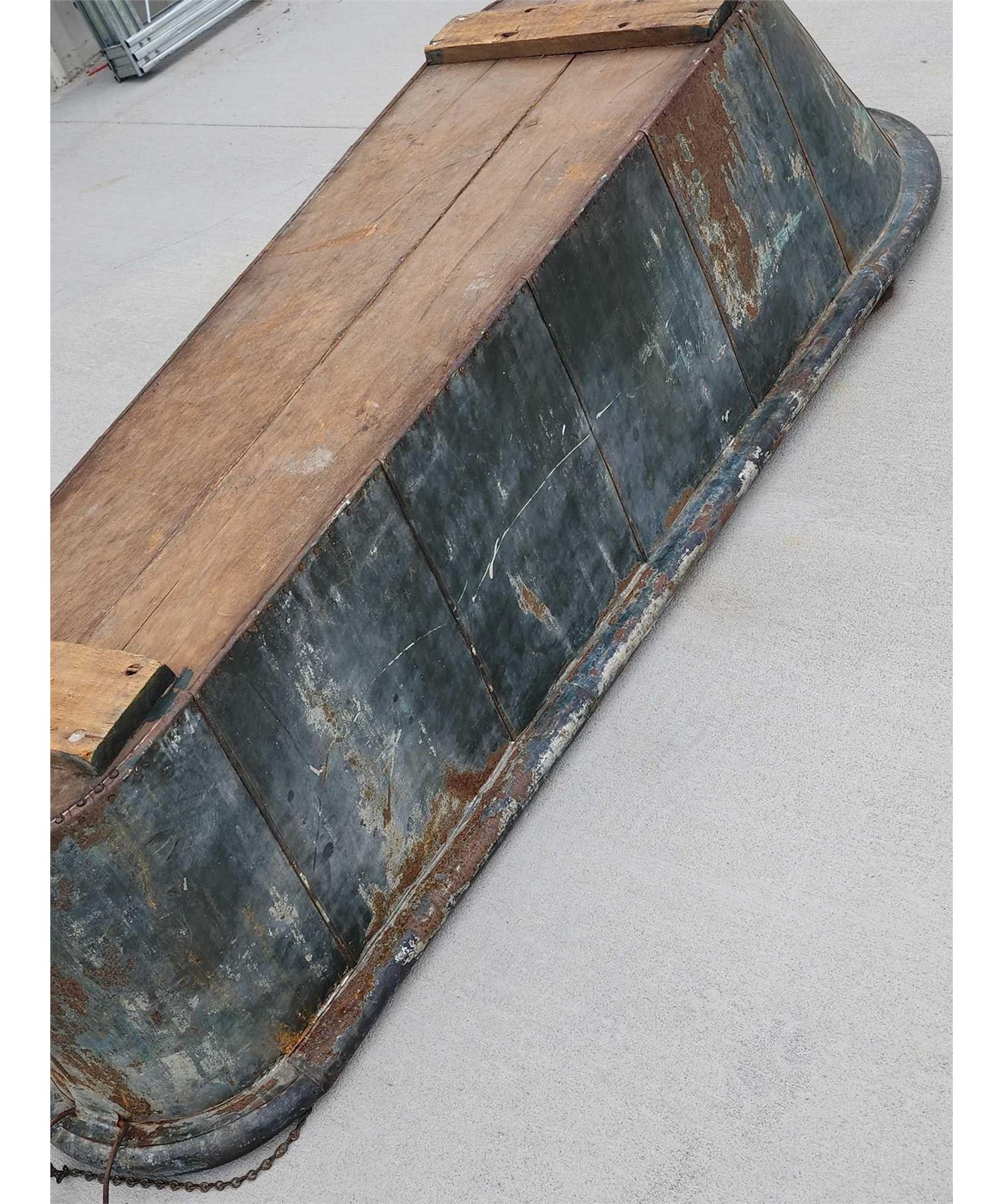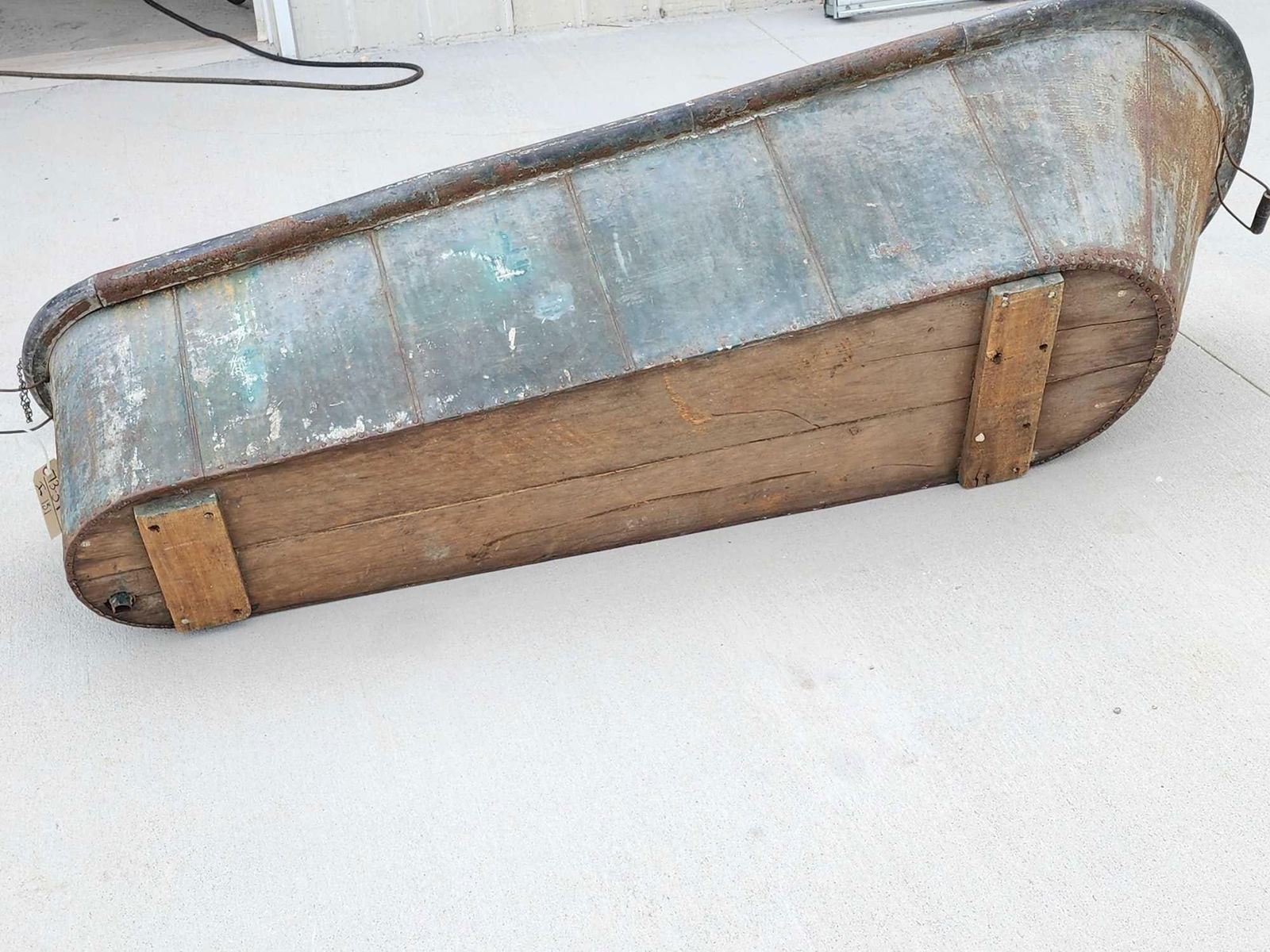 73.39 Constructed from Zinc with a wood bottom complete with what appears to be the original drain plug with a handle on each end awesome authentic piece about 80" long x 14" wide at the narrow end 27" at the wide end x 19" tall