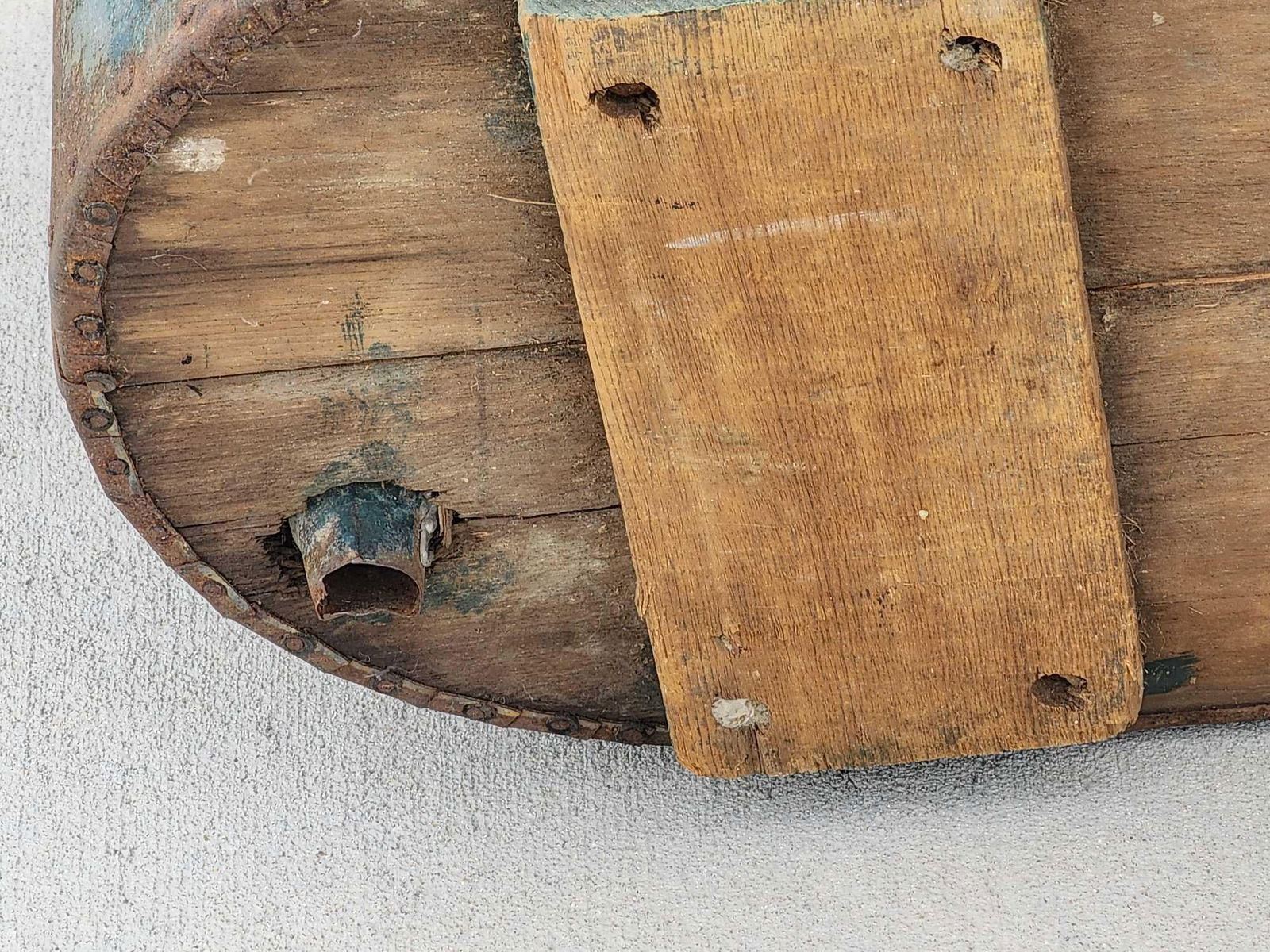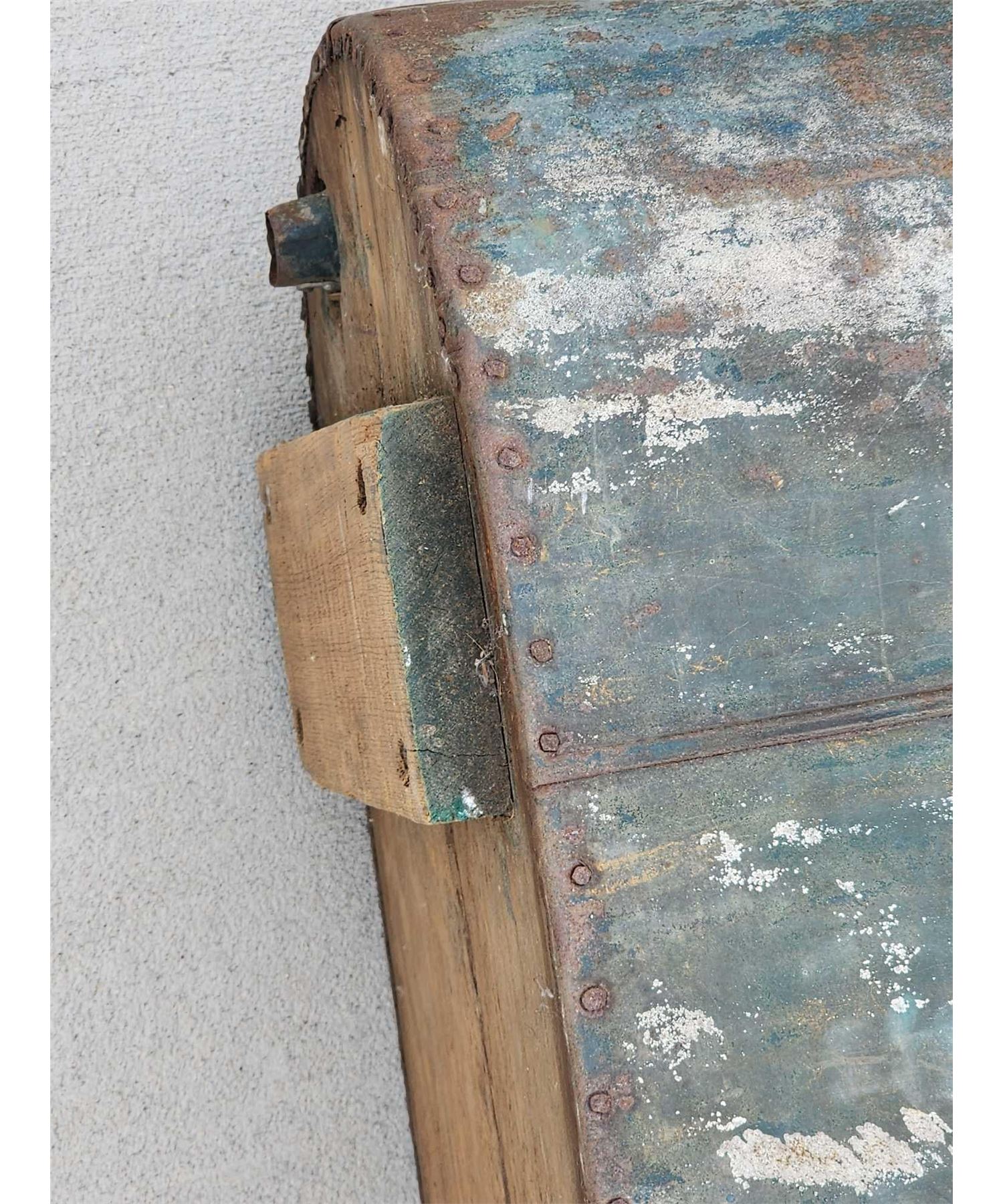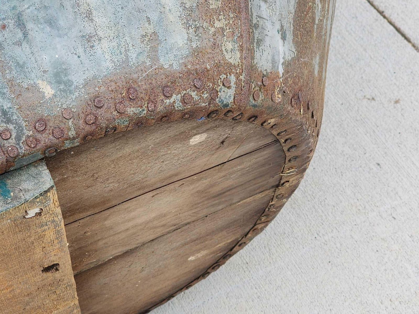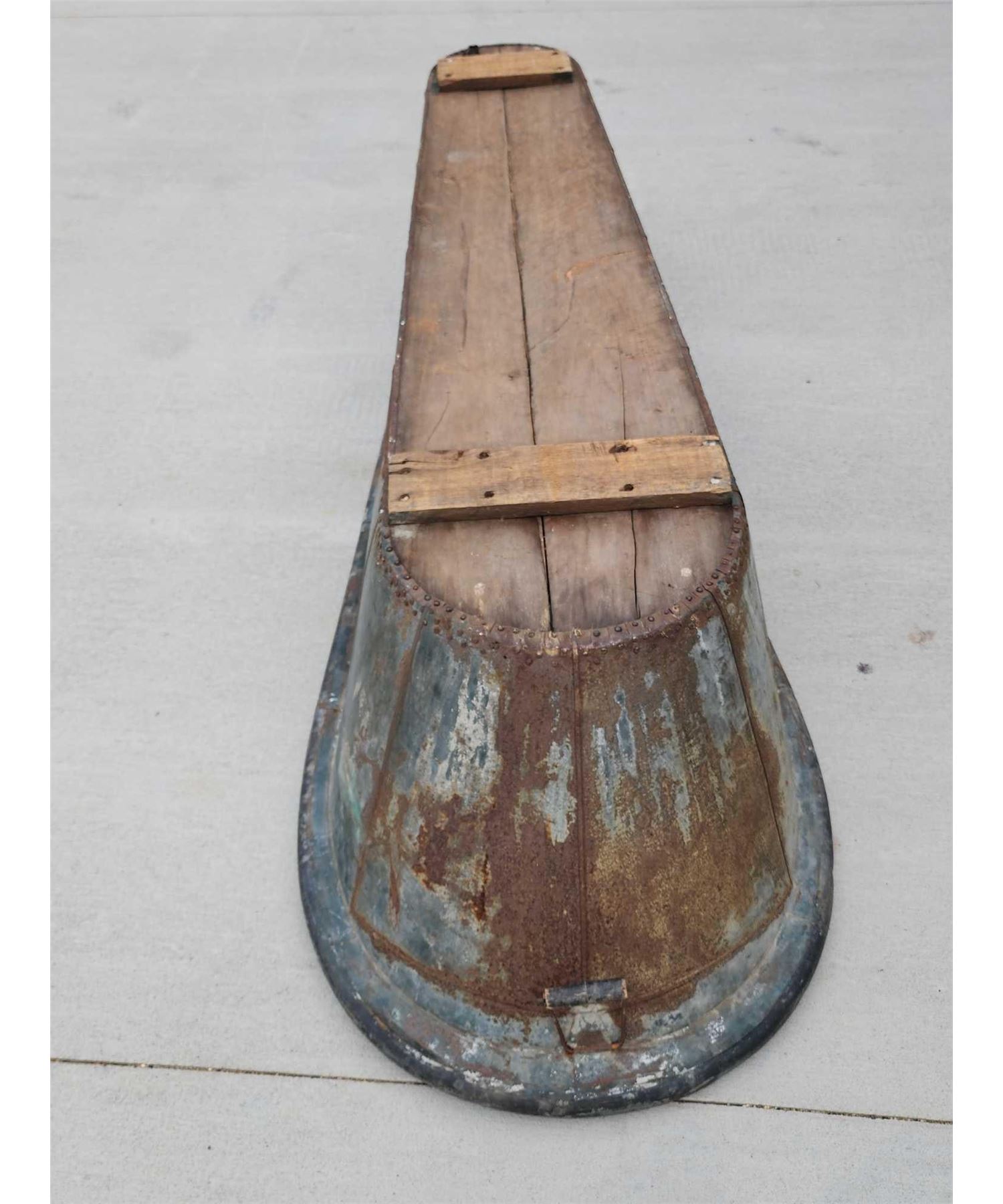 73.39 Constructed from Zinc with a wood bottom complete with what appears to be the original drain plug with a handle on each end awesome authentic piece about 80" long x 14" wide at the narrow end 27" at the wide end x 19" tall