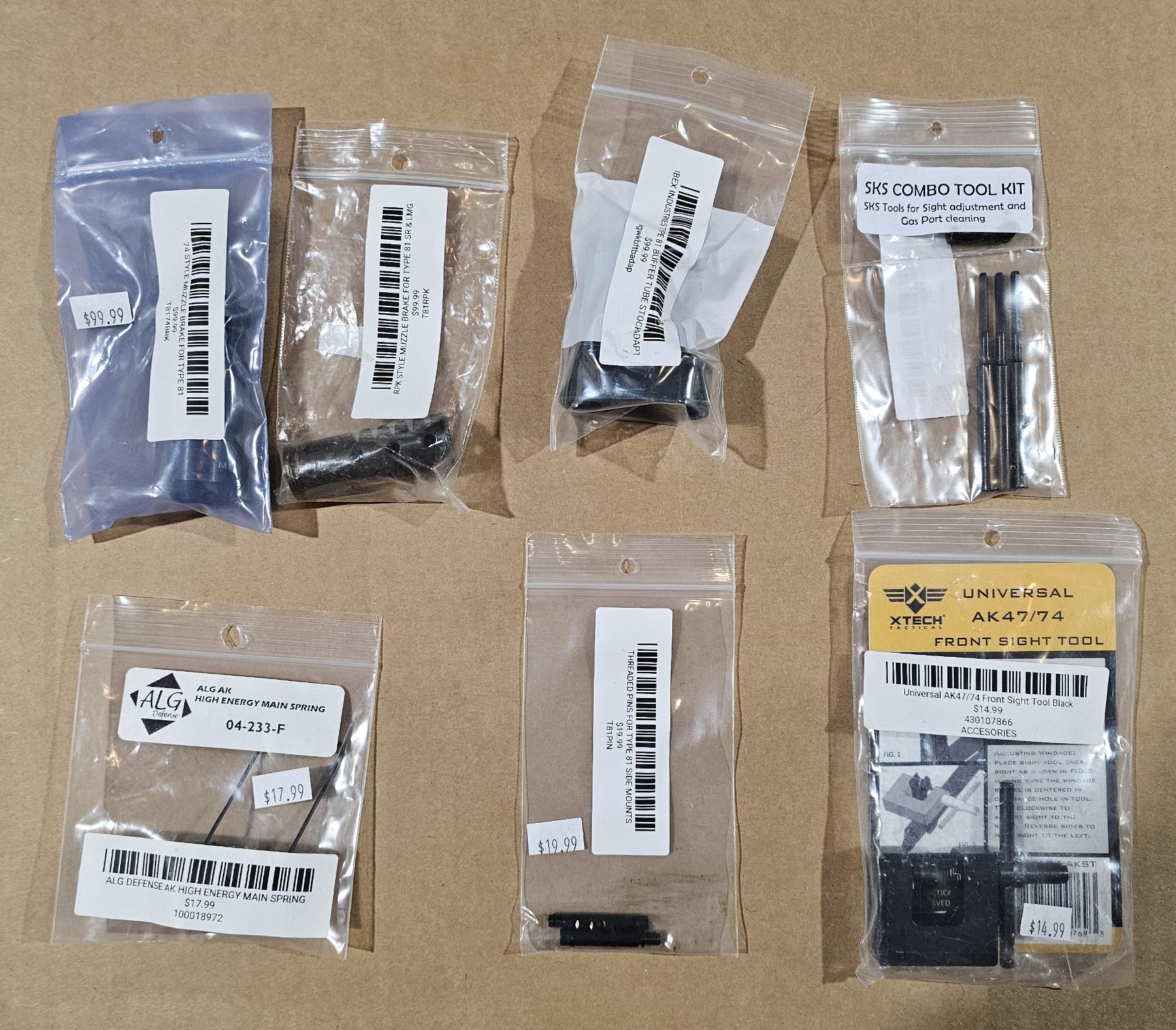 Ak 74 style muzzle brake, RPK style muzzle brake, IBEX Industries buffer tube adapter, front sight adjustment tool, threaded set of pins, ALG high energy AL mainspring.