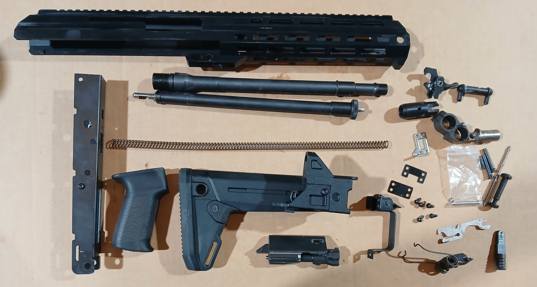 Includes receiver, Zhukov folding stock, handguard, 12'' barrel, gas system, pistol grip, bolt and carrier, muzzle brake, and various small parts.