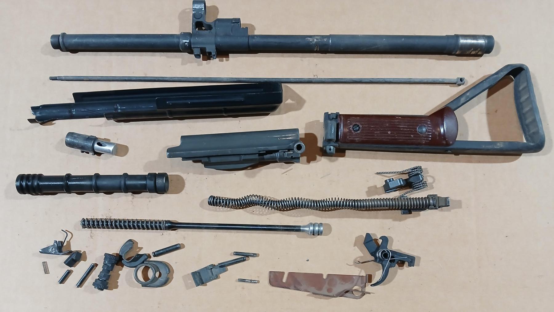 Includes folding stock, barrel, top cover, gas piston and spring, adjustable gas block, bolt and carrier, grenade launcher muzzle device, and various small parts.