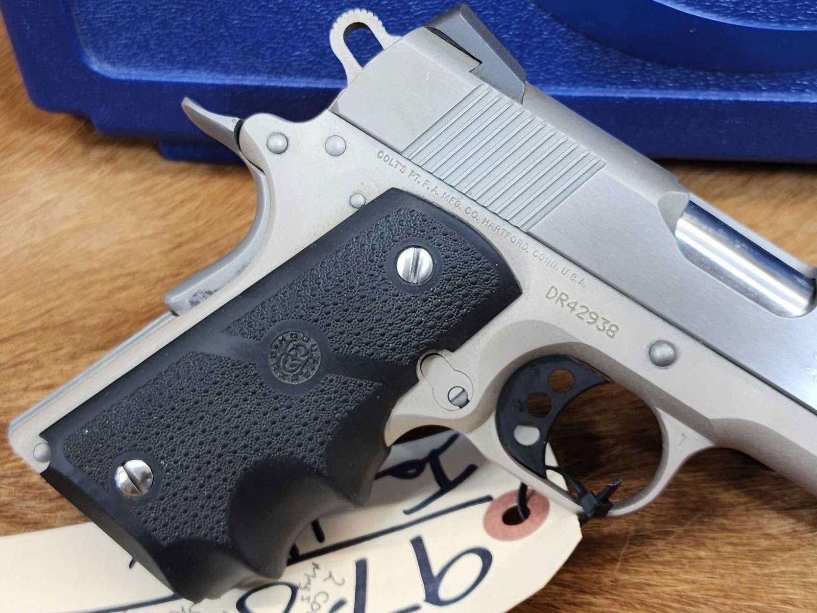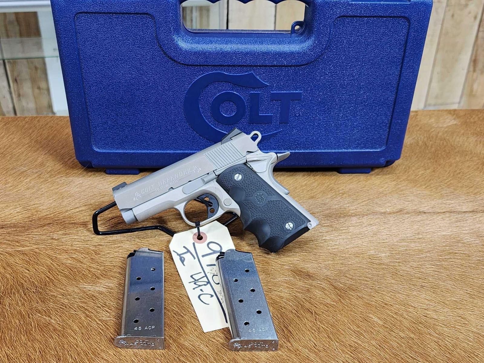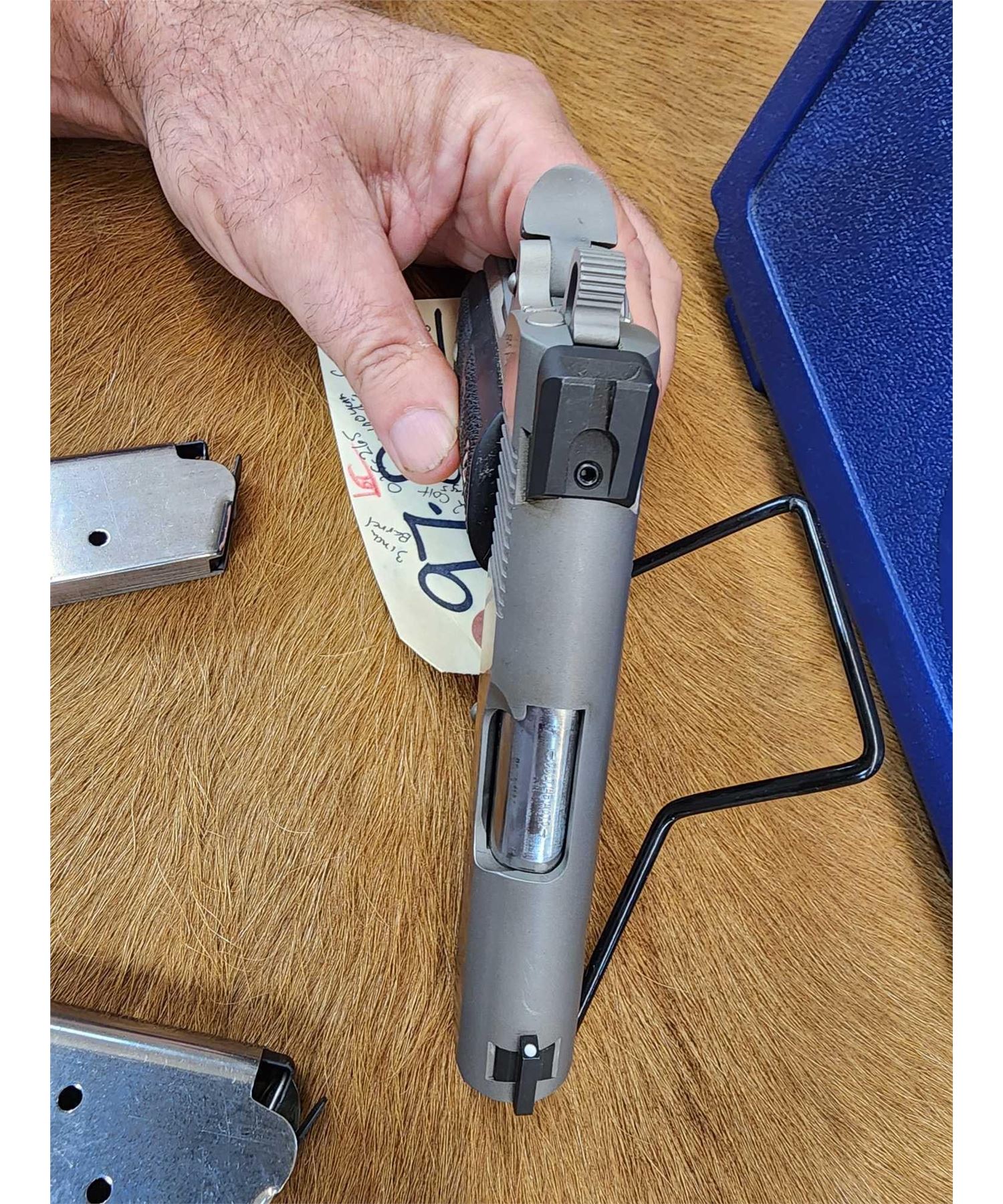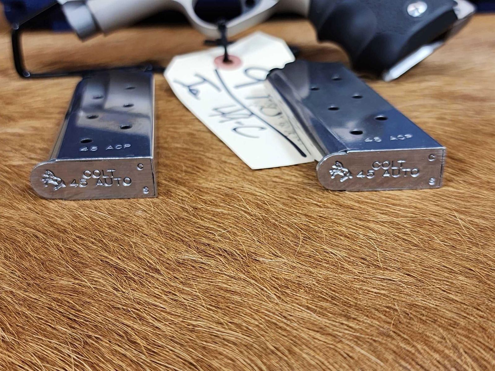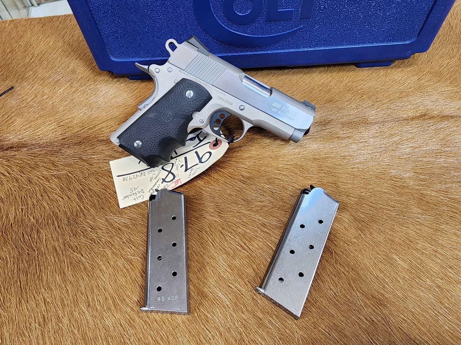 97.8 Nice clean gun stainless/nickel finish 3" barrel Shiny bore good rifling Novak sights with 2 Colt mags hard case SN DR42983